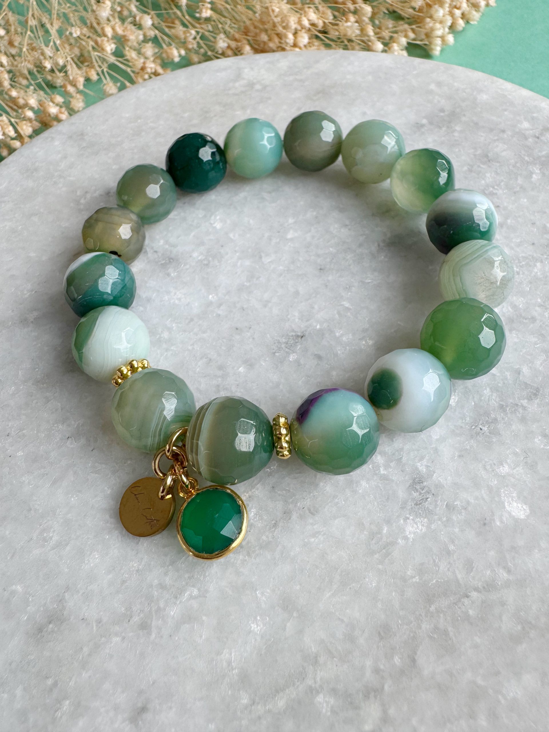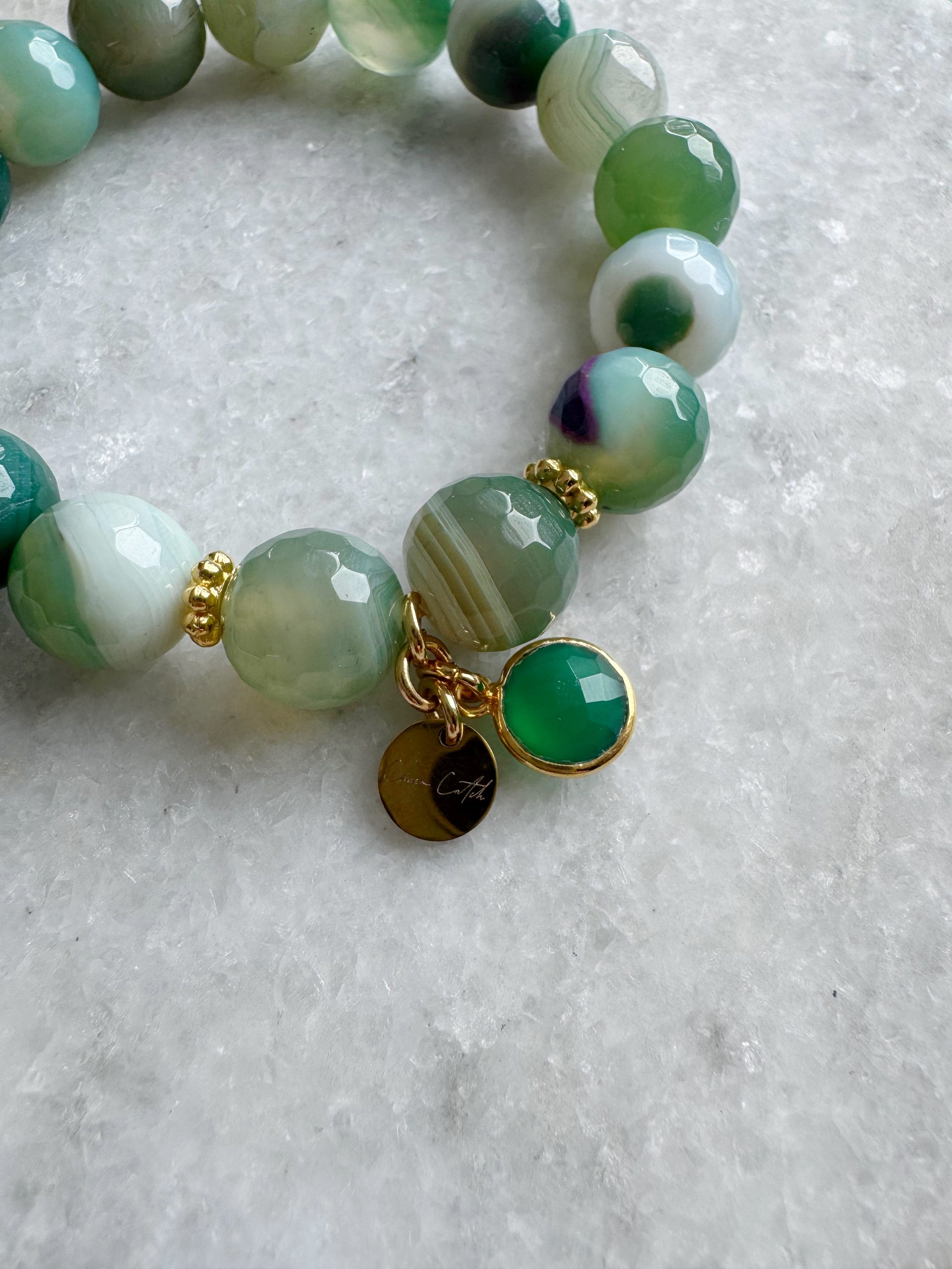 Grün in seiner ganzen Vielfältigkeit: „Green Aura“ bezaubert mit seinem Farbspektrum aus hellen und dunklen Grüntönen, Oliv und Moos, kombiniert mit Einschlüssen aus Creme und Violett. Die facettierten Perlen werden ergänzt durch zarte Goldelemente, der farblich passende Anhänger aus grünem Onyx fügt sich perfekt ein.