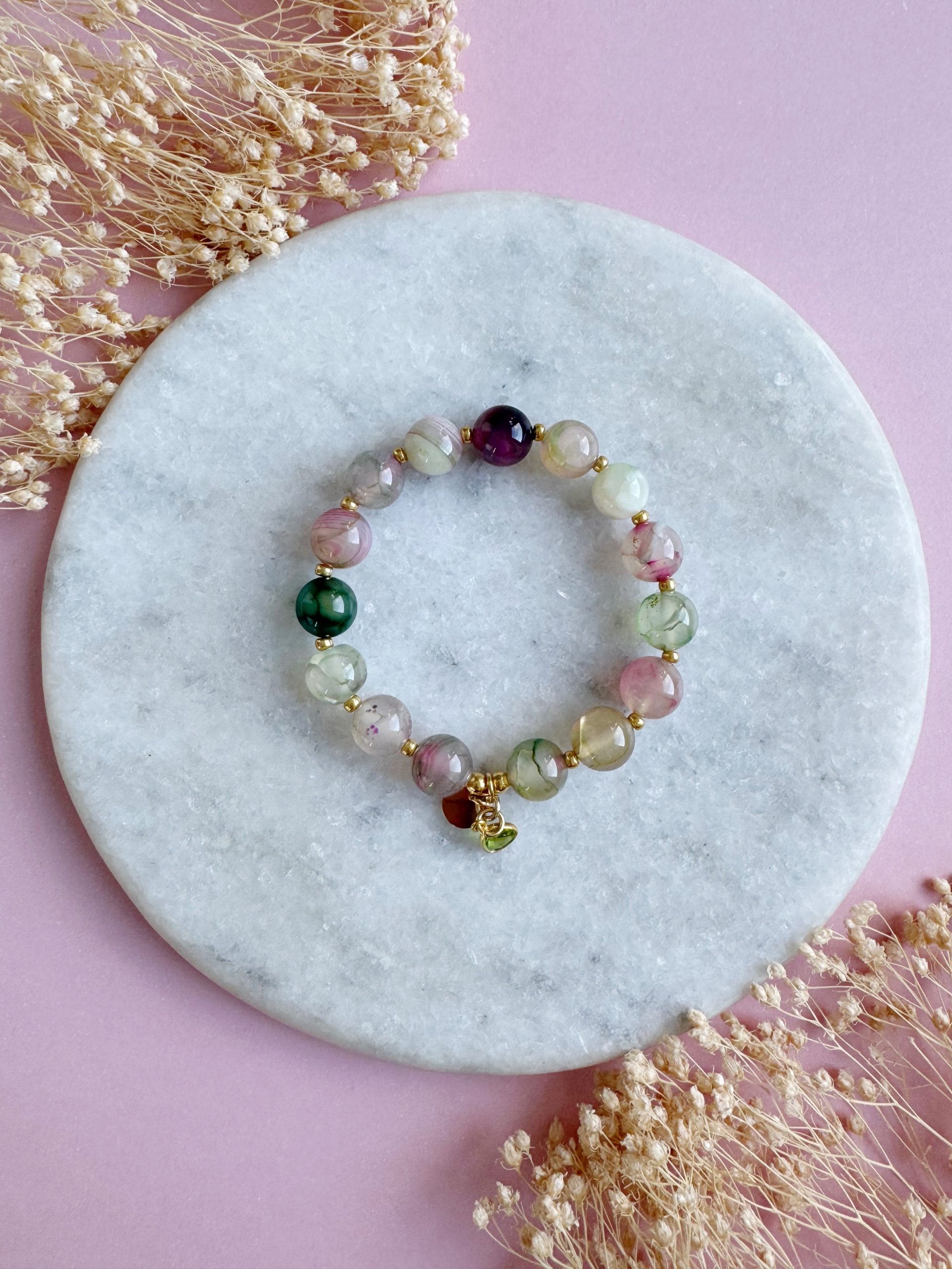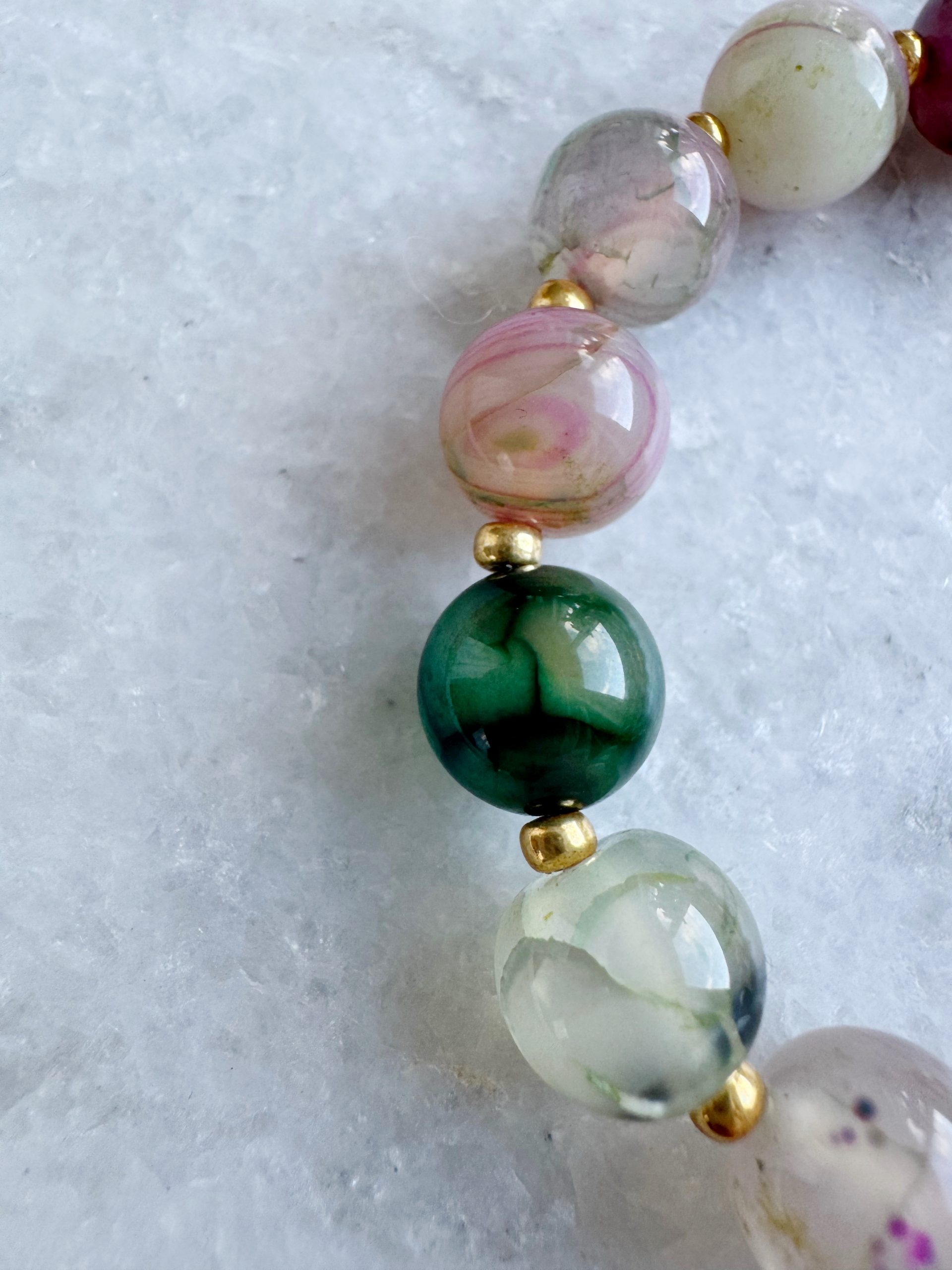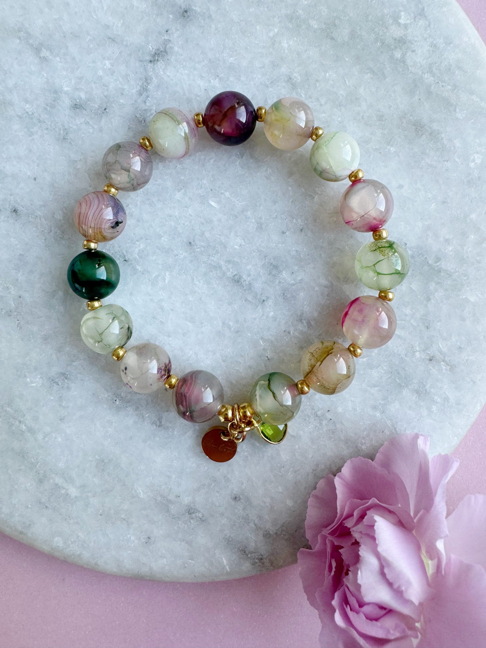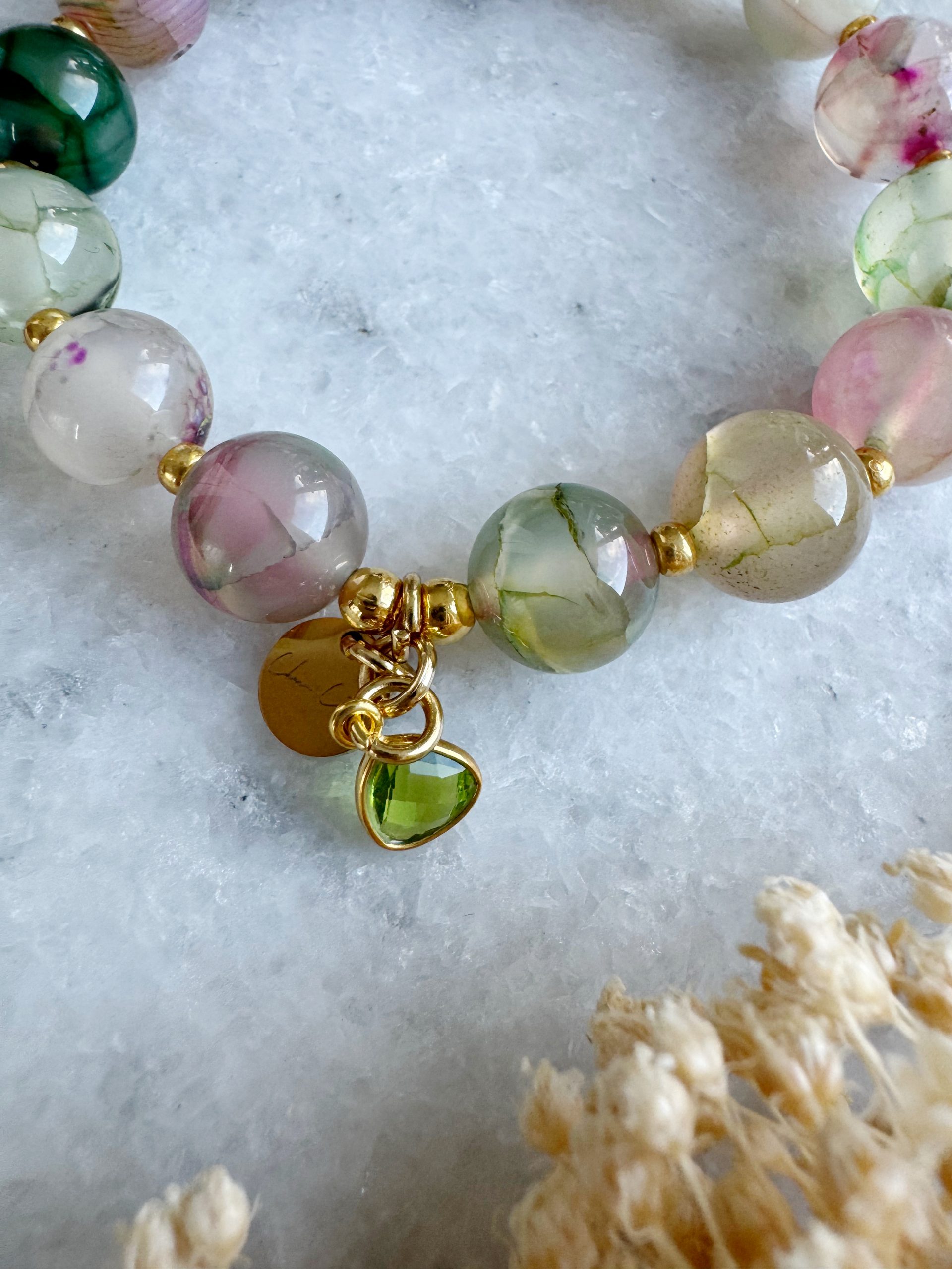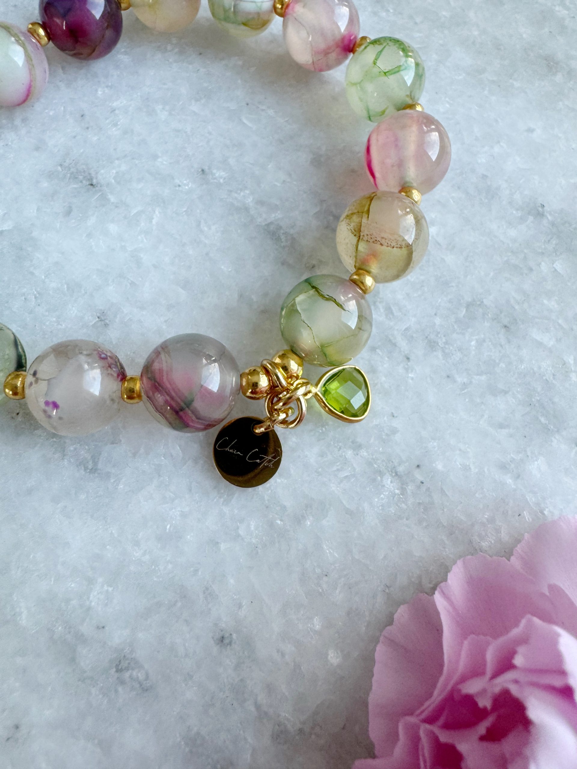 Die schönen Grün-Rosé-Lila-Achatperlen mit ihrer auffälligen Maserung werden ergänzt mit zarten Gold-Details und einem Peridot-Anhänger.