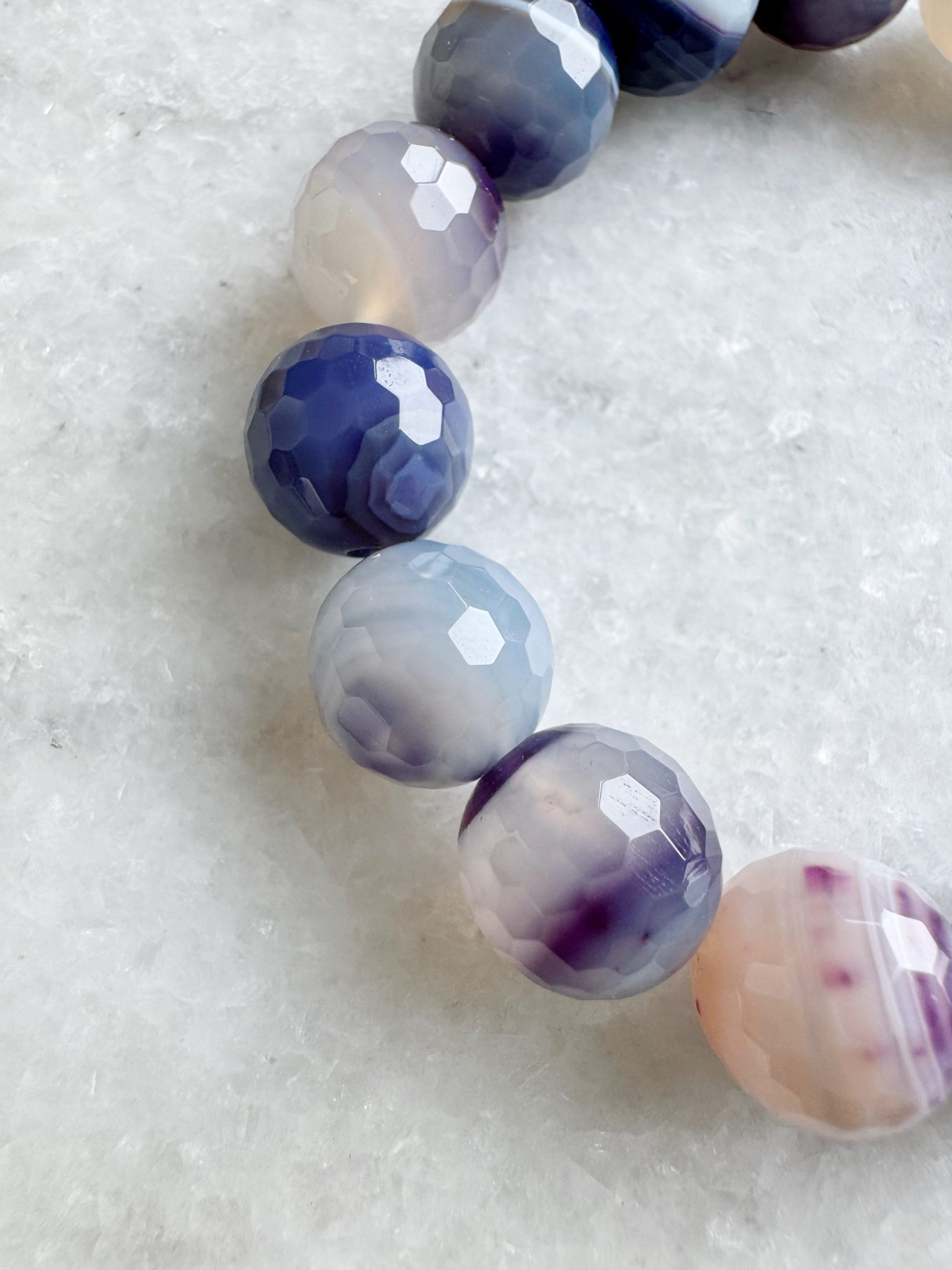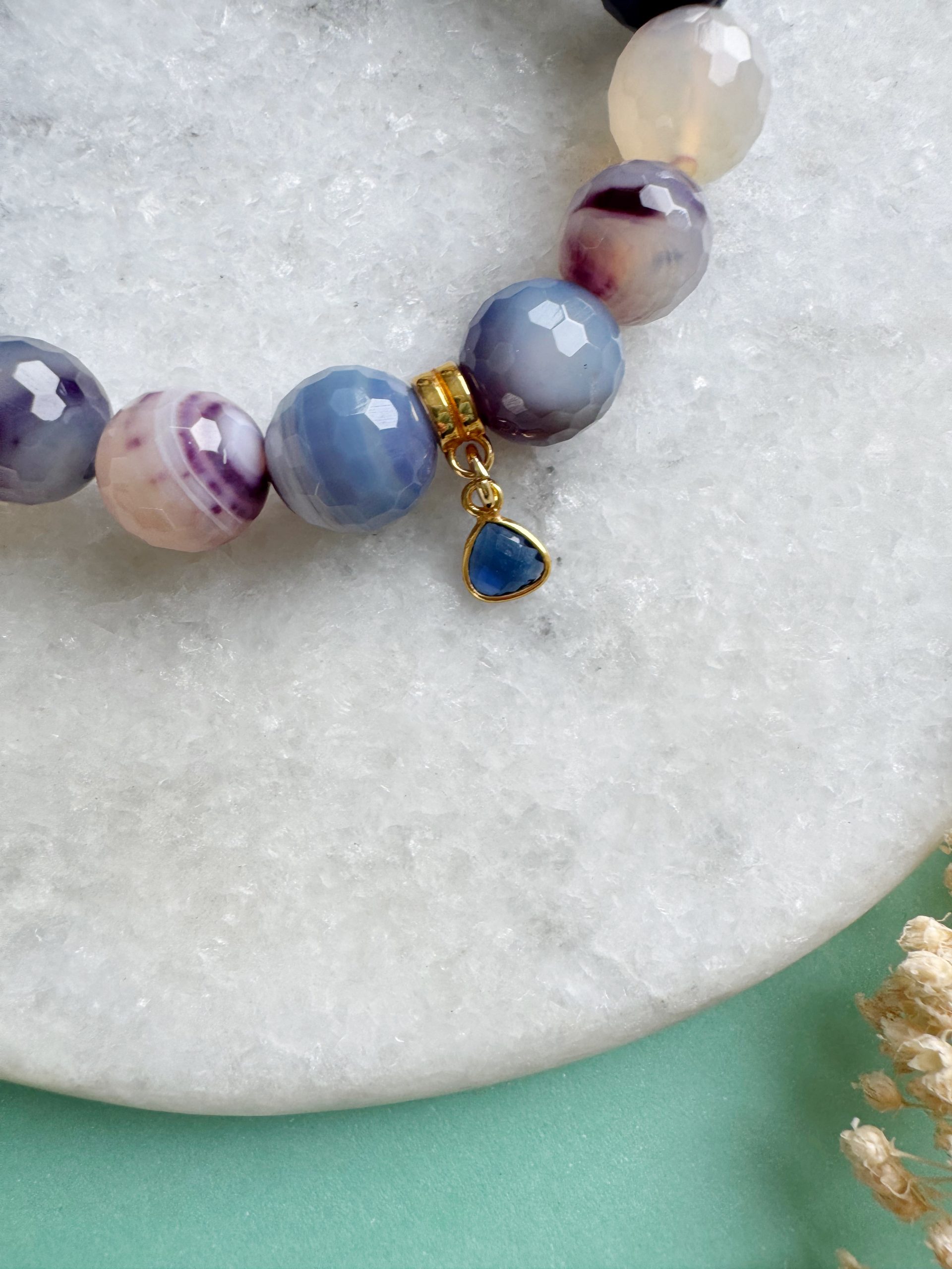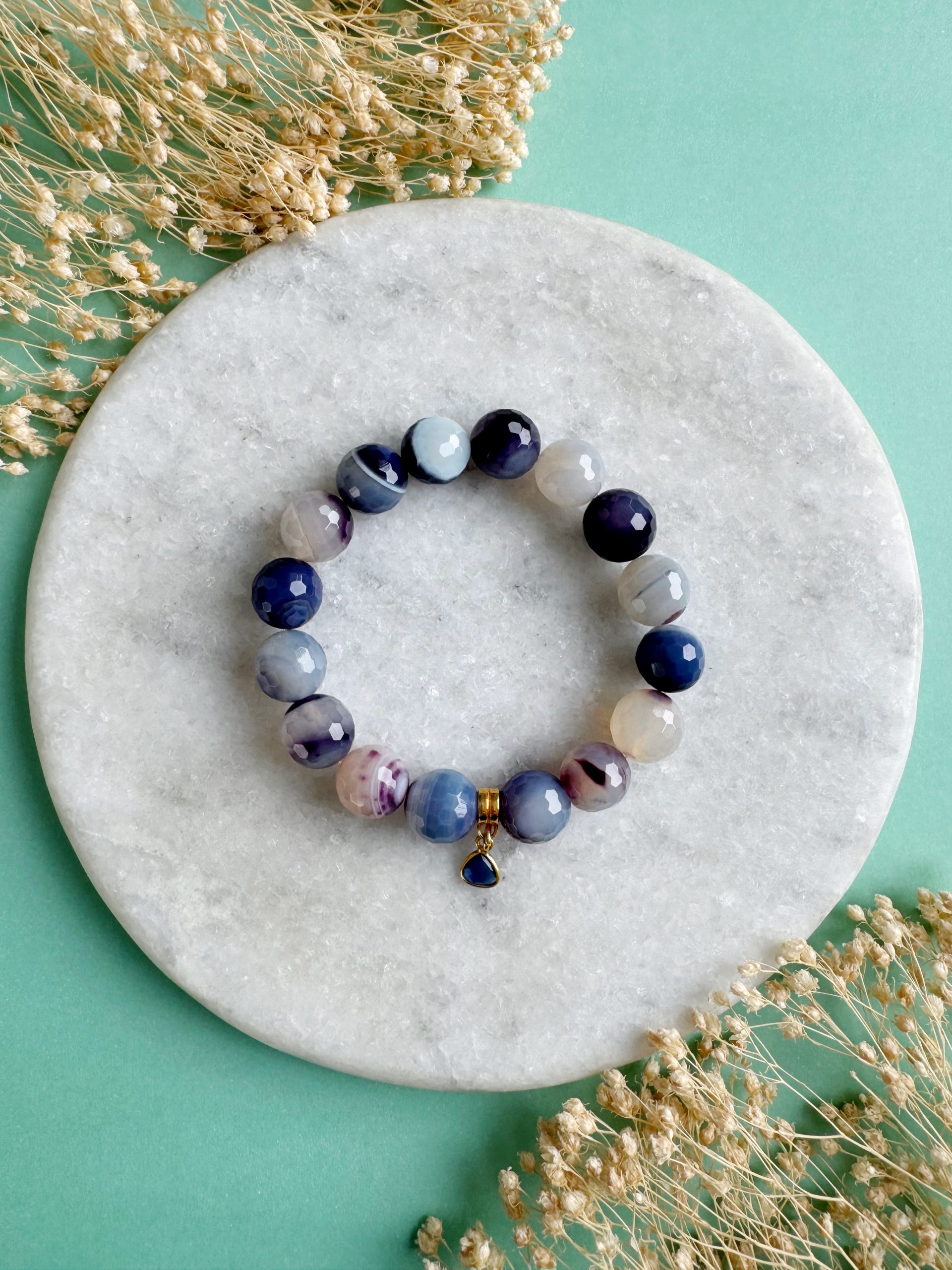 Dieses 14 mm facettierte Achat-Armband besticht durch eine ganz dunkle blau-lila Farbe.Das Armband kommt mit goldigen Details, die dem Schmuckstück Eleganz verleihen. Ein schlichtes Plättchen, rundet das elegante Design ab.