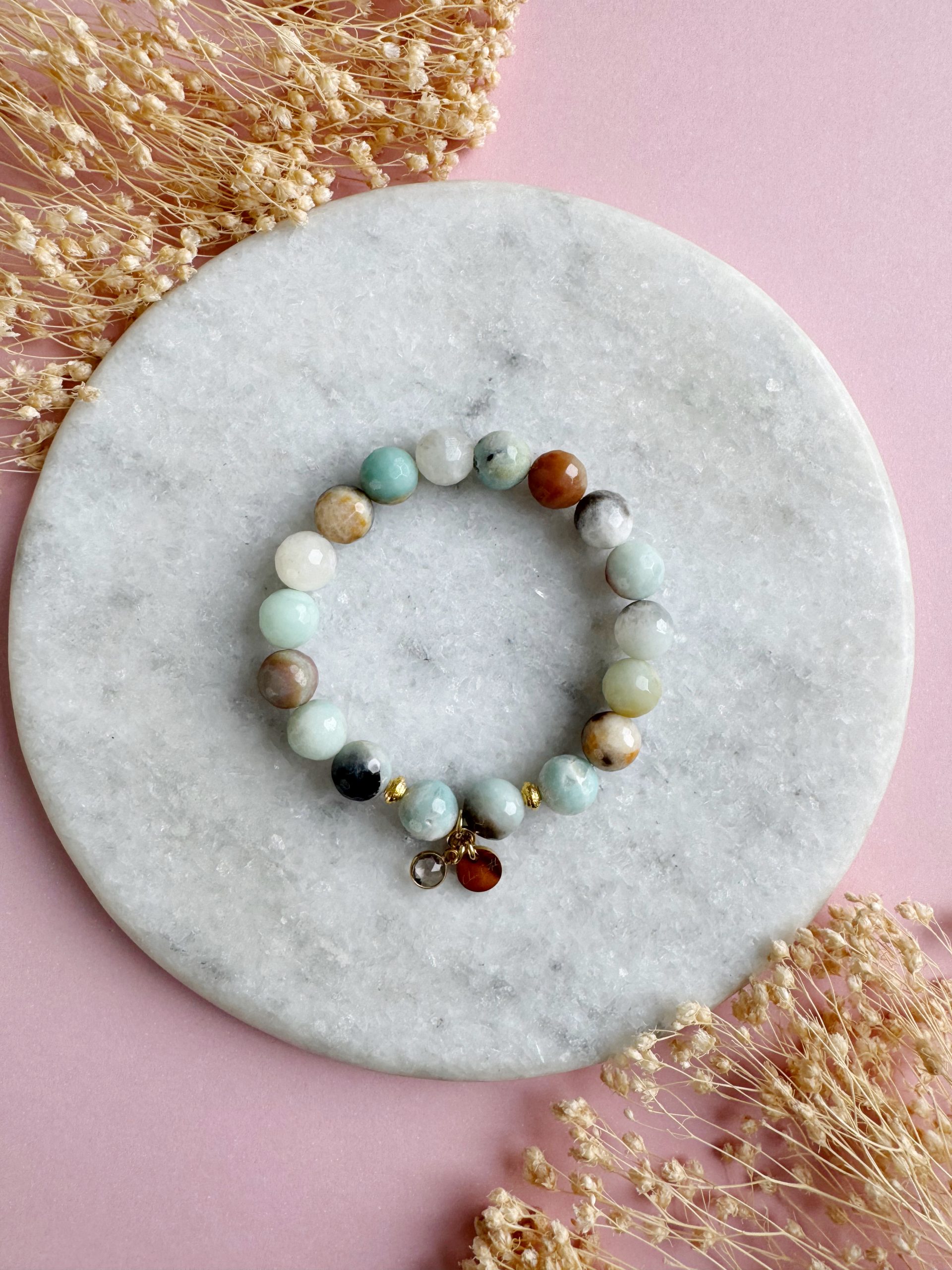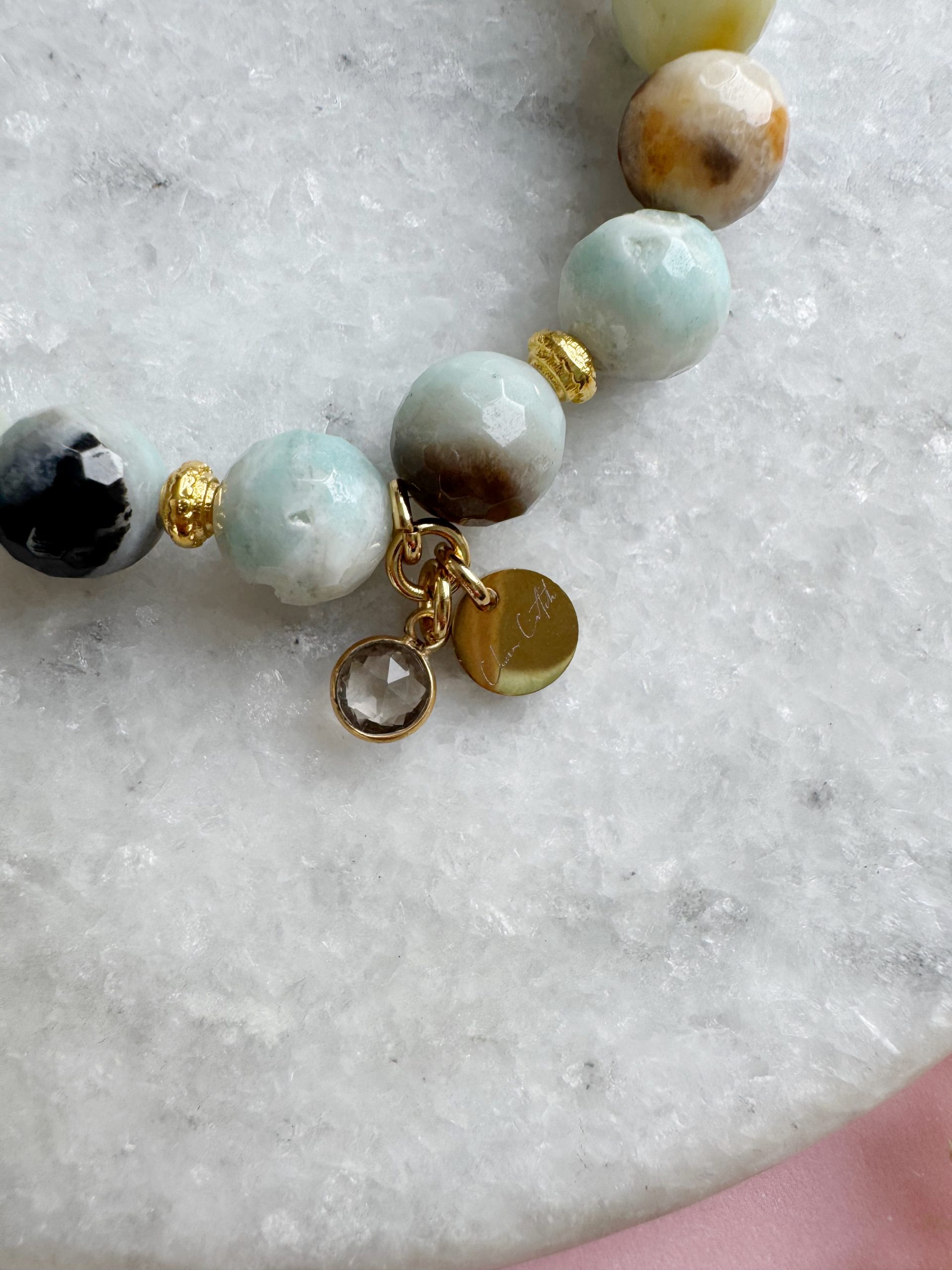 Der große Bruder des Charm Catch Bestsellers: Das Armband aus 10 mm Amazonit-Perlen in zarten Grün-Türkis-Tönen, unterbrochen von grau-braunen Farbtupfern. Passend dazu goldene Details und ein passender Anhänger aus Aqua-Chalcedon.
