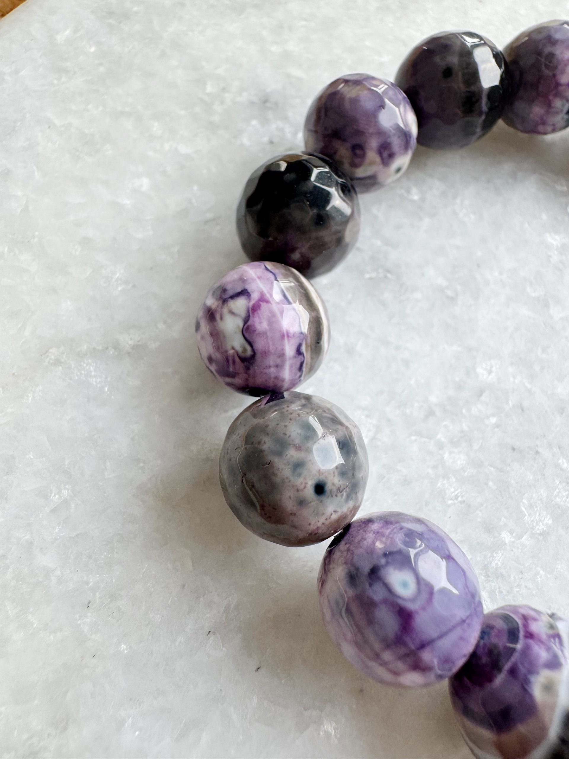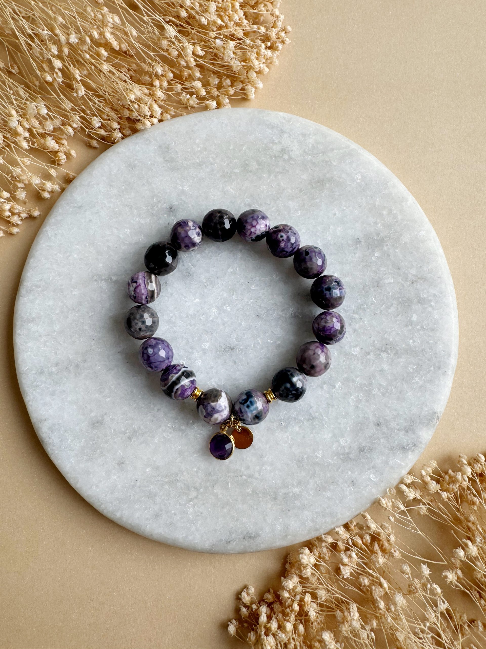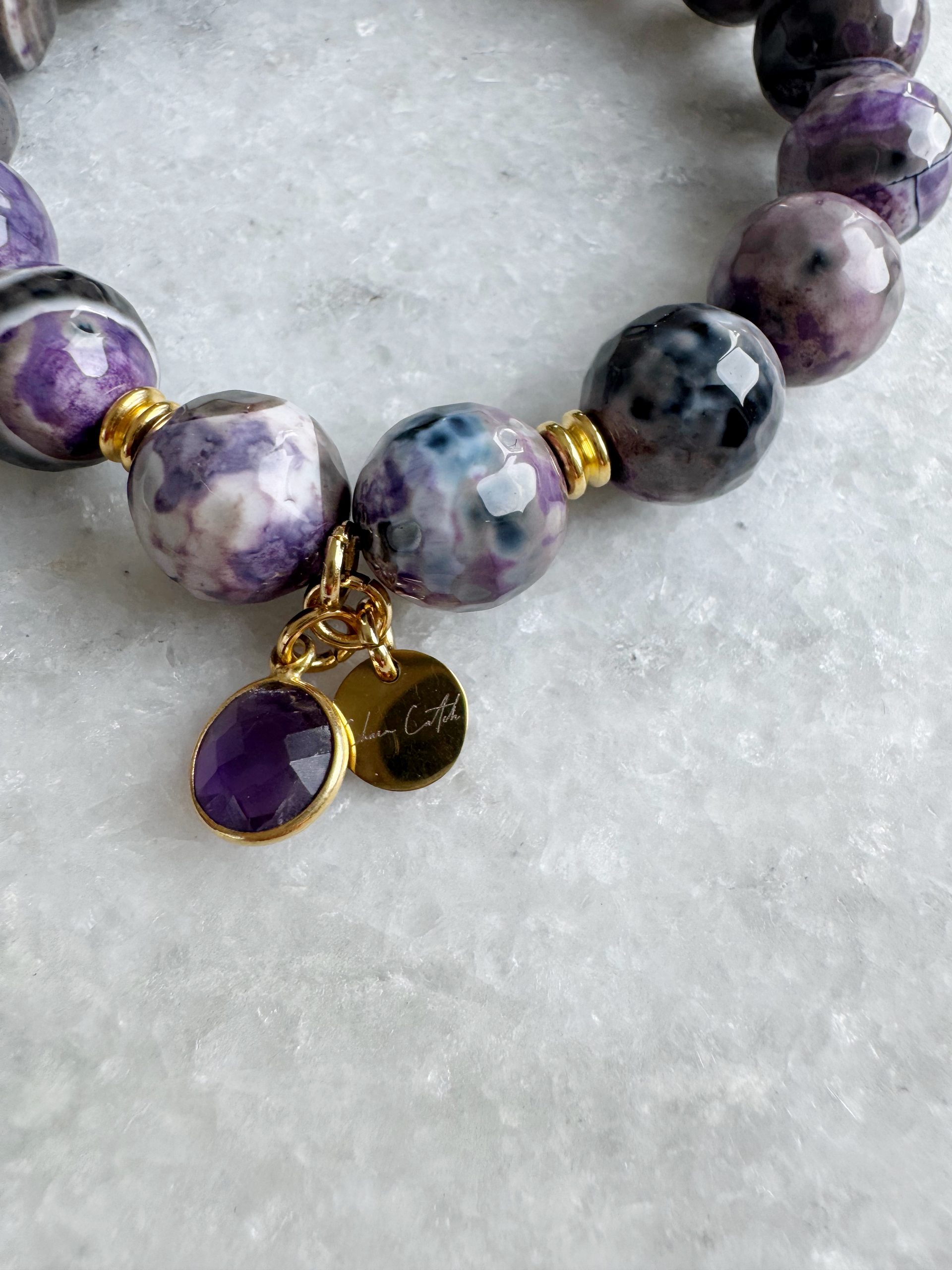 Violettes Farbenspiel der Extraklasse: Die facettierten Ametrin-Perlen erscheinen wie wilde Lavendelfelder in hellen und dunklen Violetttönen. In die feine Maserung mischen sich außerdem Einschlüsse von Beige, Grau und Taubenblau. Die Steine werden ergänzt durch filigrane Golddetails, einen goldenen Charm, sowie einen Anhänger aus Amethyst.