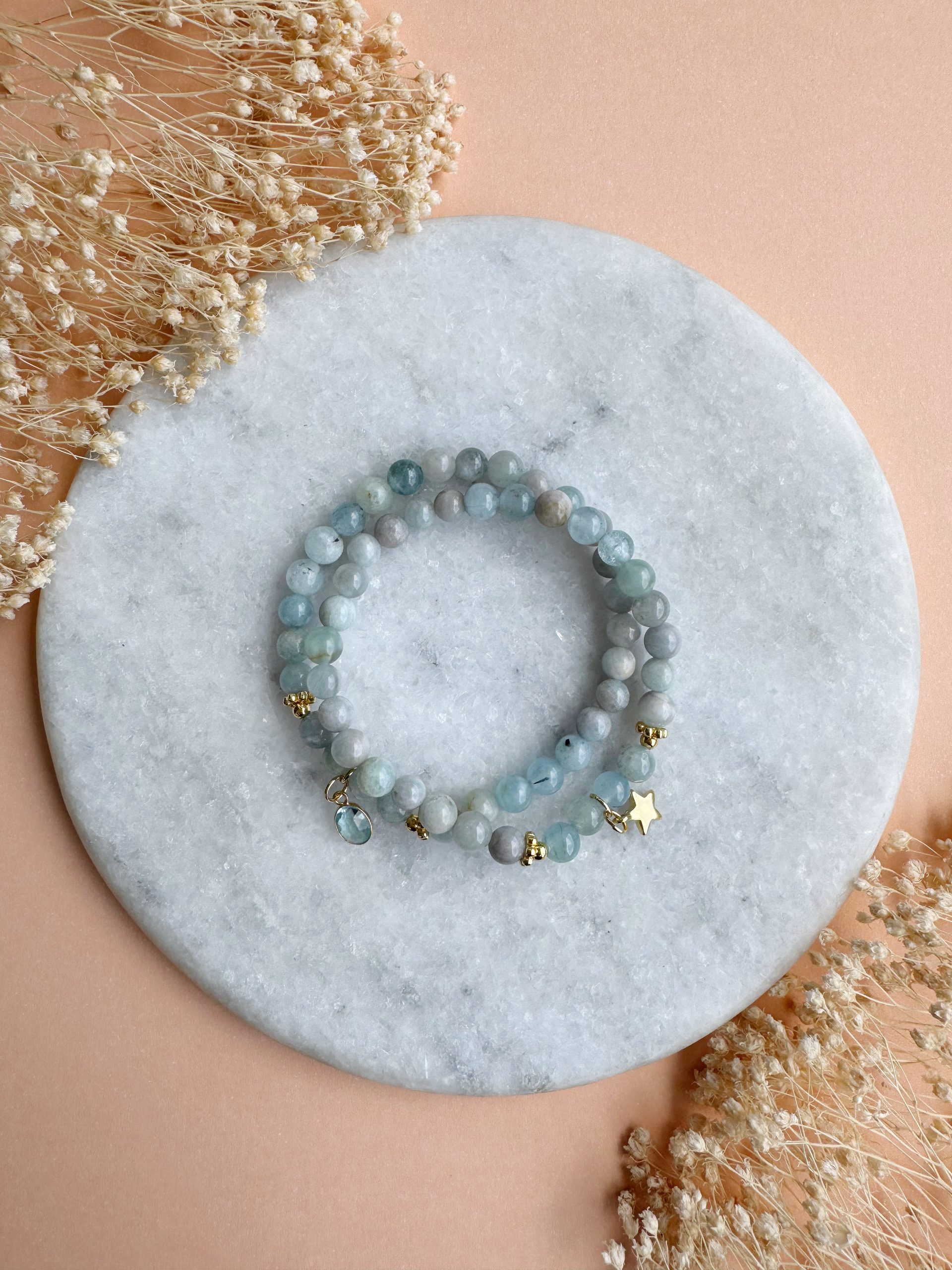 Ein bisschen Blau, ein bisschen Beige und jede Menge „Wow“ – der Aquamarin ist unser Neuzugang bei Charm Catch und verzaubert mit seinen pastelligen Blautönen. Übersetzt bedeutet Aquamarin so viel wie „Meerwasser“ – und diesem Namen macht sein schillerndes Farbspektrum alle Ehre. Ein so hochwertiger Stein steht und wirkt für sich allein – für etwas Glamour sorgt ein Plättchen und ein Topas als Anhänger.