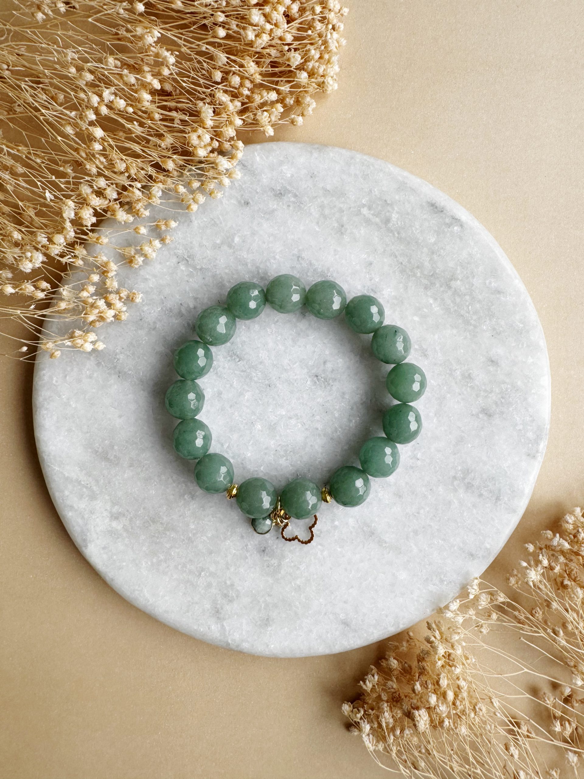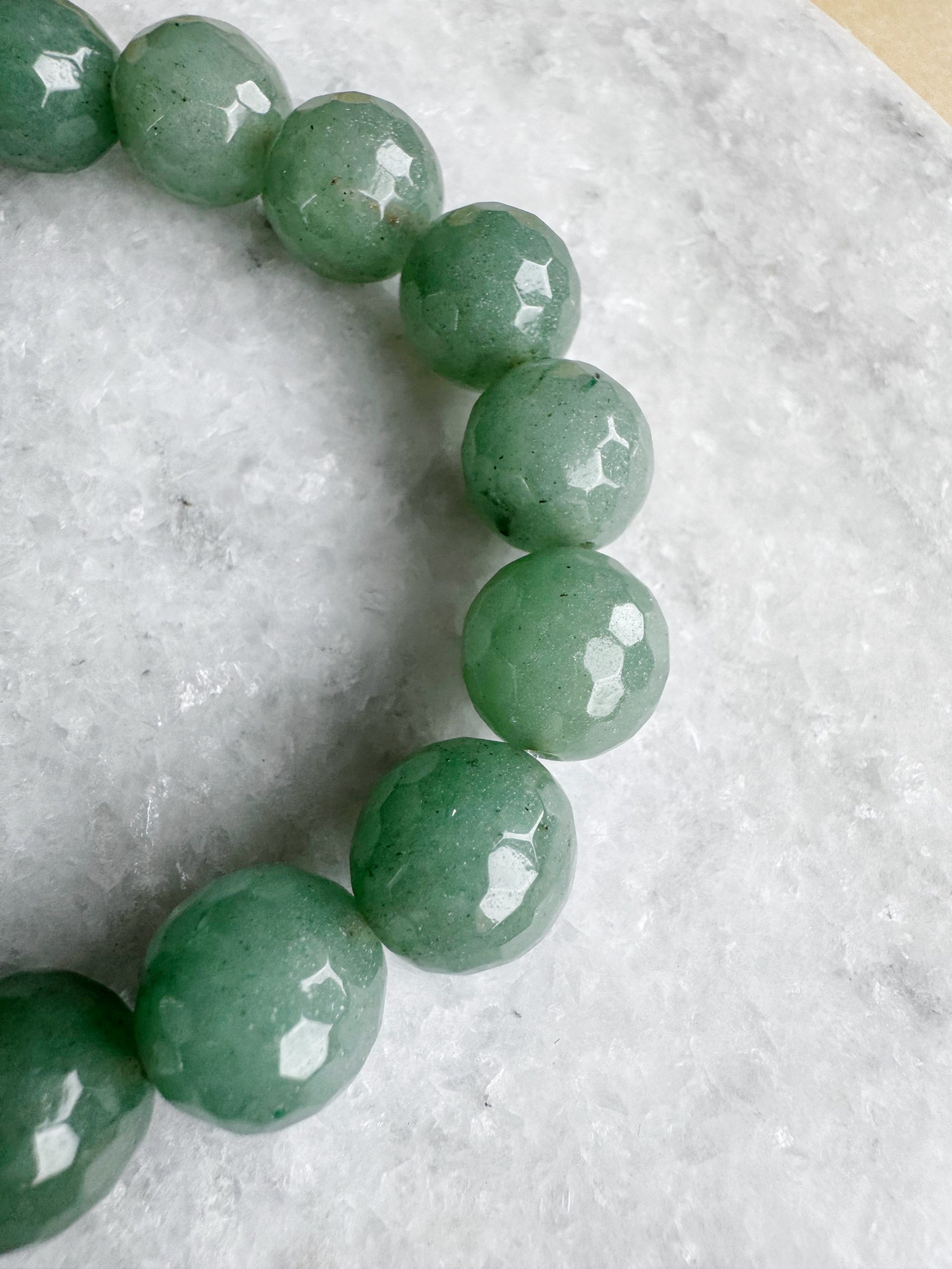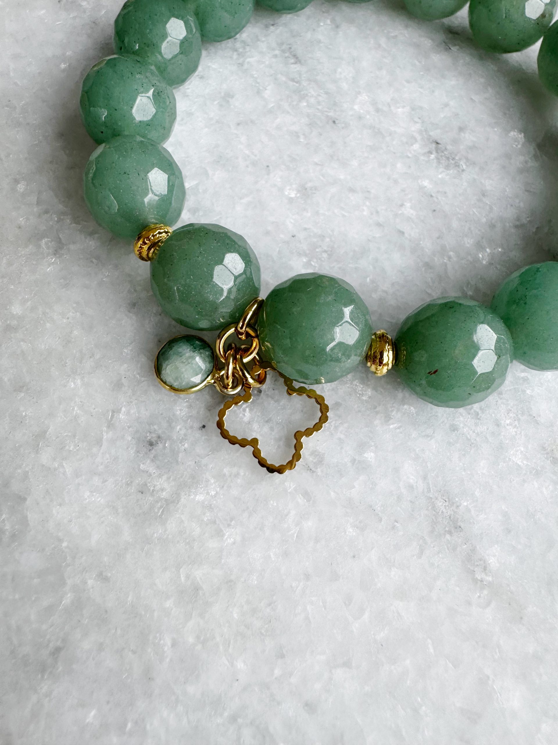Facettierter Aventurin in einem minzigen Grünton. Dazu passen goldene Details, ein Plättchen und vergoldete Anhänger aus rostfreiem Edelstahl.