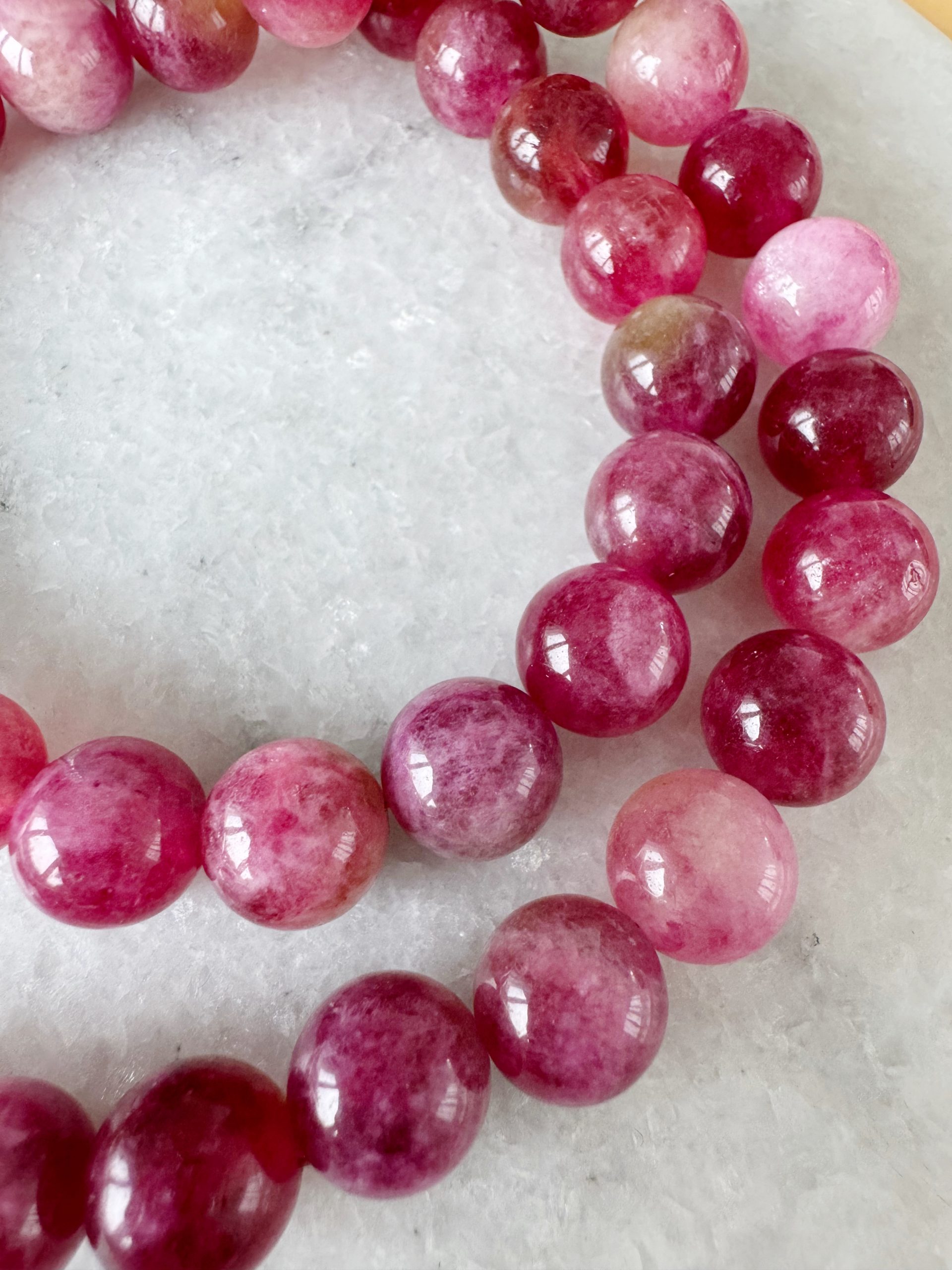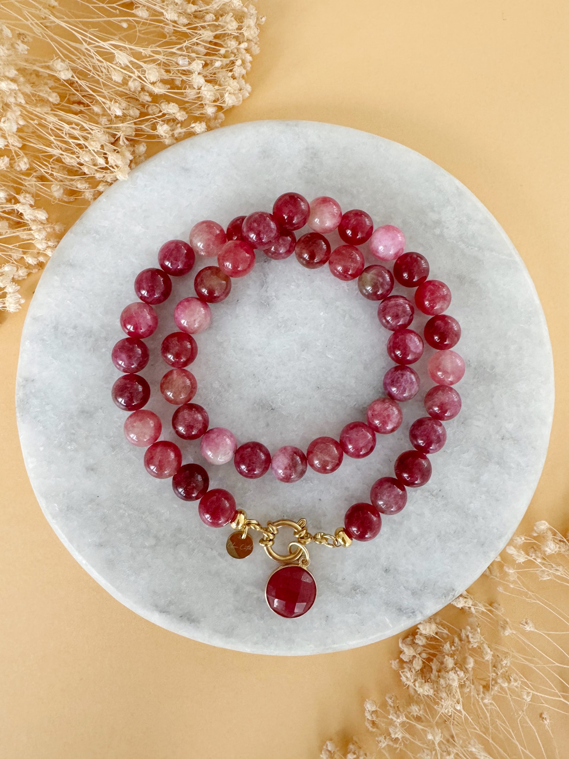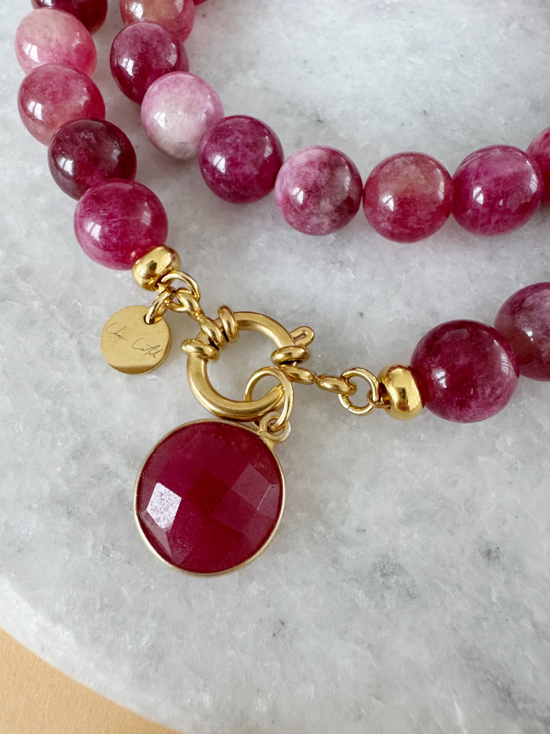 Cherry Pie? Magenta mit leichten Einschüssen von Grün, so kommen die 10mm Jade-Perlen und werden begleitet von goldigen Details, einem markanten Verschluss und einem Anhänger aus Rubin.