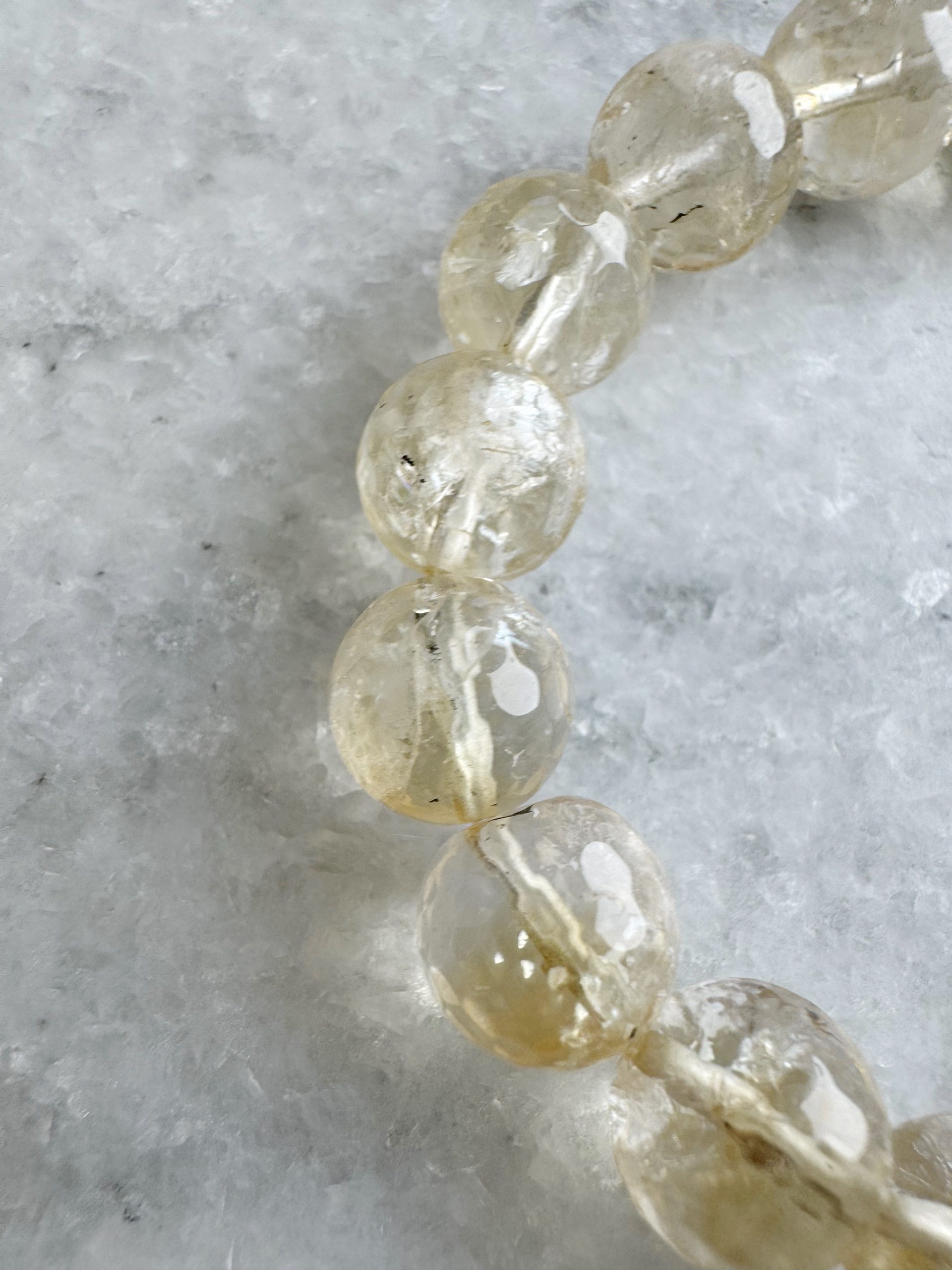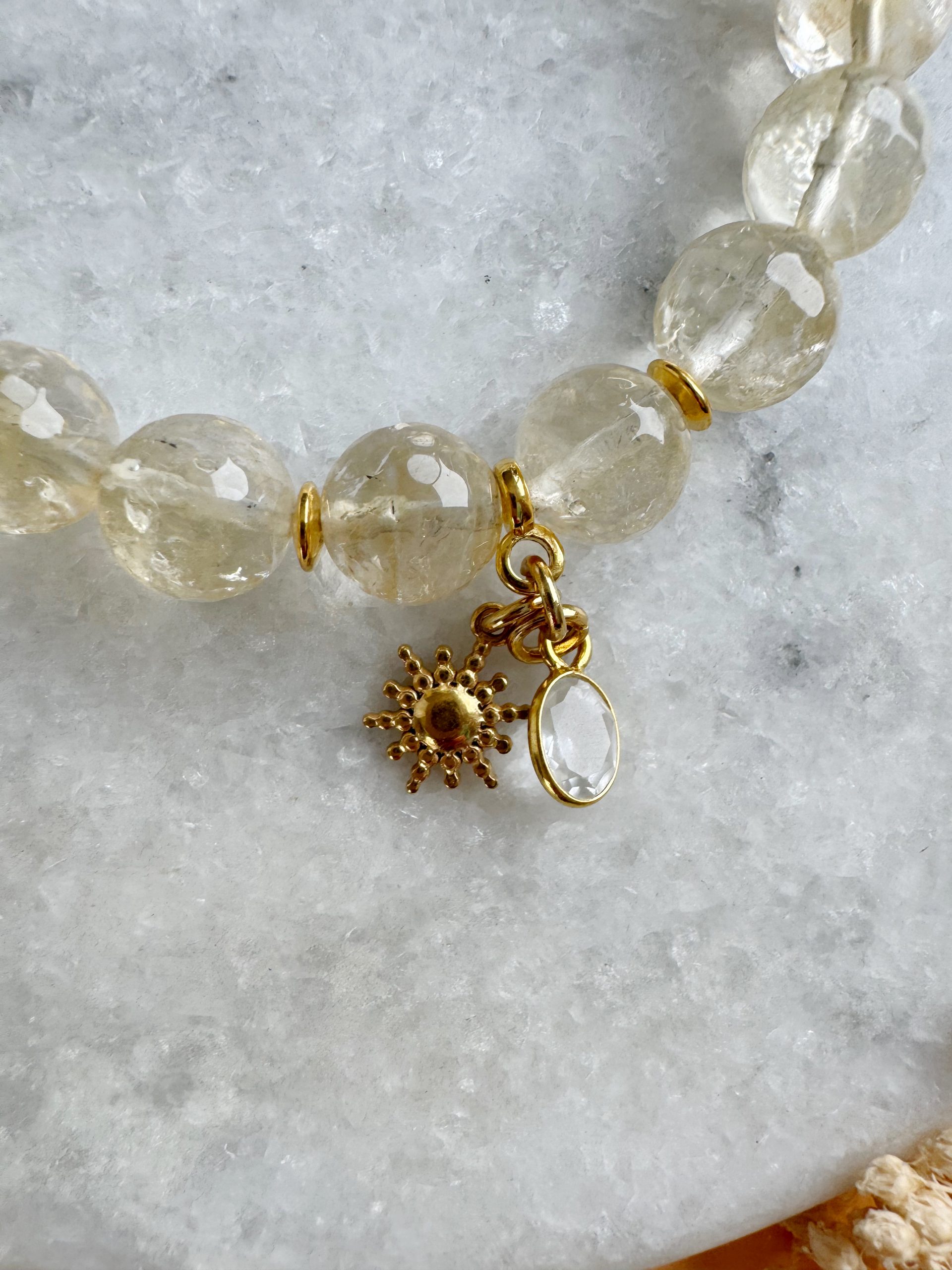 Wunderschöner Neuzugang: Dieser Citrin schimmert in so hellem Gelb, dass er fast wie flüssiges Gold erscheint. Seine fein facettierte Oberfläche und die auffällige Cracked-Struktur reflektieren das Sonnenlicht und lassen den Stein besonders intensiv funkeln. Ein farblich passender Anhänger aus Citrin und Metallteile aus rostfreiem Edelstahl (vergoldet) perfektionieren den strahlenden Look.