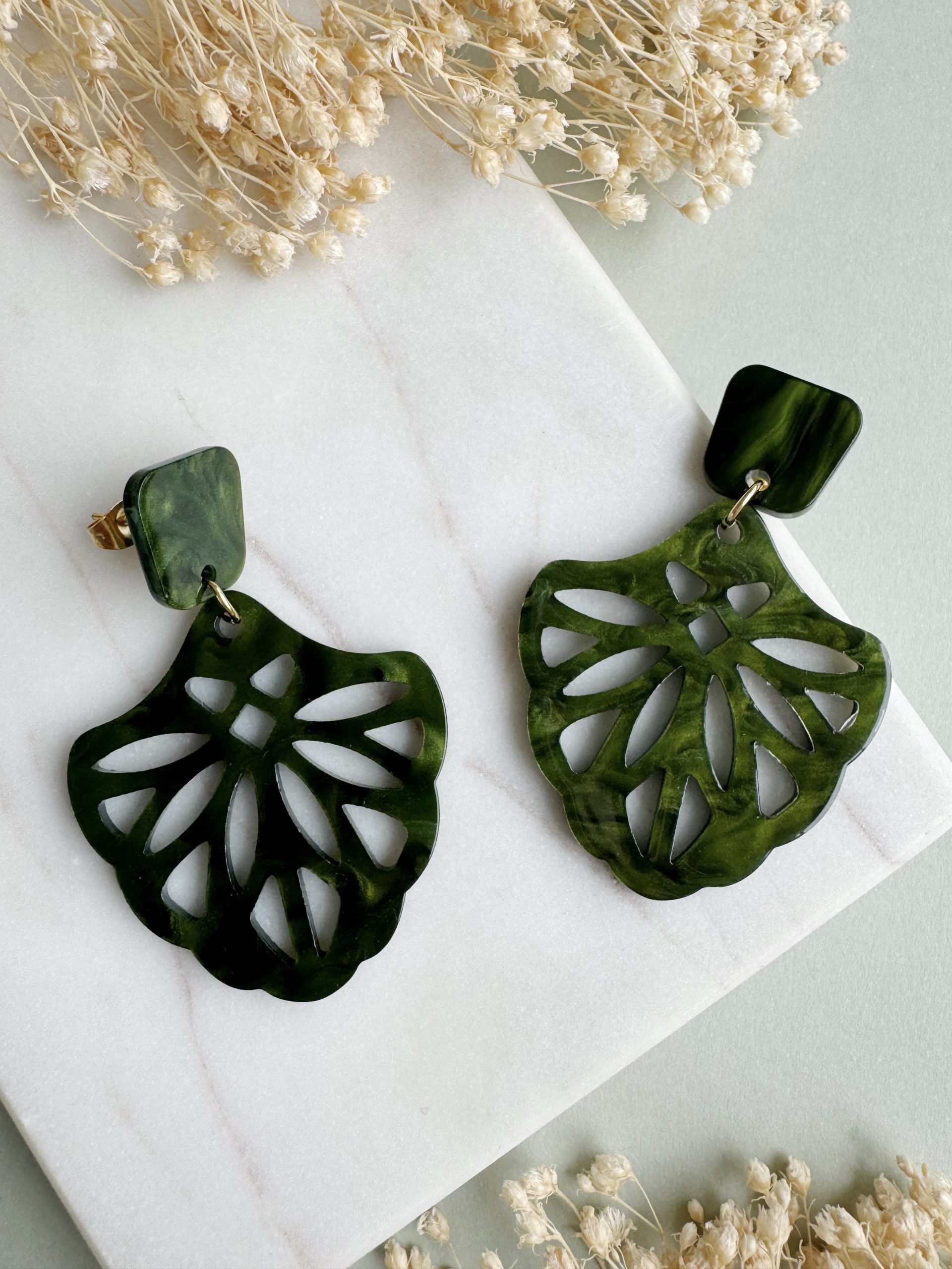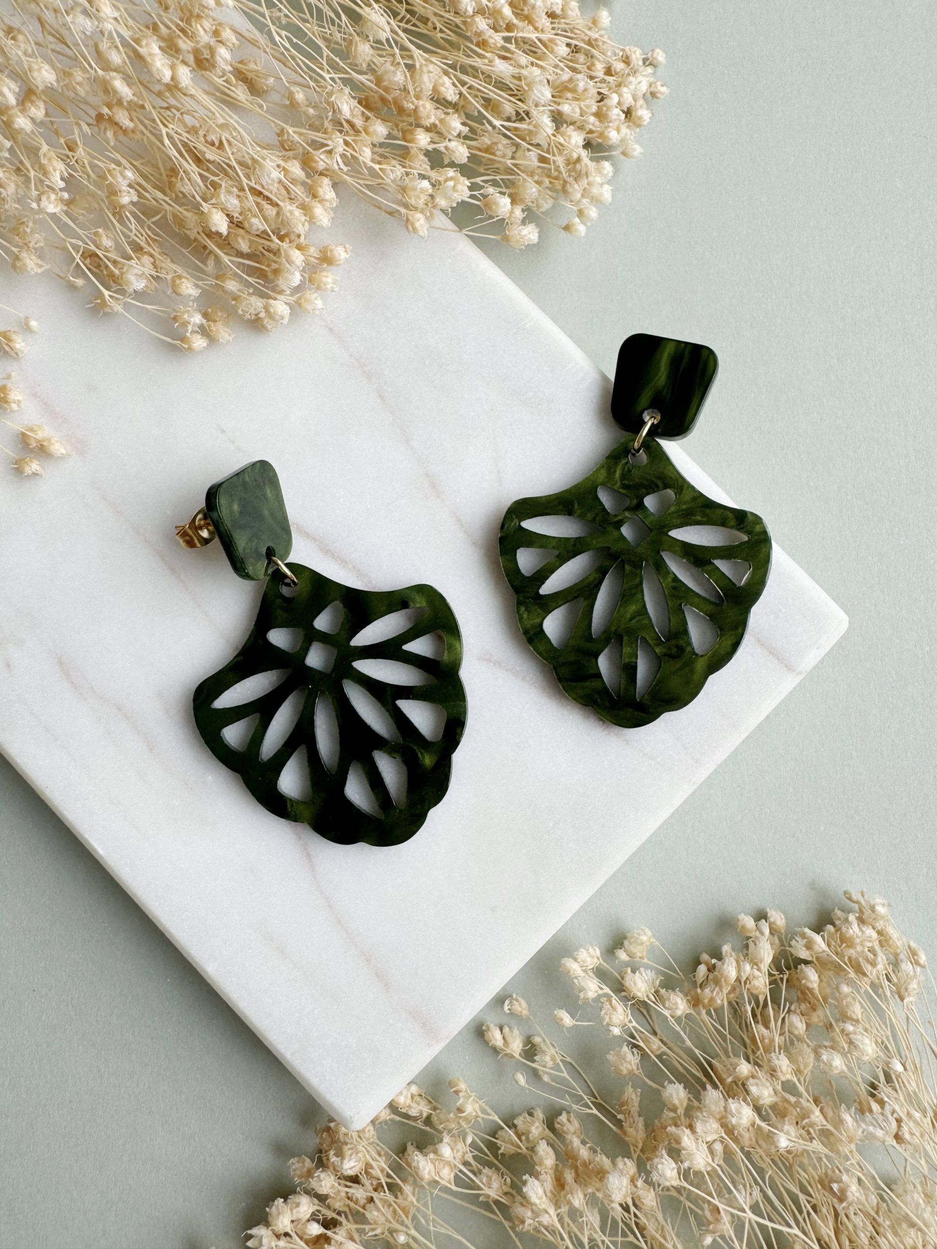 Die Farbkombination von „Greenwood“ knallt so richtig: dunkles Olivgrün am Ohrstecker und am Anhänger. Ein federleichter Hingucker aus Kunstharz, der dies Saison nicht fehlen darf.