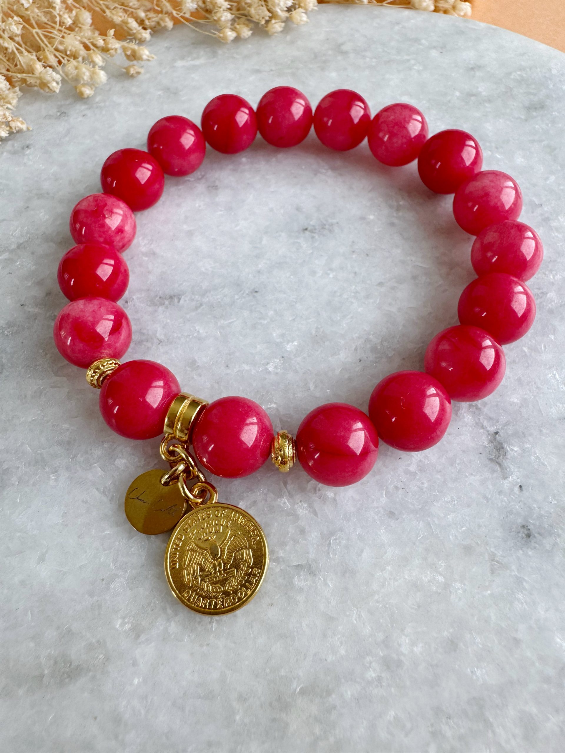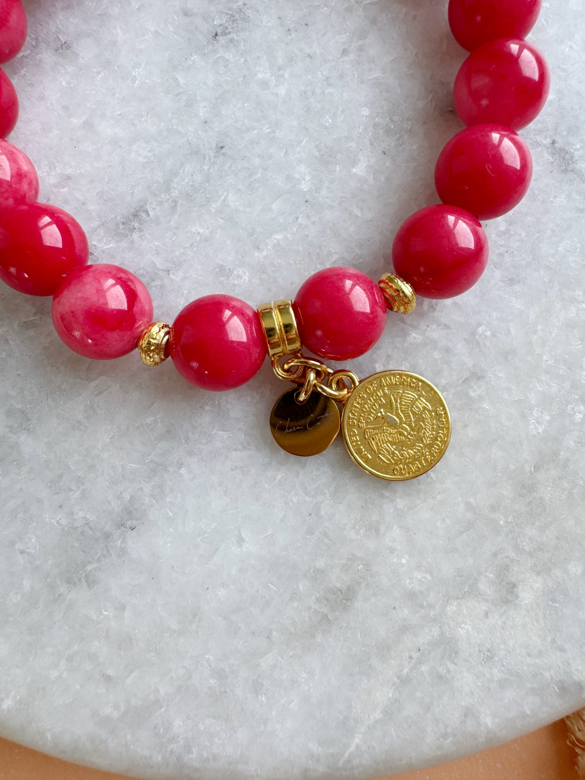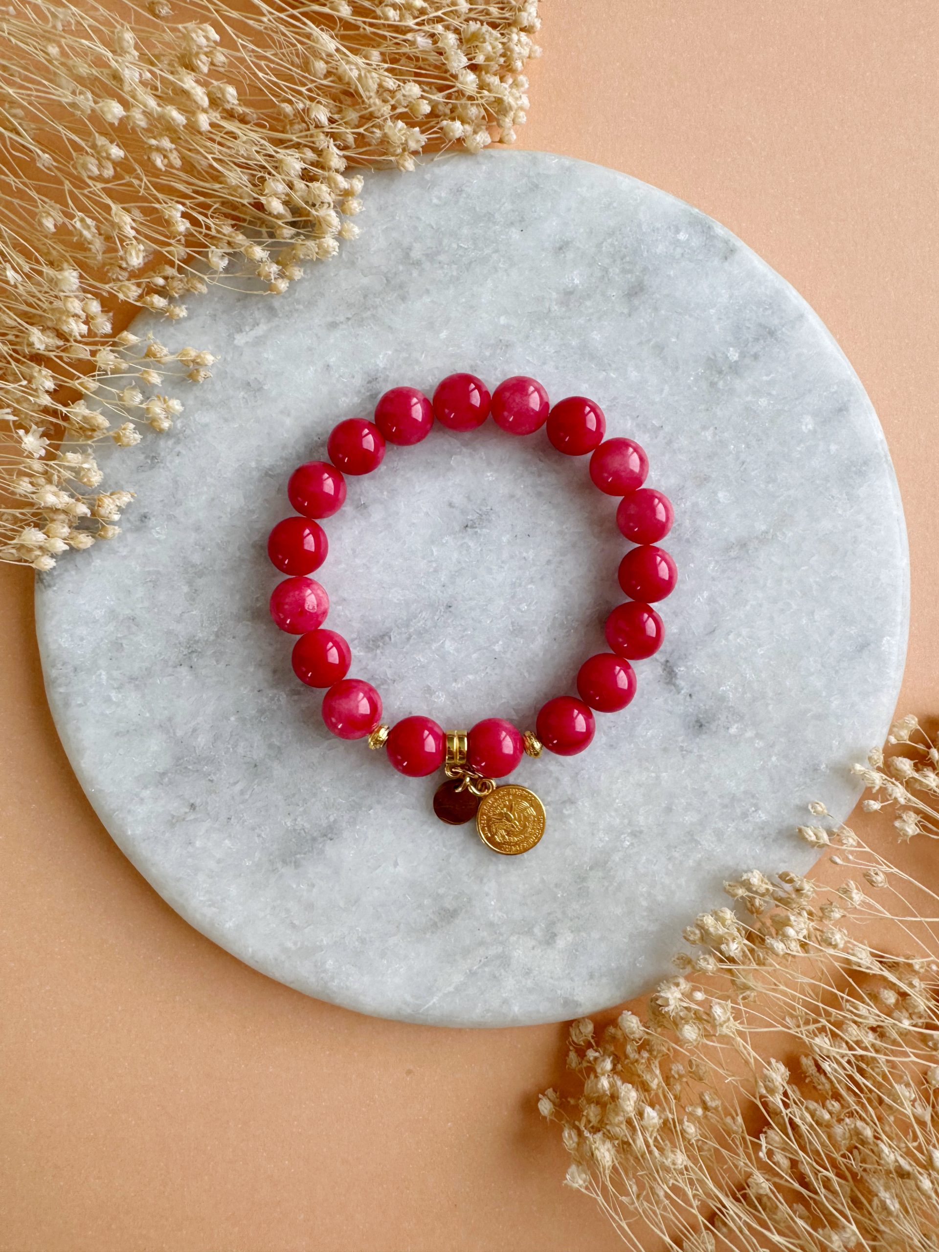 Knalliges Lieblingsteil für den effektvollen Auftritt: die Jadeperlen strahlen in intensivem Pink-Rot. Abgerundet wird der Look mit passenden Anhängern aus rostfreiem Edelstahl.