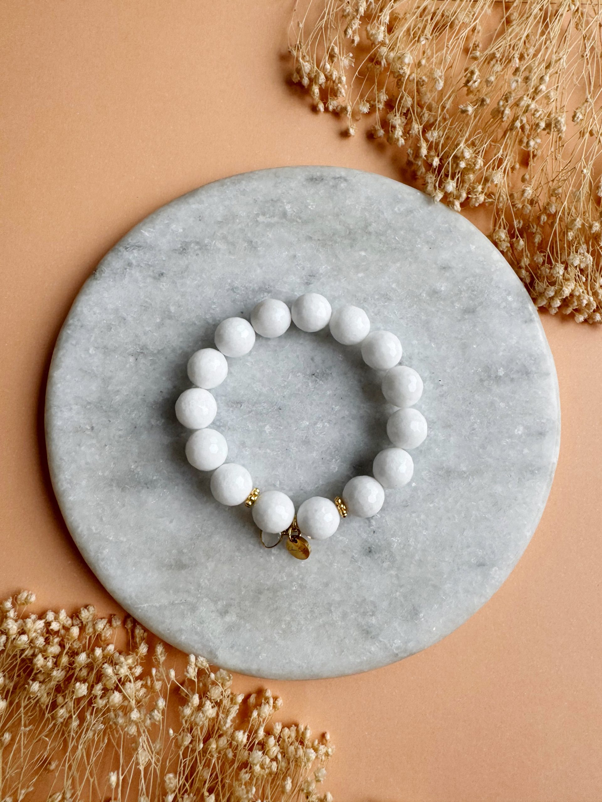 „Serenity“ strahlt pure Eleganz und Gelassenheit aus. Die facettierten, 12mm großen Jadeperlen funkeln in reinstem Weiß, warme Golddetails sorgen für den Sommer-Look. Ein farblich passender Anhänger aus Mondstein und komplettiert die Optik.