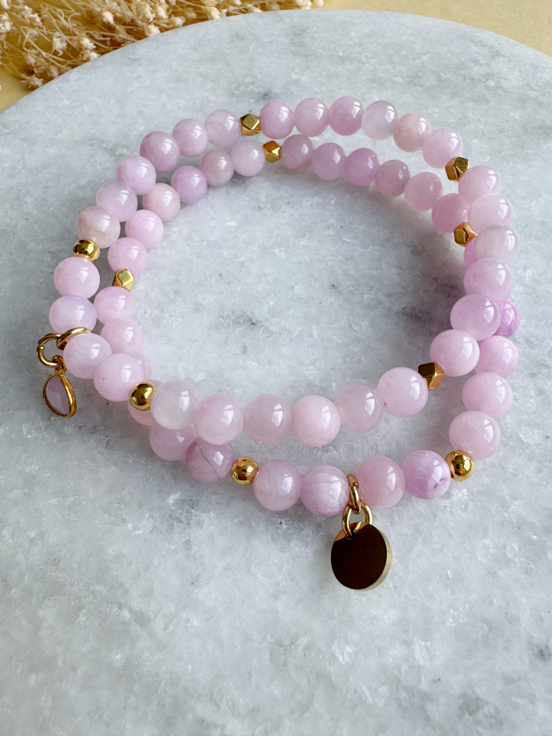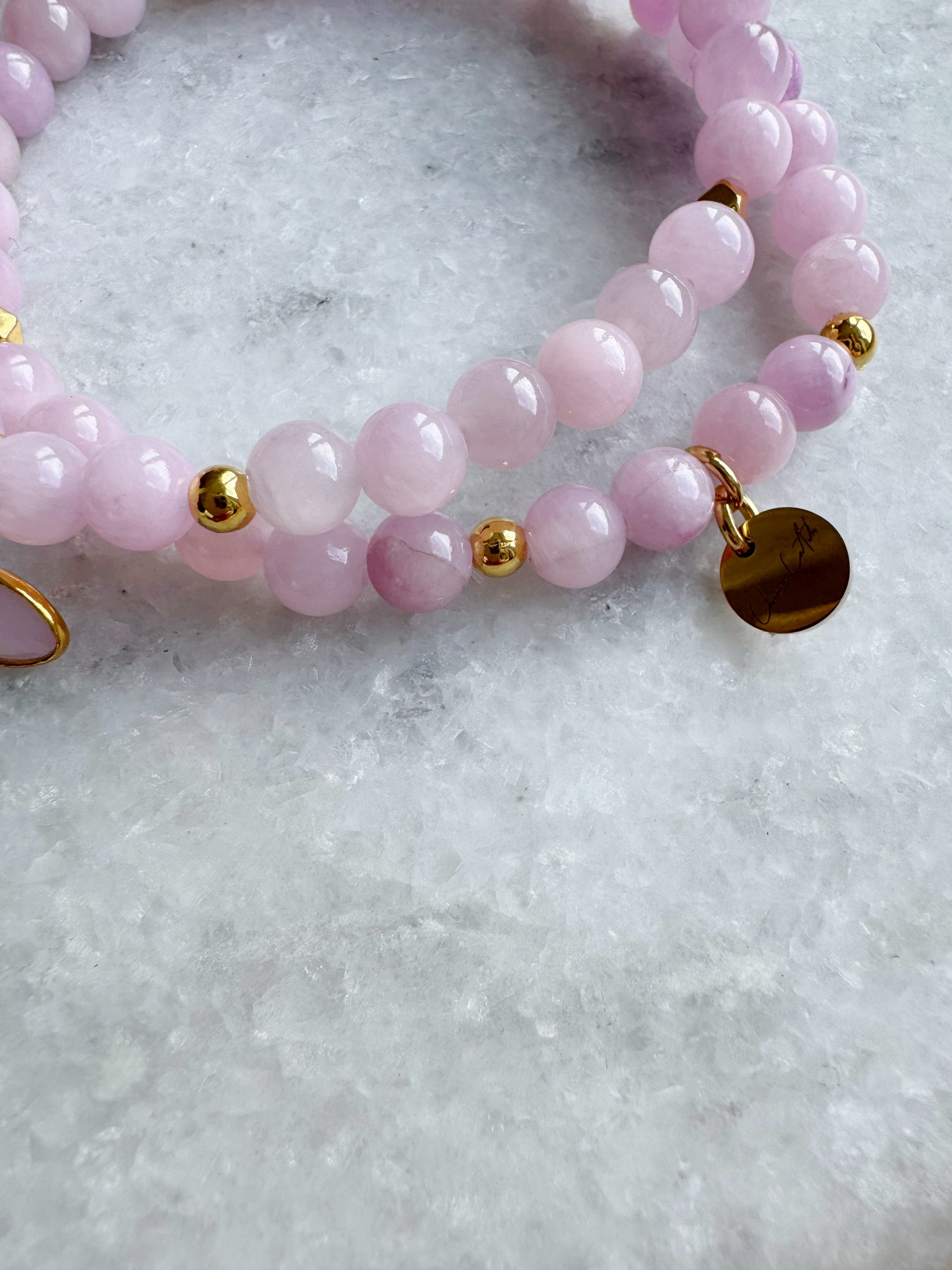 Ein bisschen Flieder, viel gute Laune. Unser neues Set aus Jade-Perlen katapultiert direkt in den goldenen Sommer. Die Perlen kombiniert mit goldigen Details, einem Charm und einem kleinen Anhänger aus Rosenquarz bringen Eleganz.