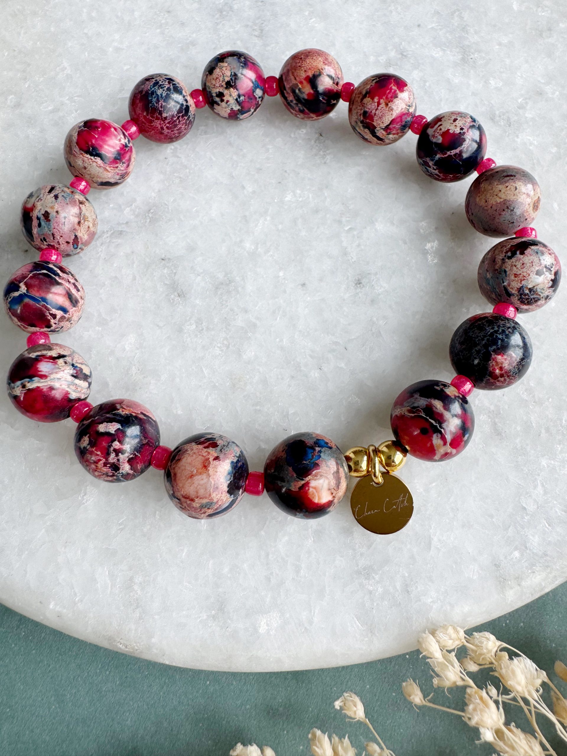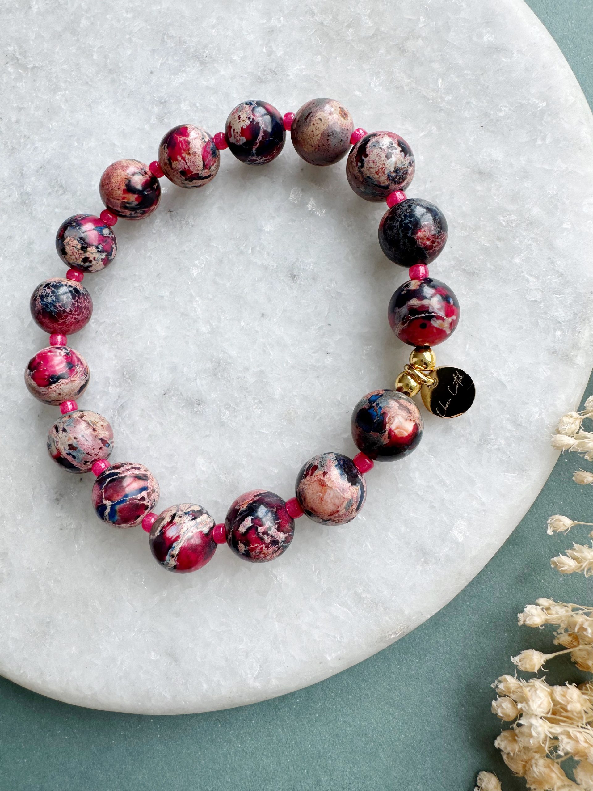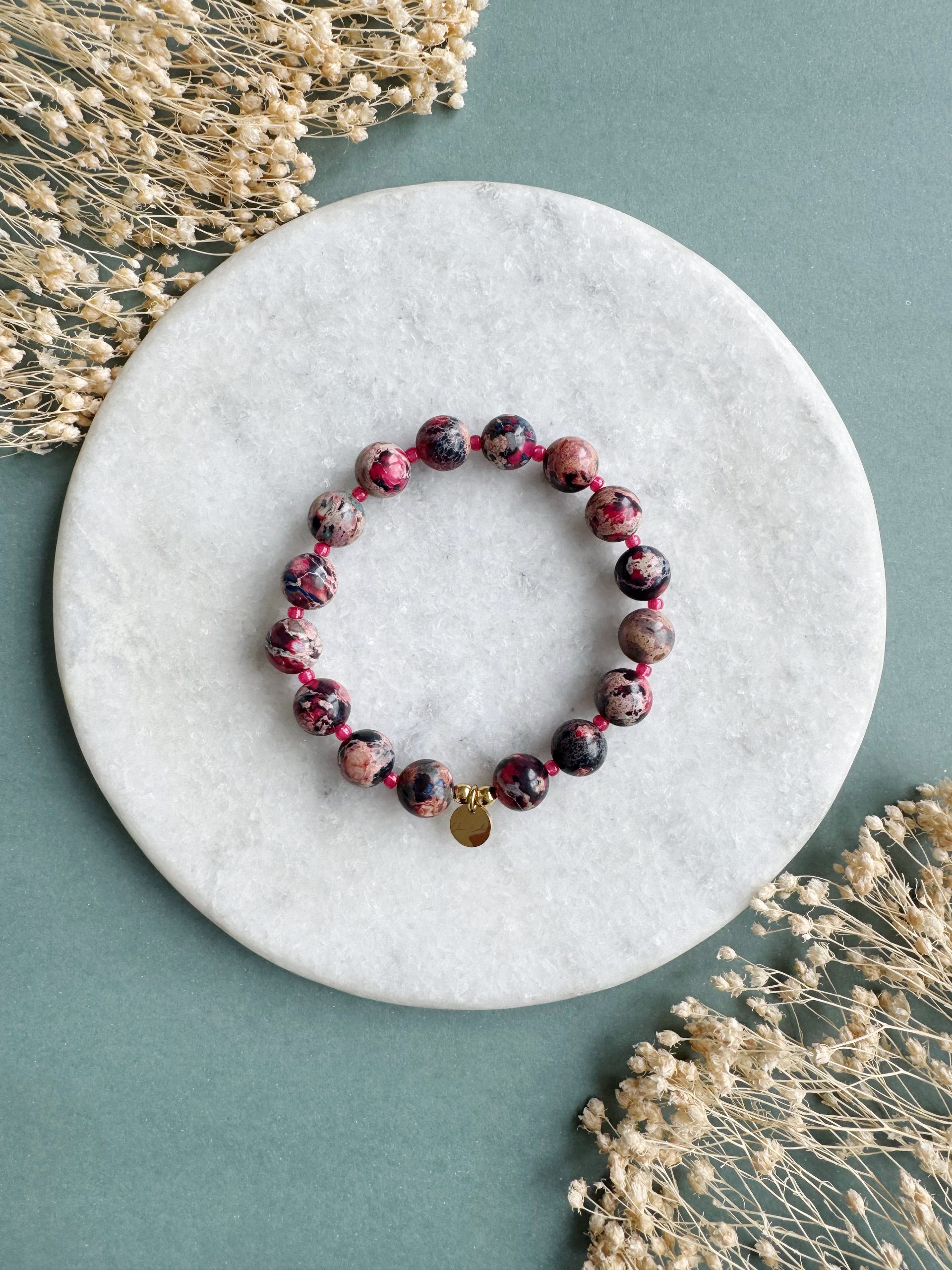 Ein Traum aus Beerenrot und einem Mitternachtsblau: Das Armband „Field View“ beeindruckt mit markant gemaserten Jaspisperlen in 10mm Größe.