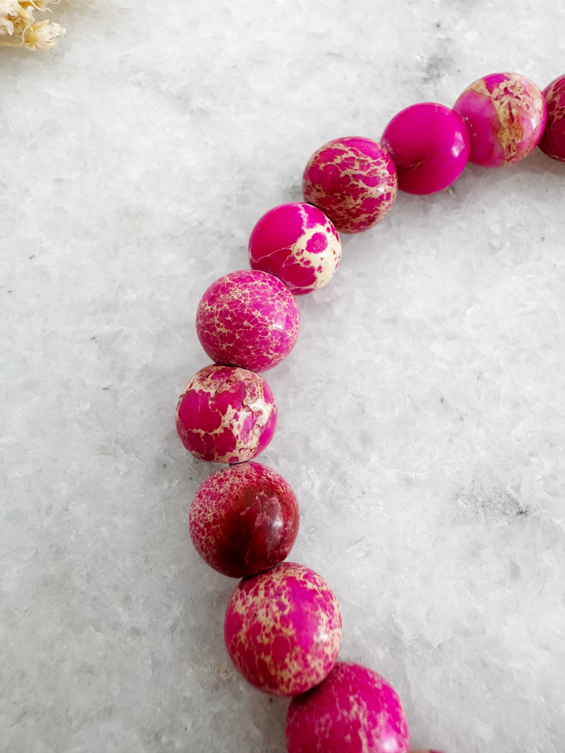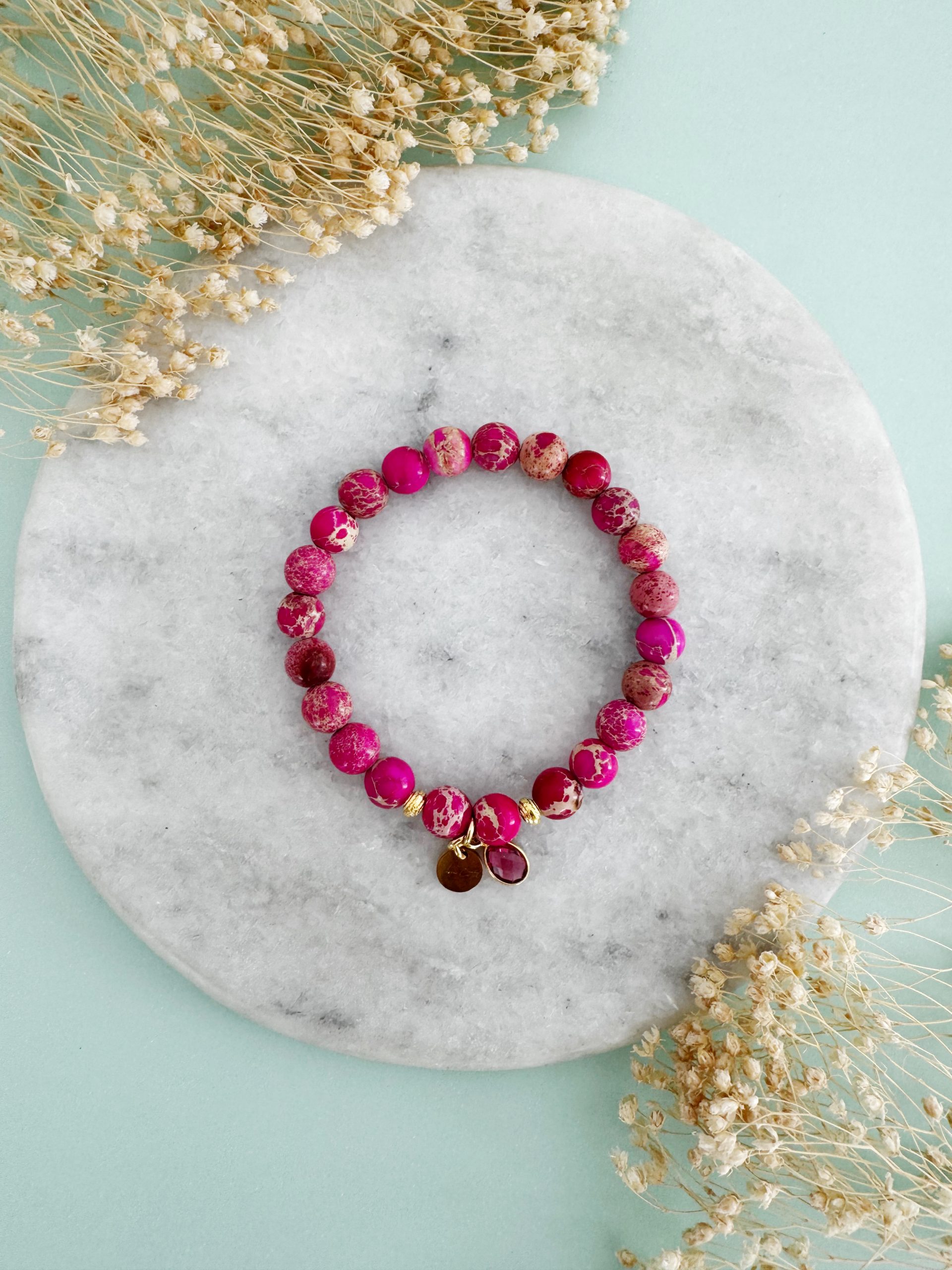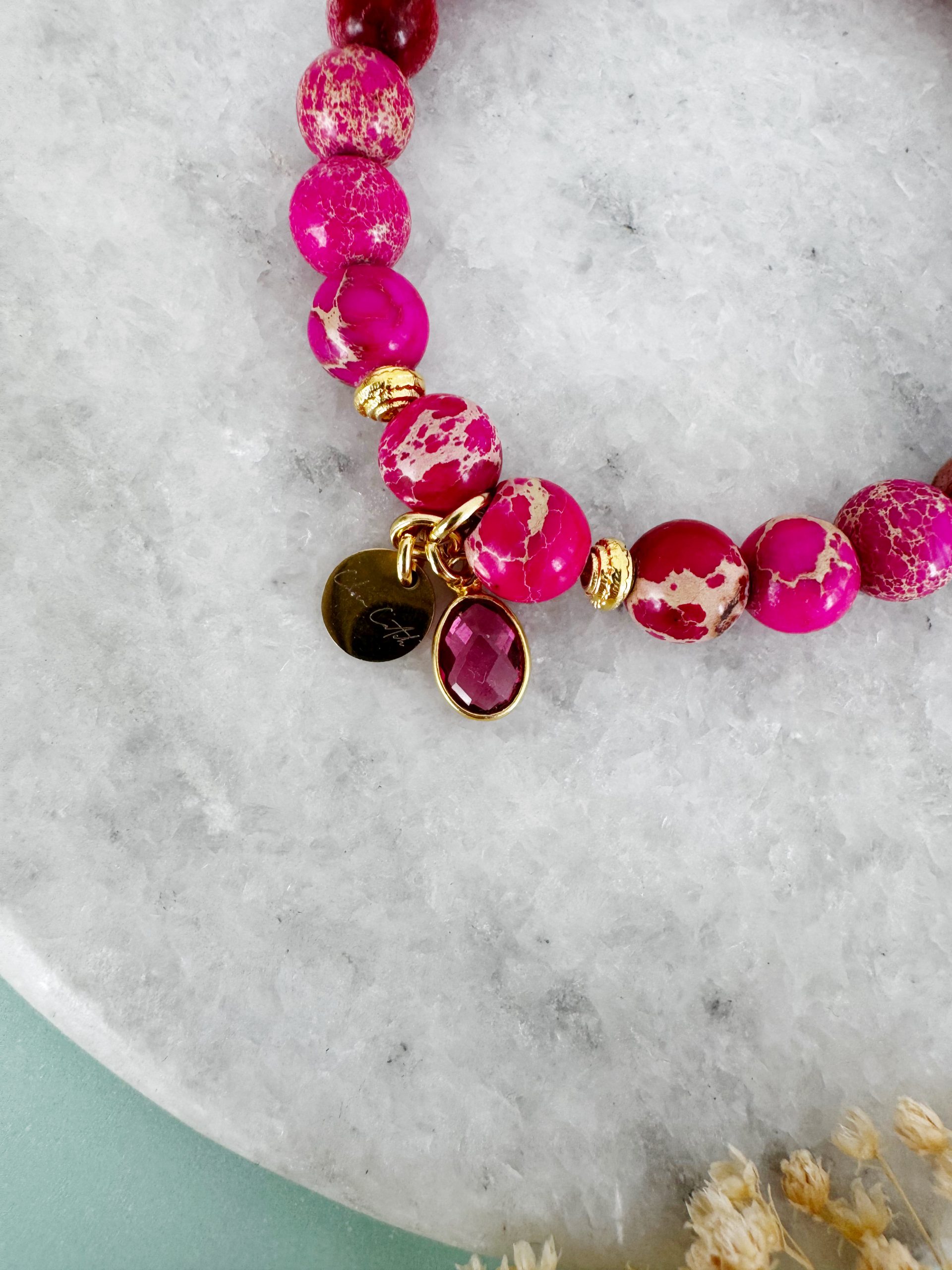 Verschiedene Pink-Töne gepaart mit der markanten Maserung geben dem Jaspis einen verspielten Look. Gepaart werden die Perlen mit goldigen Details und einem farblich passenden Anhänger aus Turmalin.