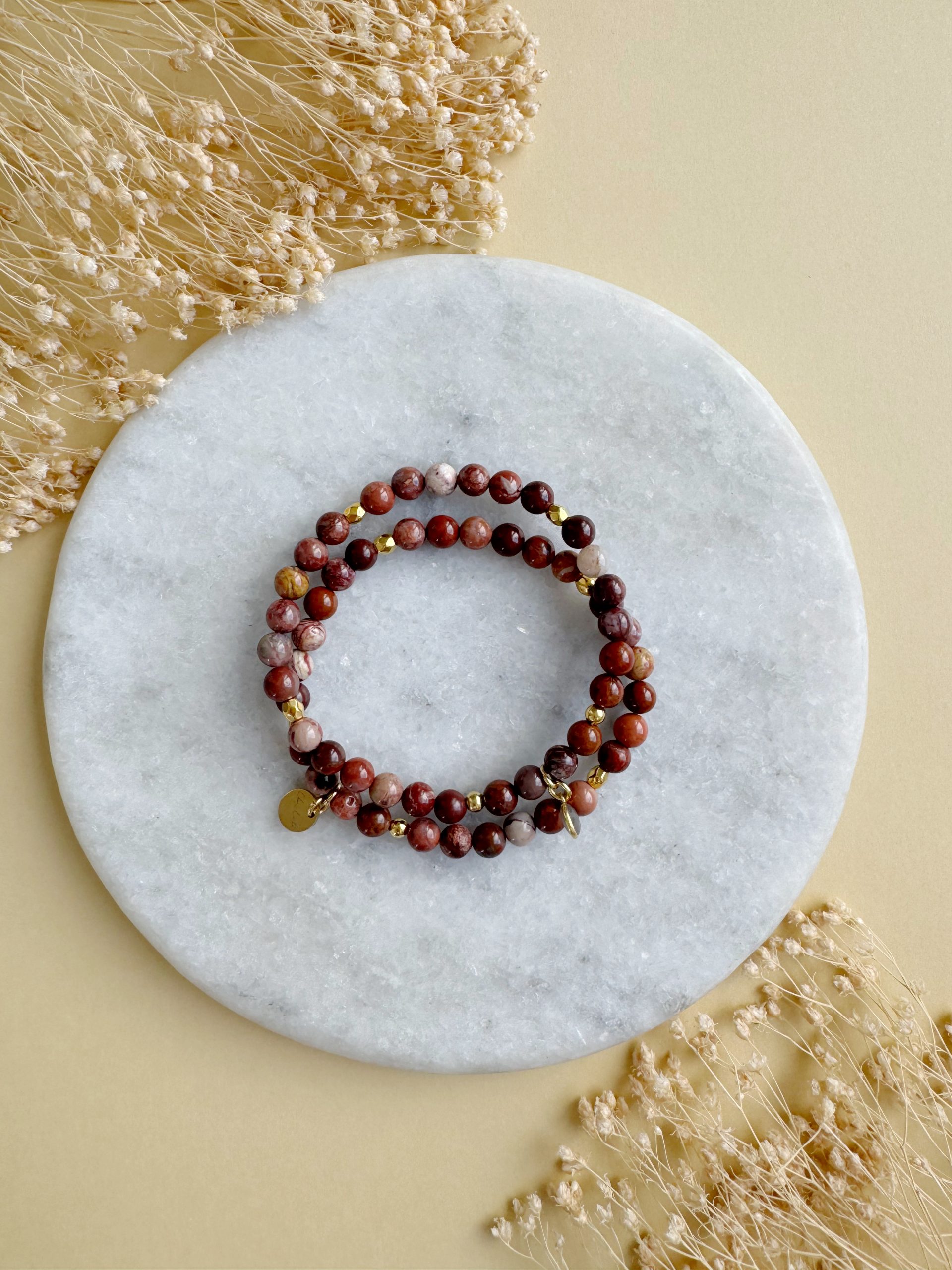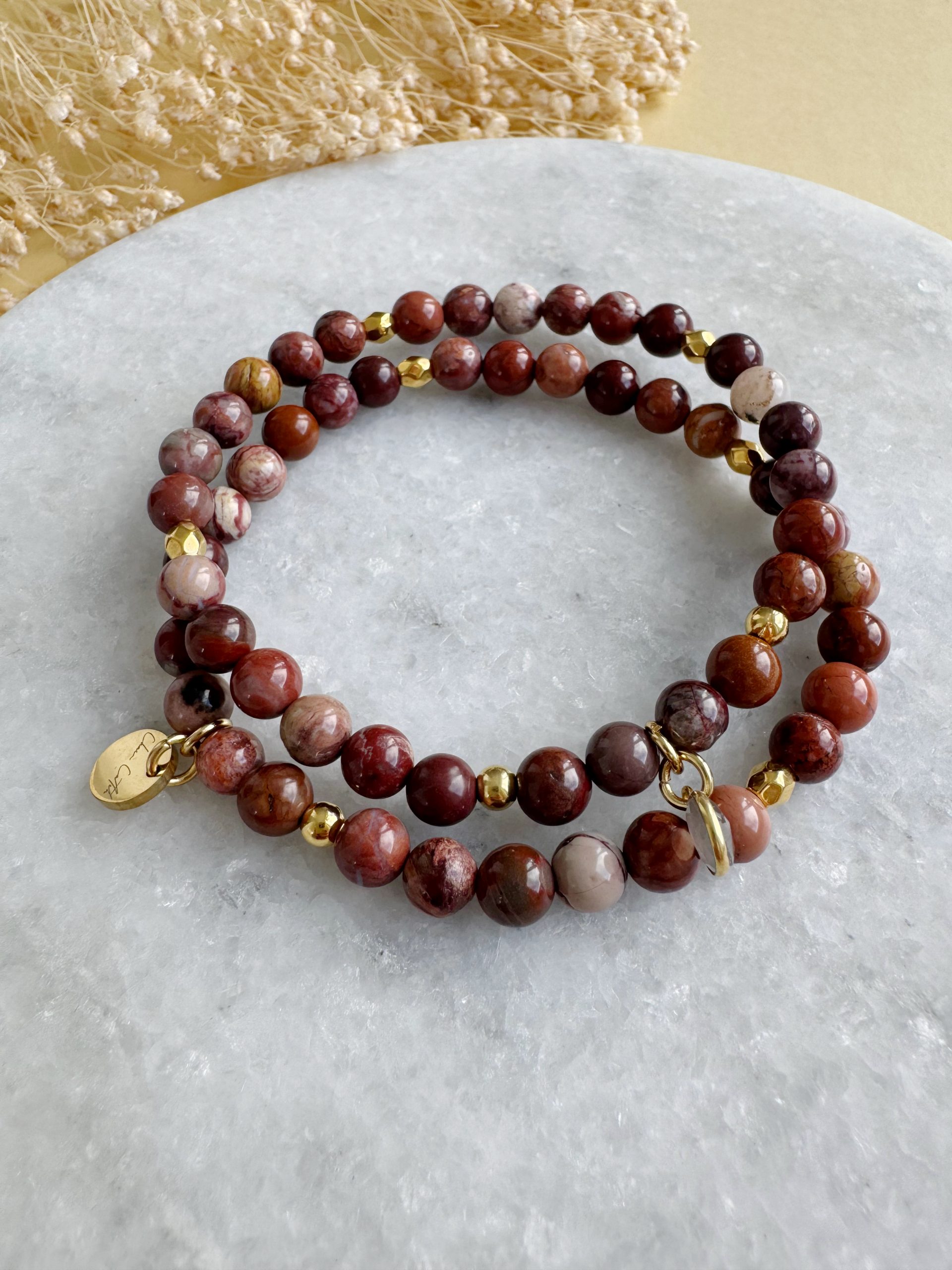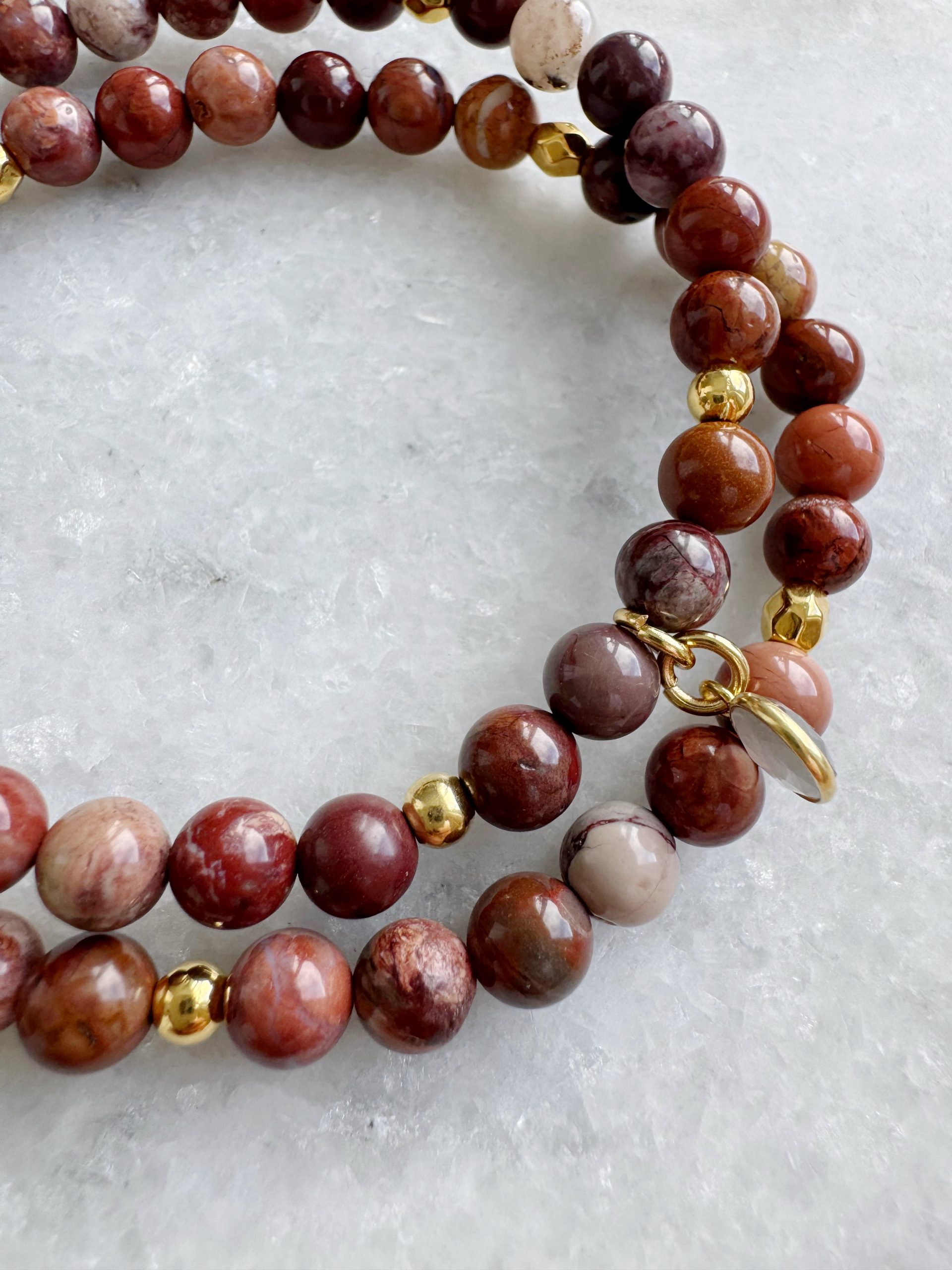 Ein bisschen von allen Herbstfarben, als Basis für tolle Kombinationsmöglichkeiten. Unser neues Set aus Jaspis-Perlen kombiniert mit goldigen Details, einem Plättchen und einem kleinen Anhänger aus grauem Mondstein bringen Lust auf Farbe.
