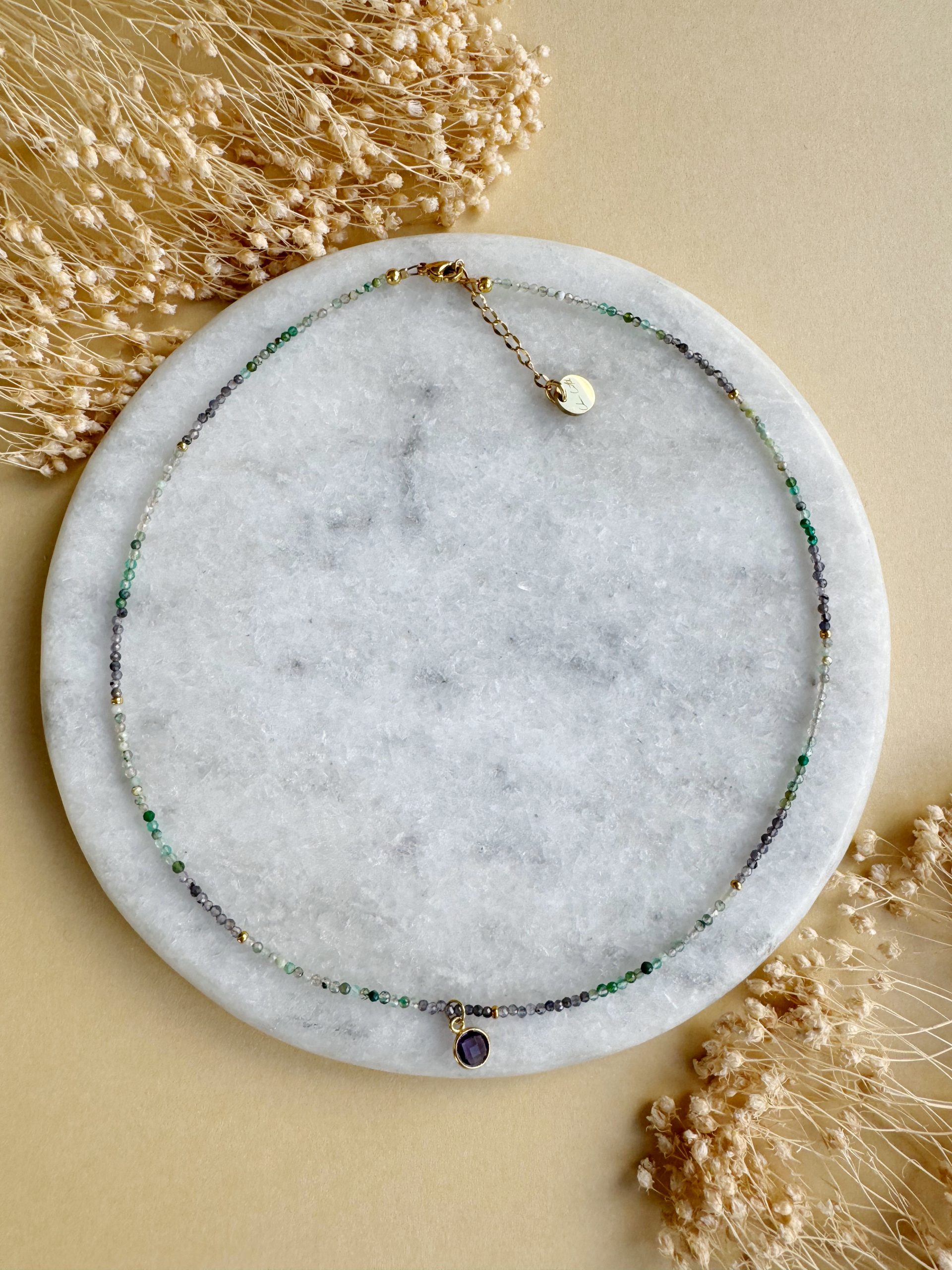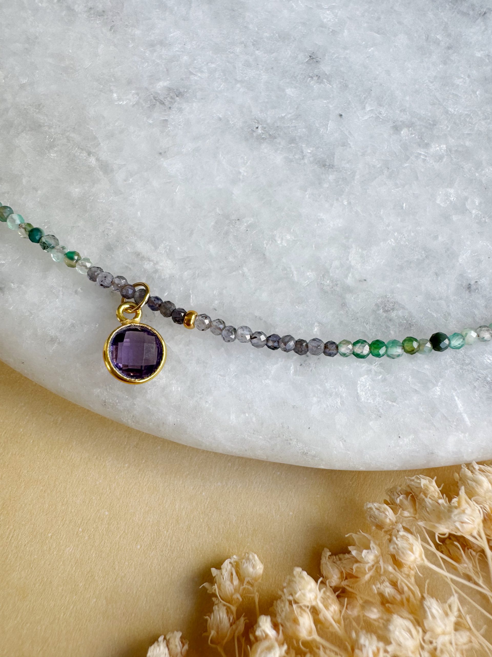 Die feinen 2 mm Perlen aus Edelsteinmix sind der Hingucker am Hals. Sie werden durch kleine goldige Details und einen passenden Anhänger aus Amethyst. Ein traumhaftes Accessoire zu jeder Saison.