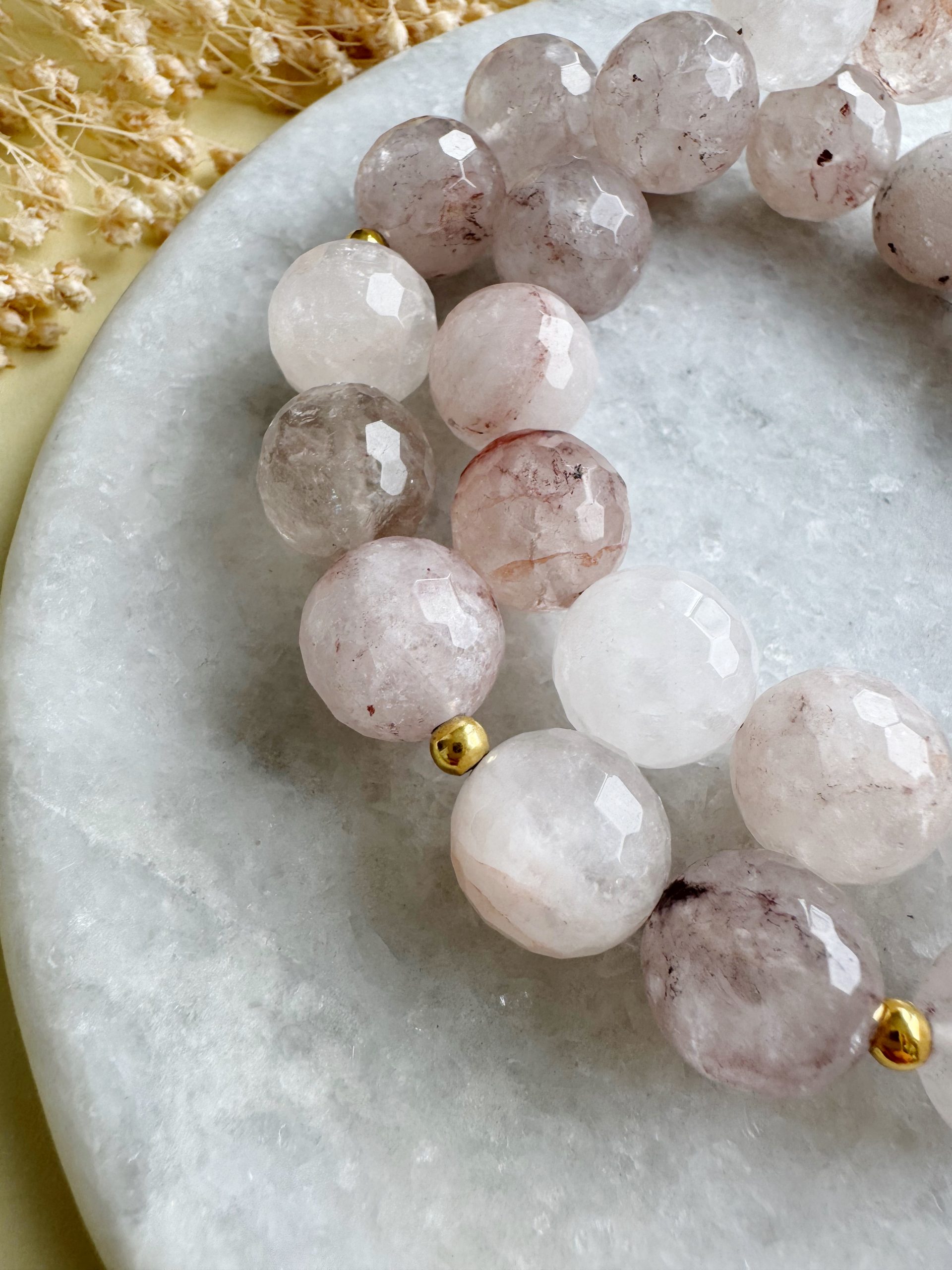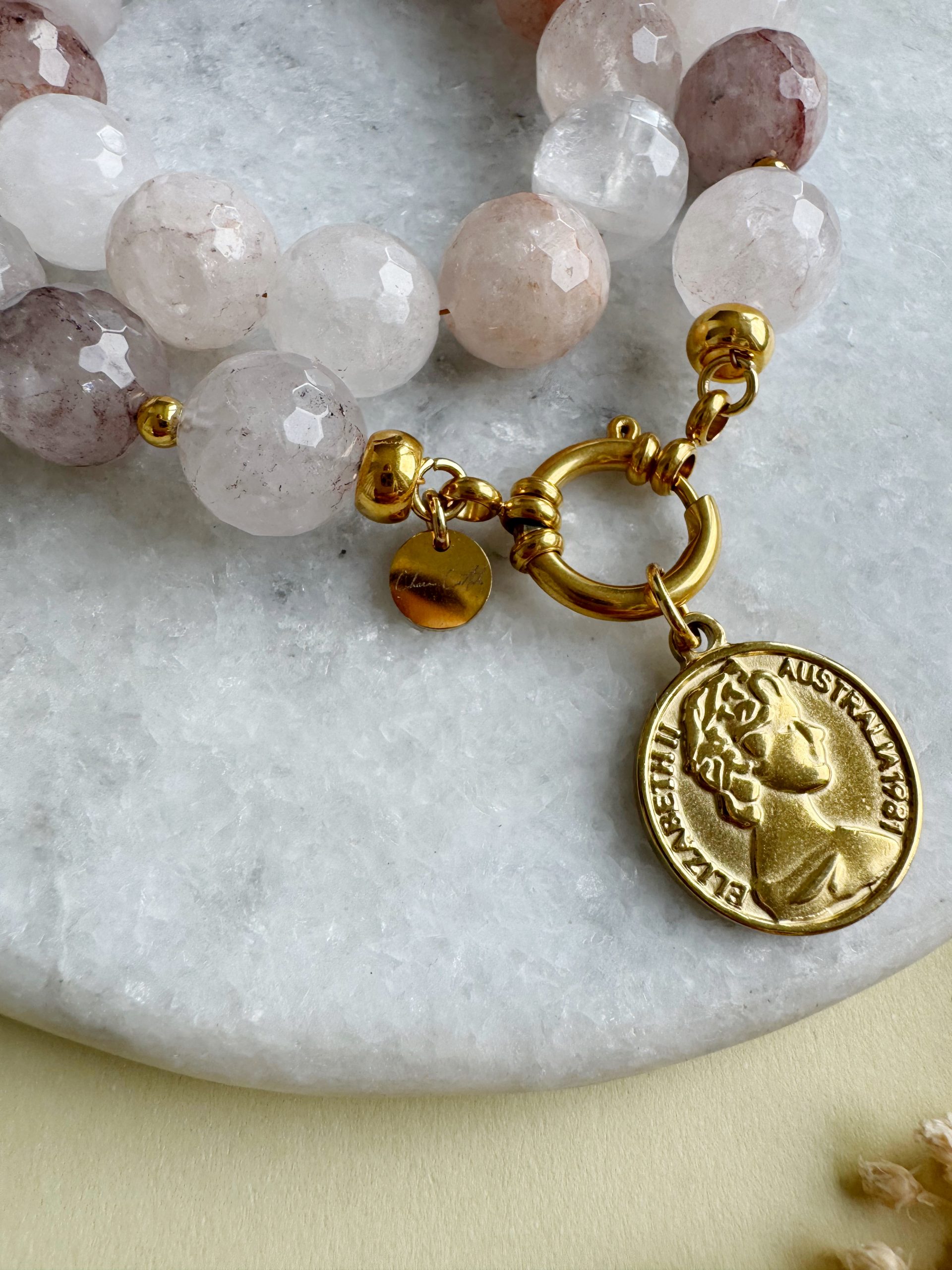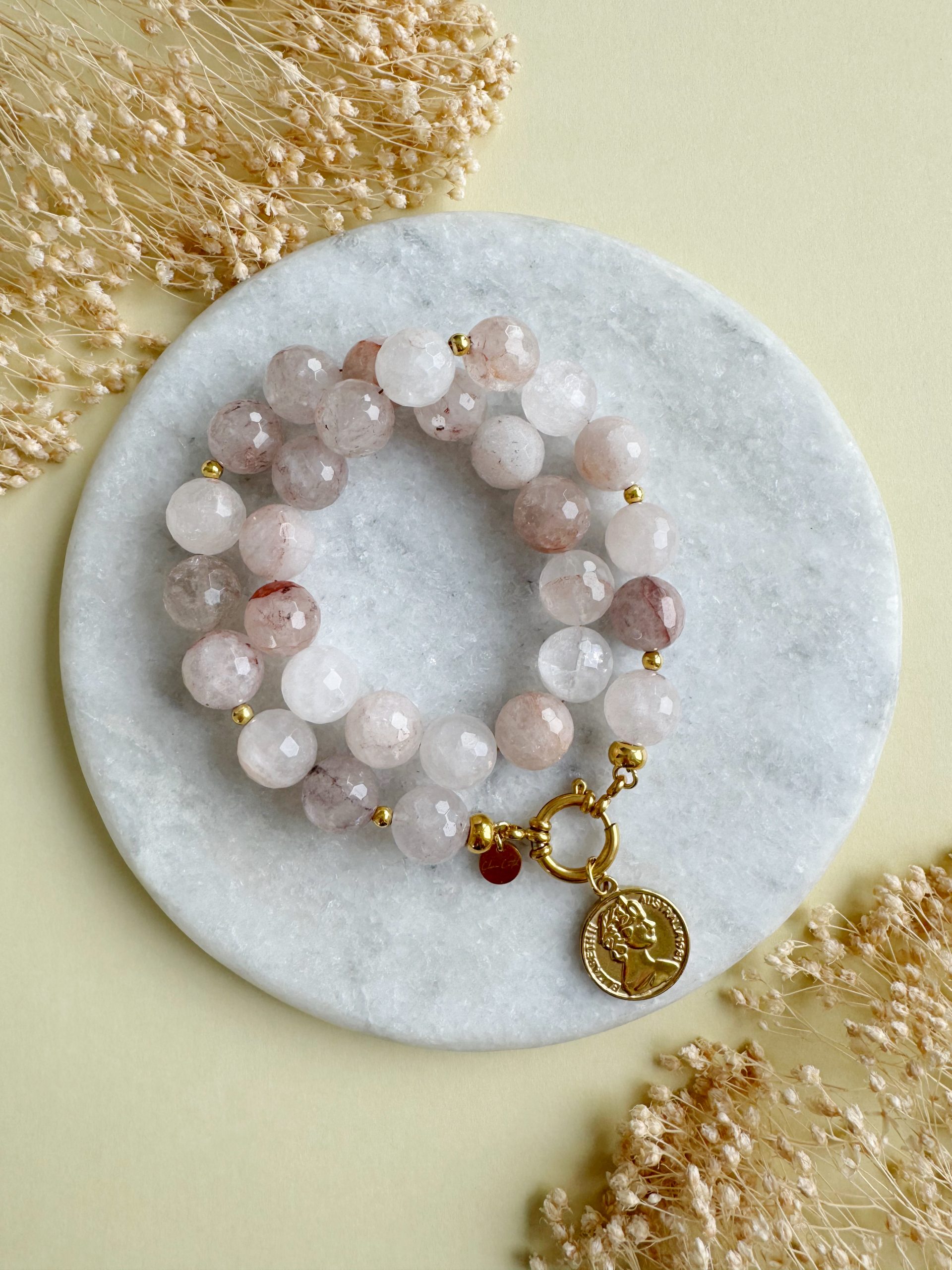 Unser Neuzugang mit besonders hübscher Maserung. Der Quarz besticht durch seine feinen, nadelförmigen Einschlüsse, die ihm auch seine perfekte erdbeerige Färbung bescheren. Die facettierten Perlen glänzen in zarten Tönen von Rose bis zu Altrosa. Schimmernde Golddetails und ein Münz-Anhänger machen aus „Berry Kiss“ einen edlen Begleiter.