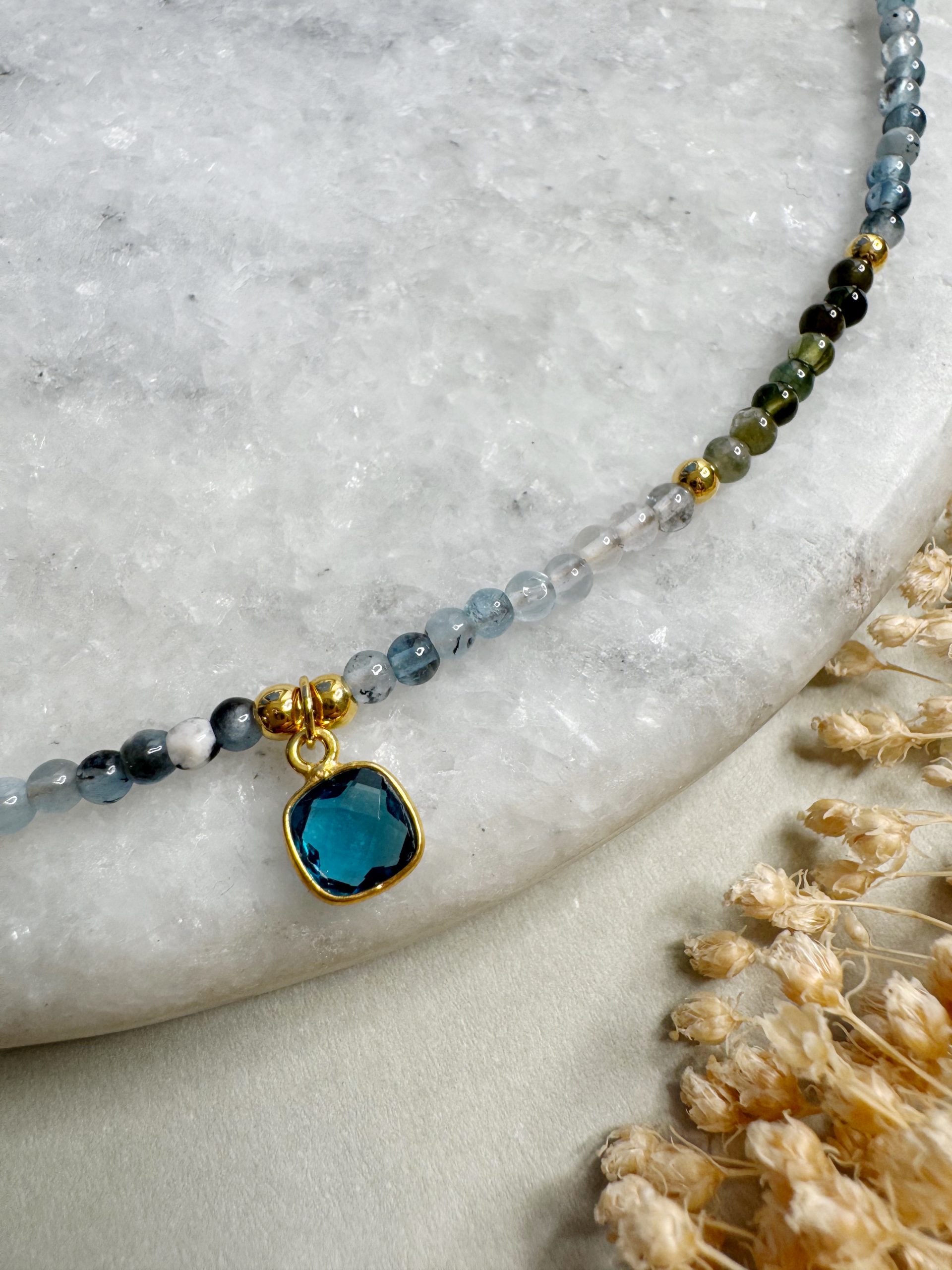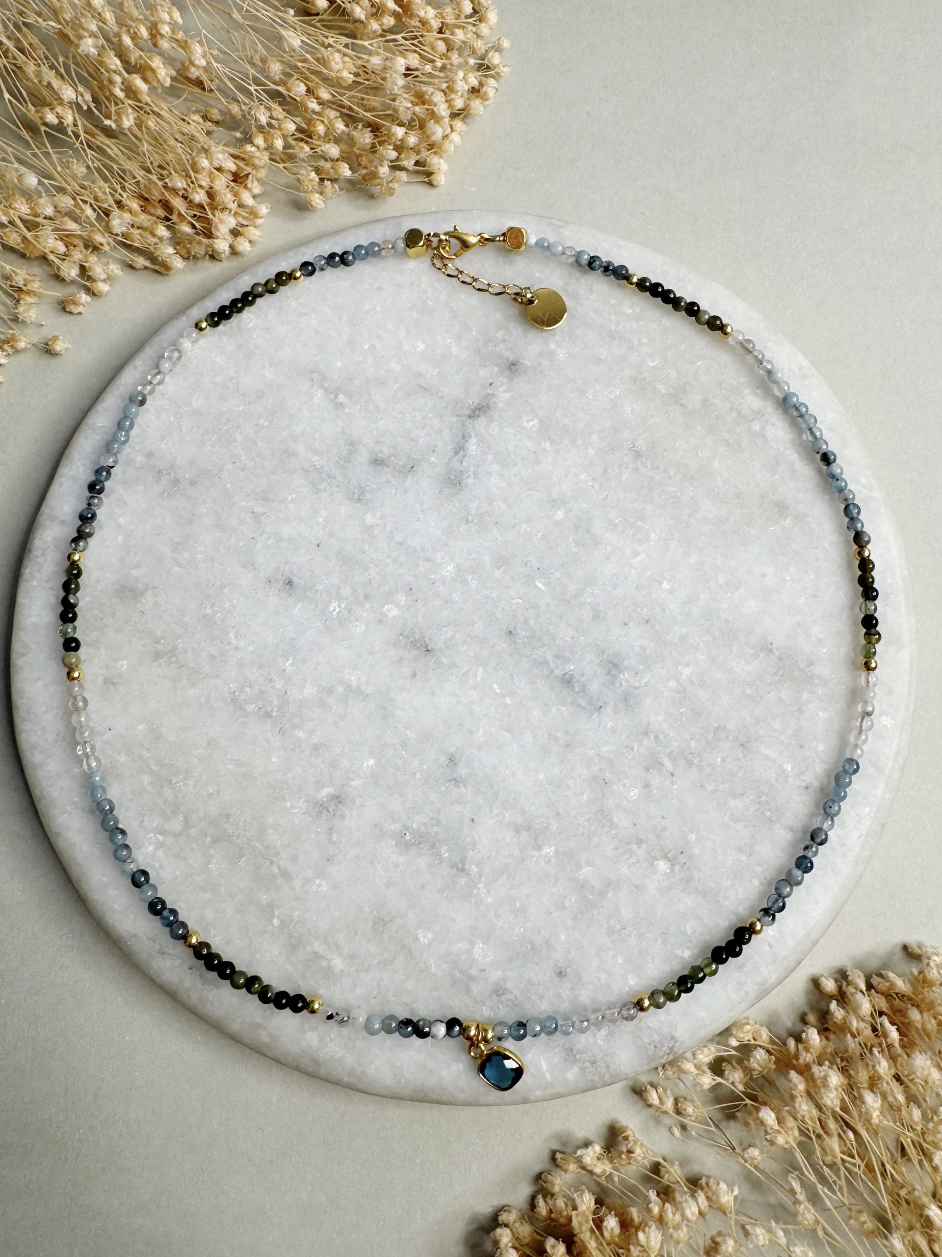 Nur 3mm Größe und doch so viel Blau und Grün: die Edelsteinmixperlen strahlen abwechselnd in edlen Farben und werden abgerundet von einem Anhänger aus Chalcedon. Perfekt zum Kombinieren mit Ketten aus Edelstahl oder einfach zum solo tragen.