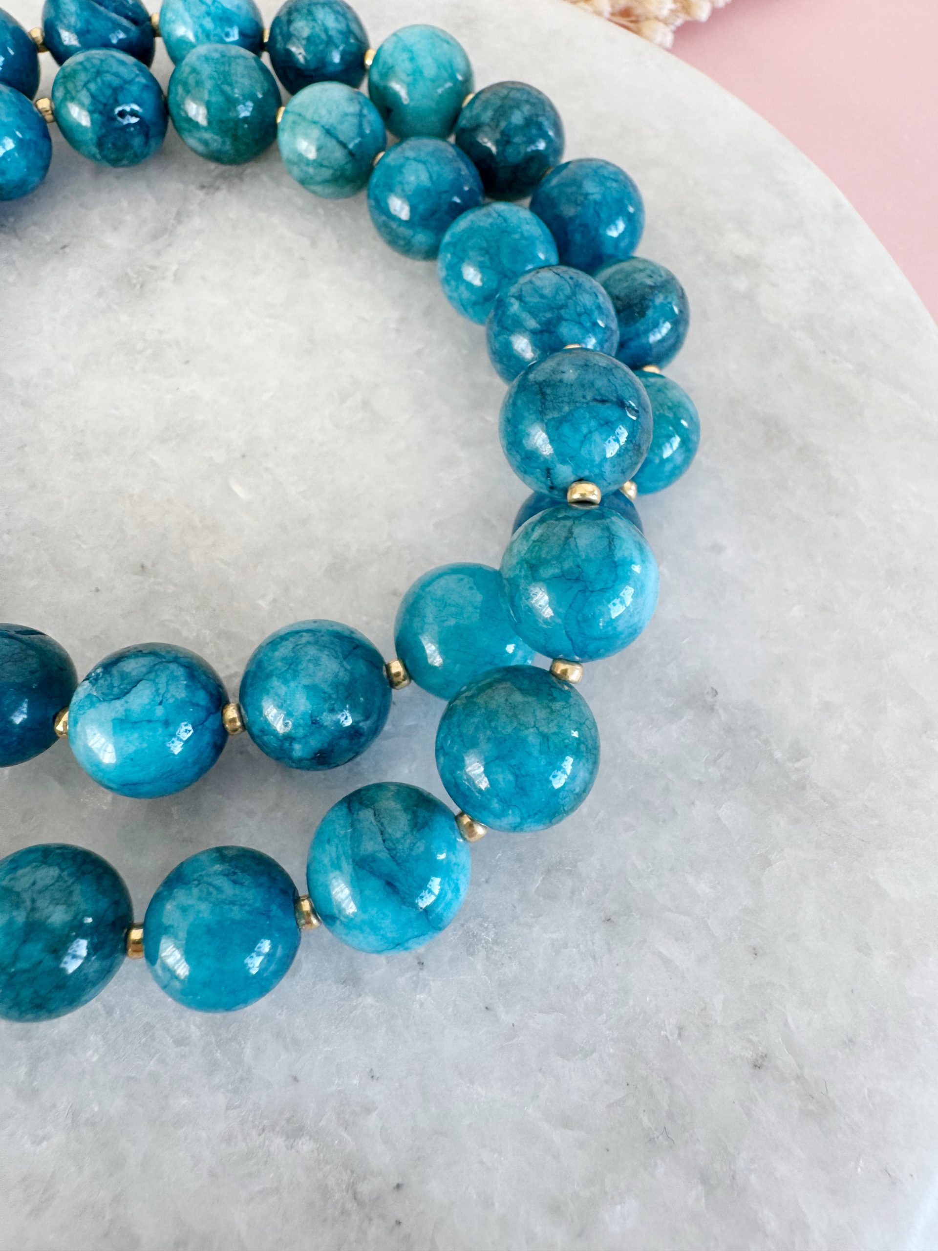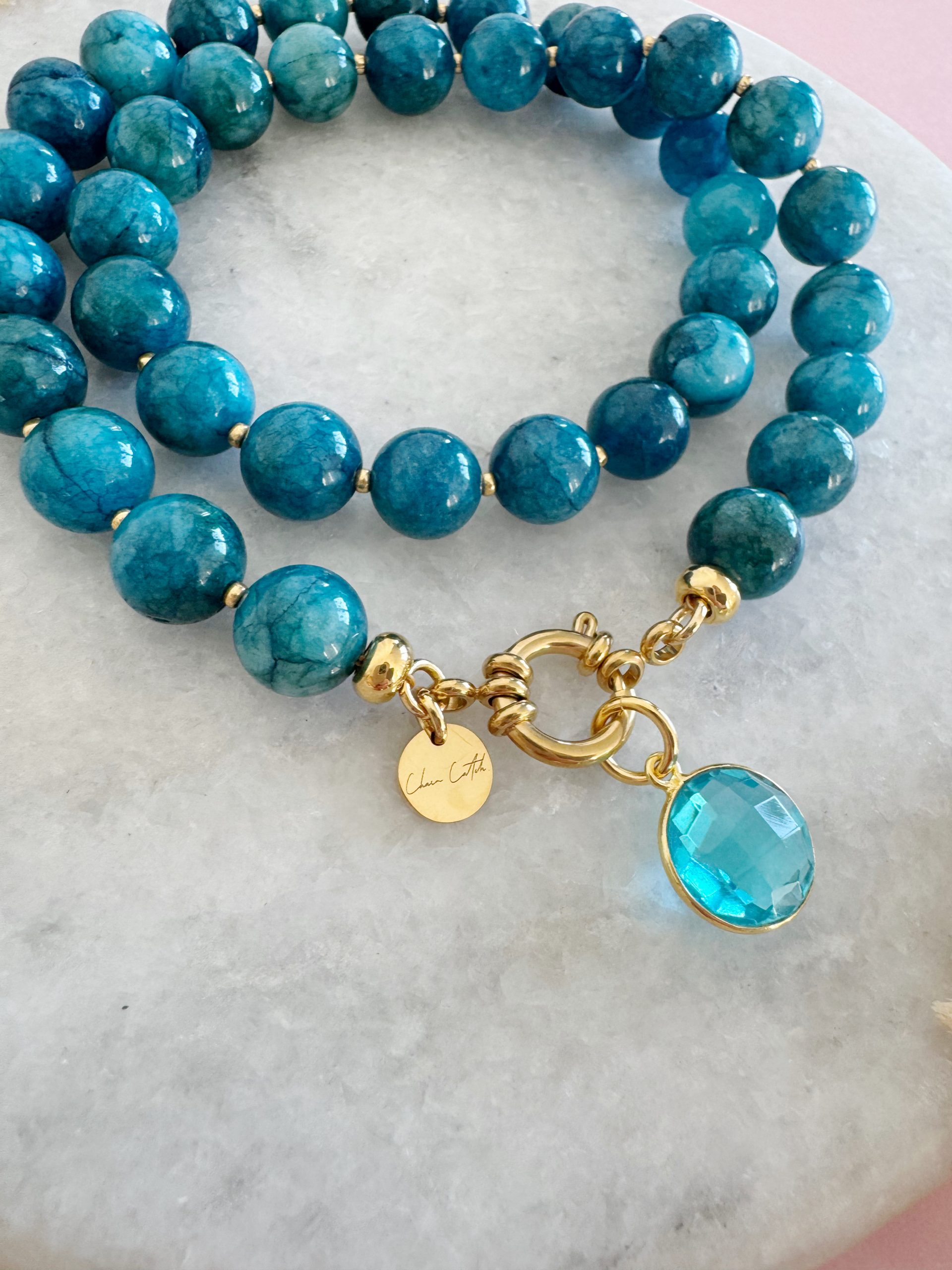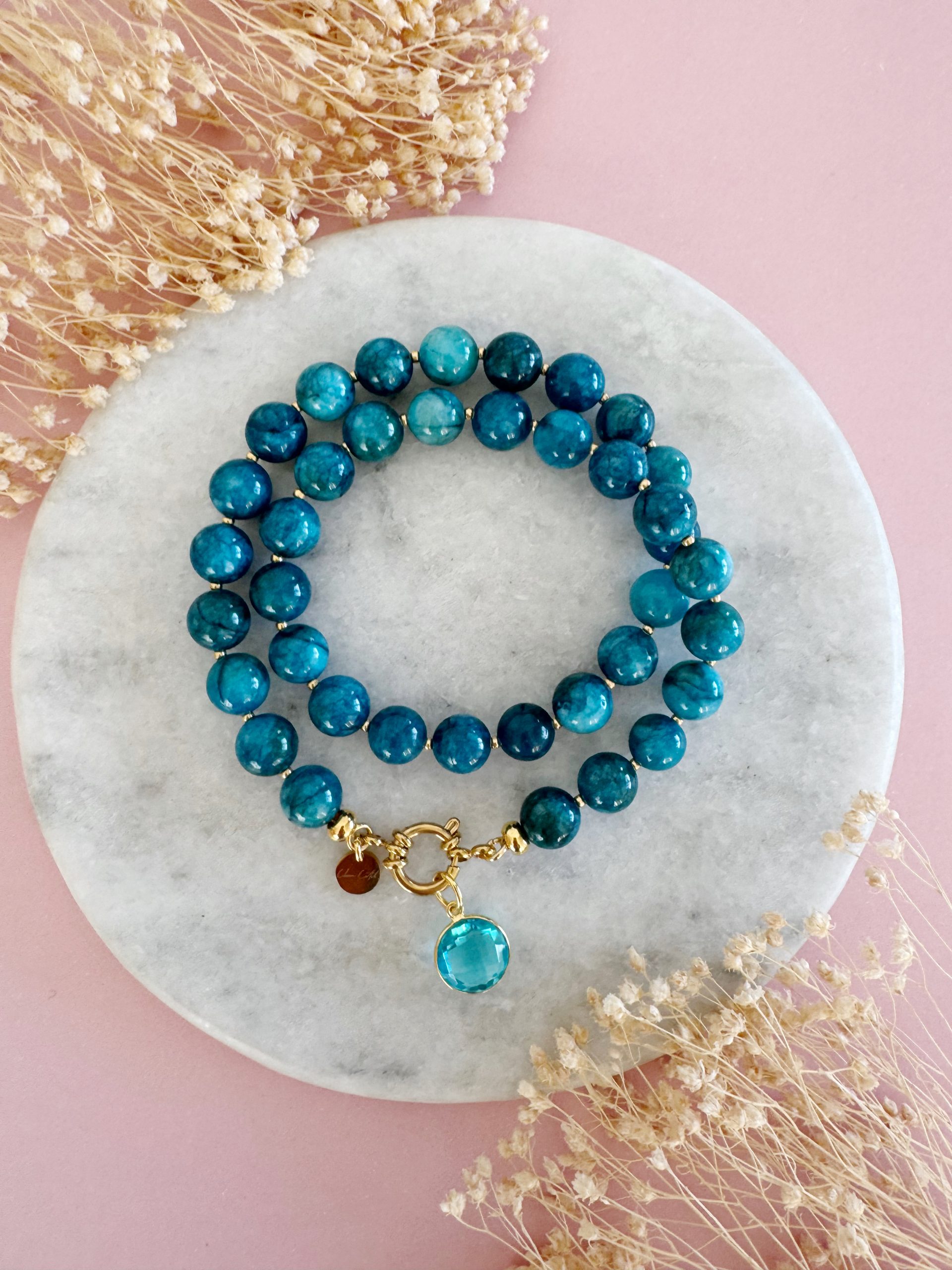 Blaue Jade trifft auf goldige Details. Der blaue Farbton der Perlen verleiht der Kette „Blue Wonder“ eine Prise Springfeeling und macht sie zum perfekten Accessoire für jede Jahreszeit.