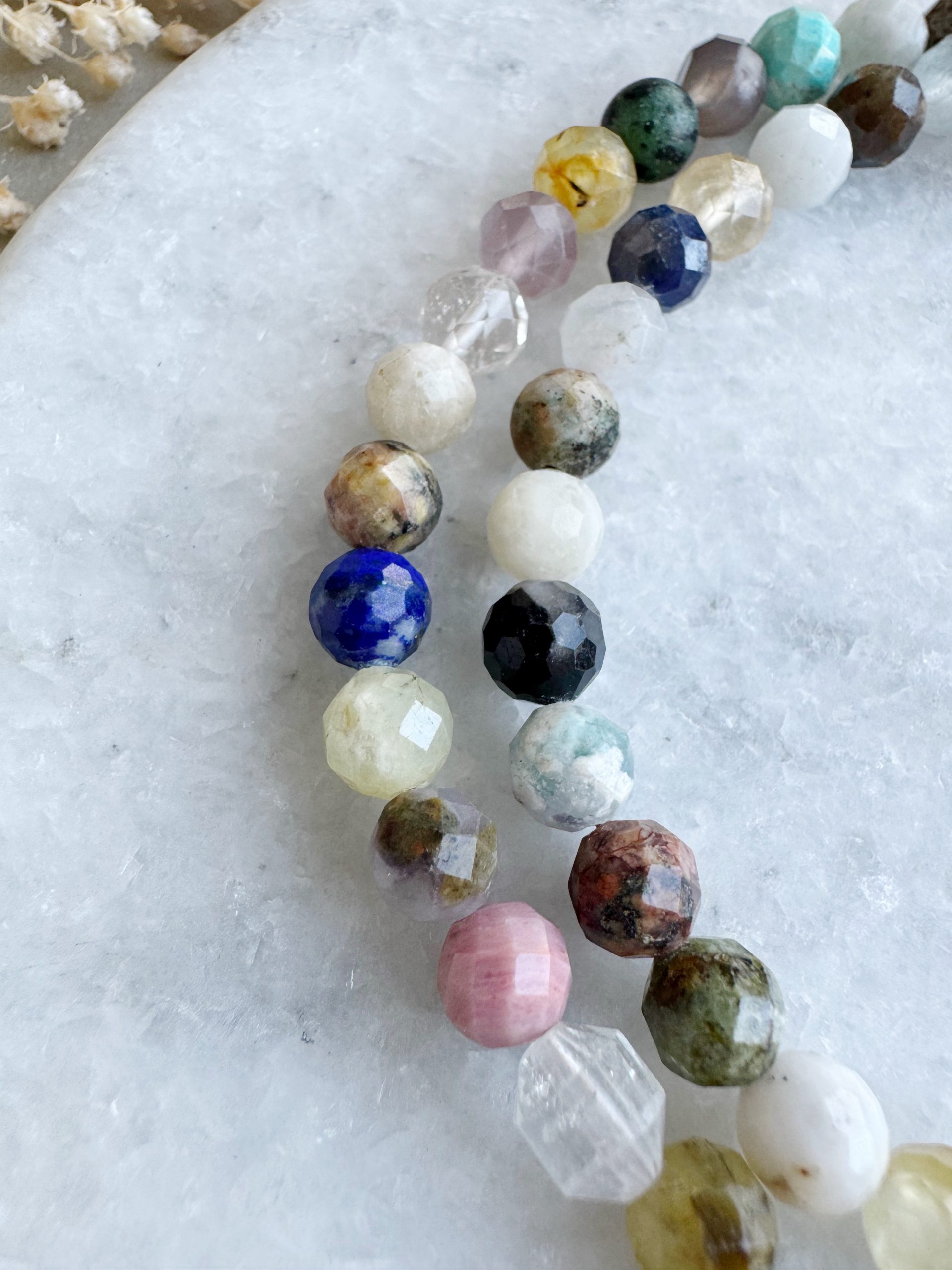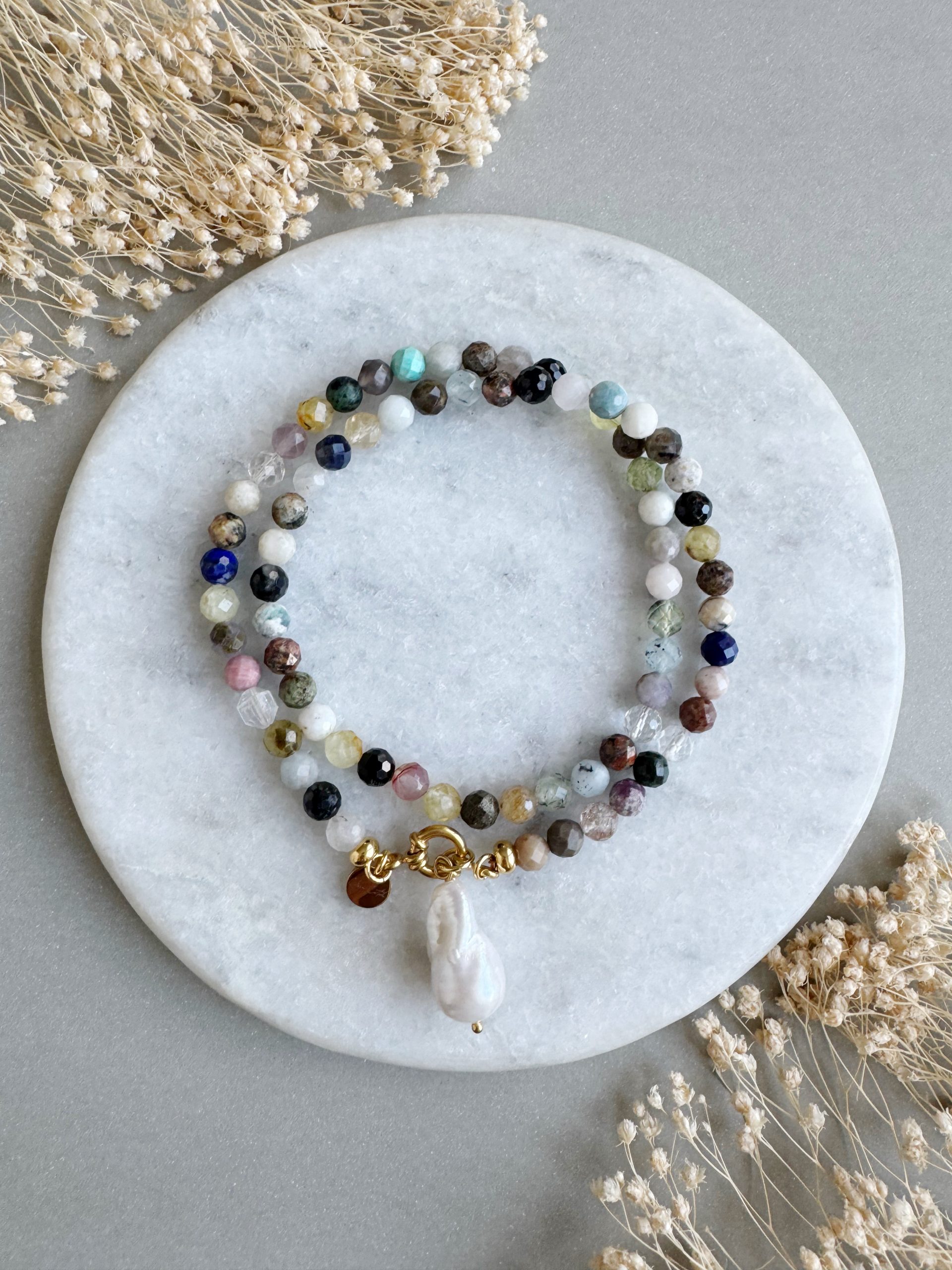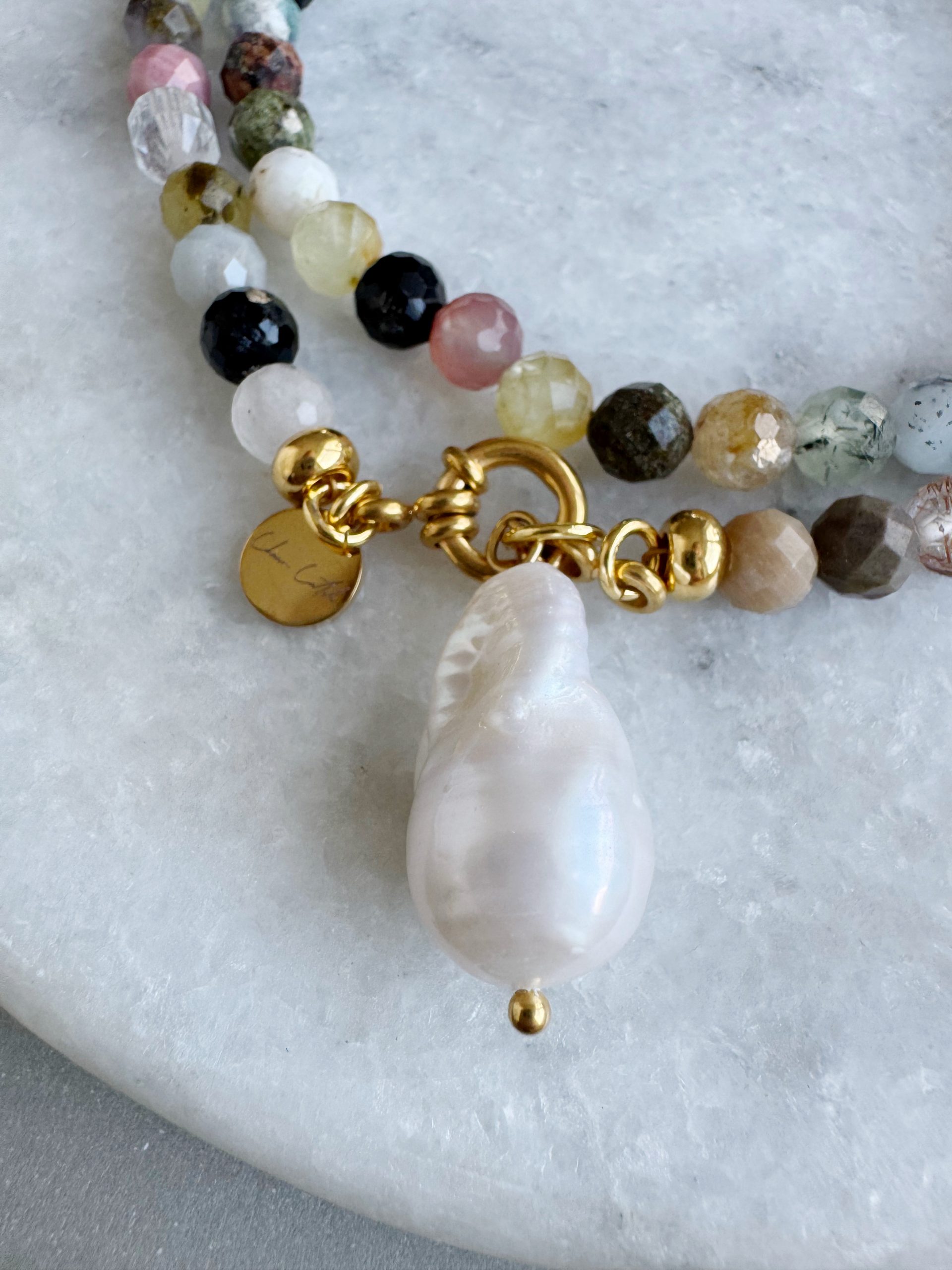 Eine Kette, die jedes Outfit zu etwas Besonderem macht. „Colourspring“ aus 6mm gemischten Edelsteinperlen sind gefertigt mit goldigen Details und einem Anhänger aus Barock-Perle.