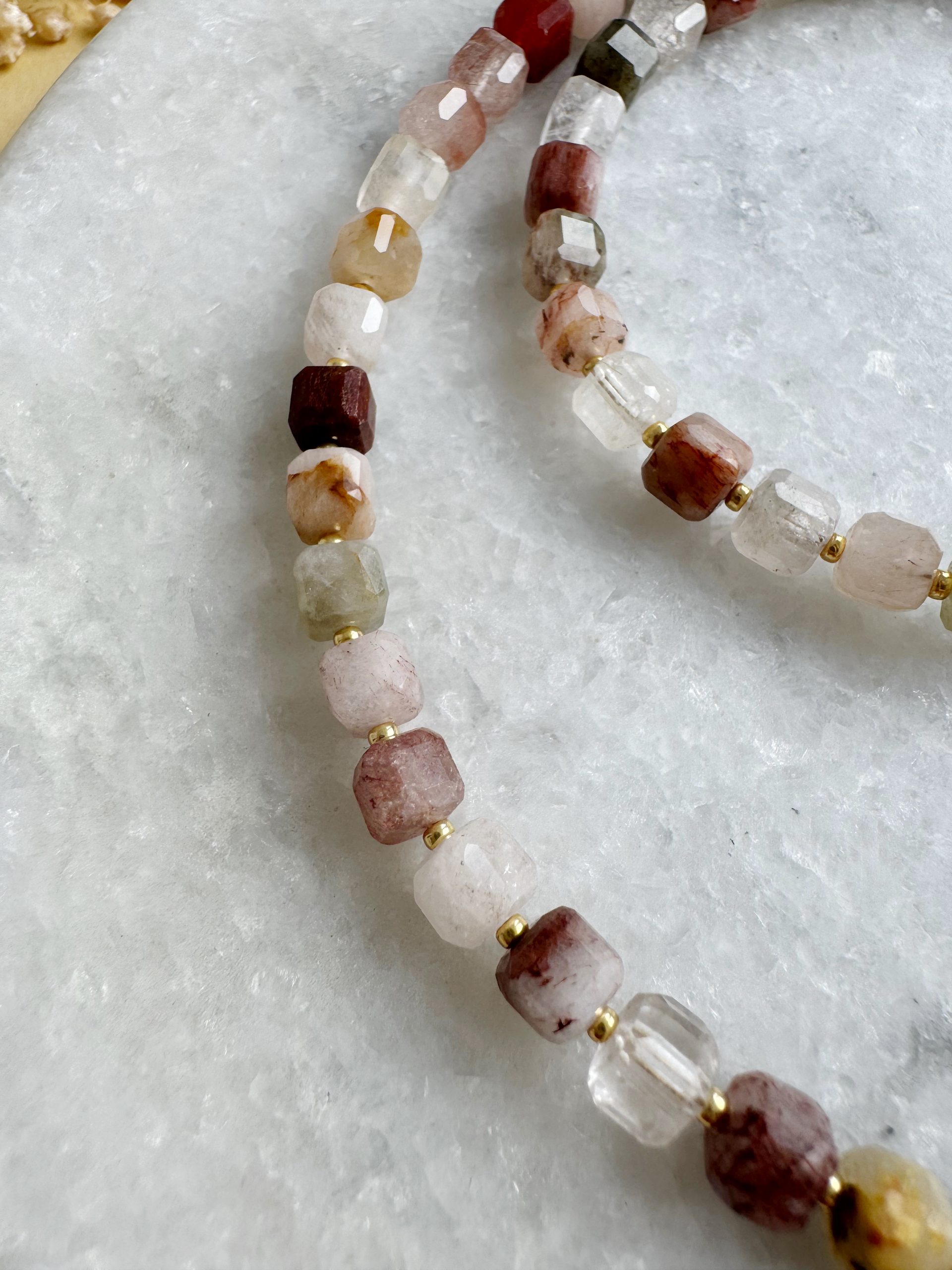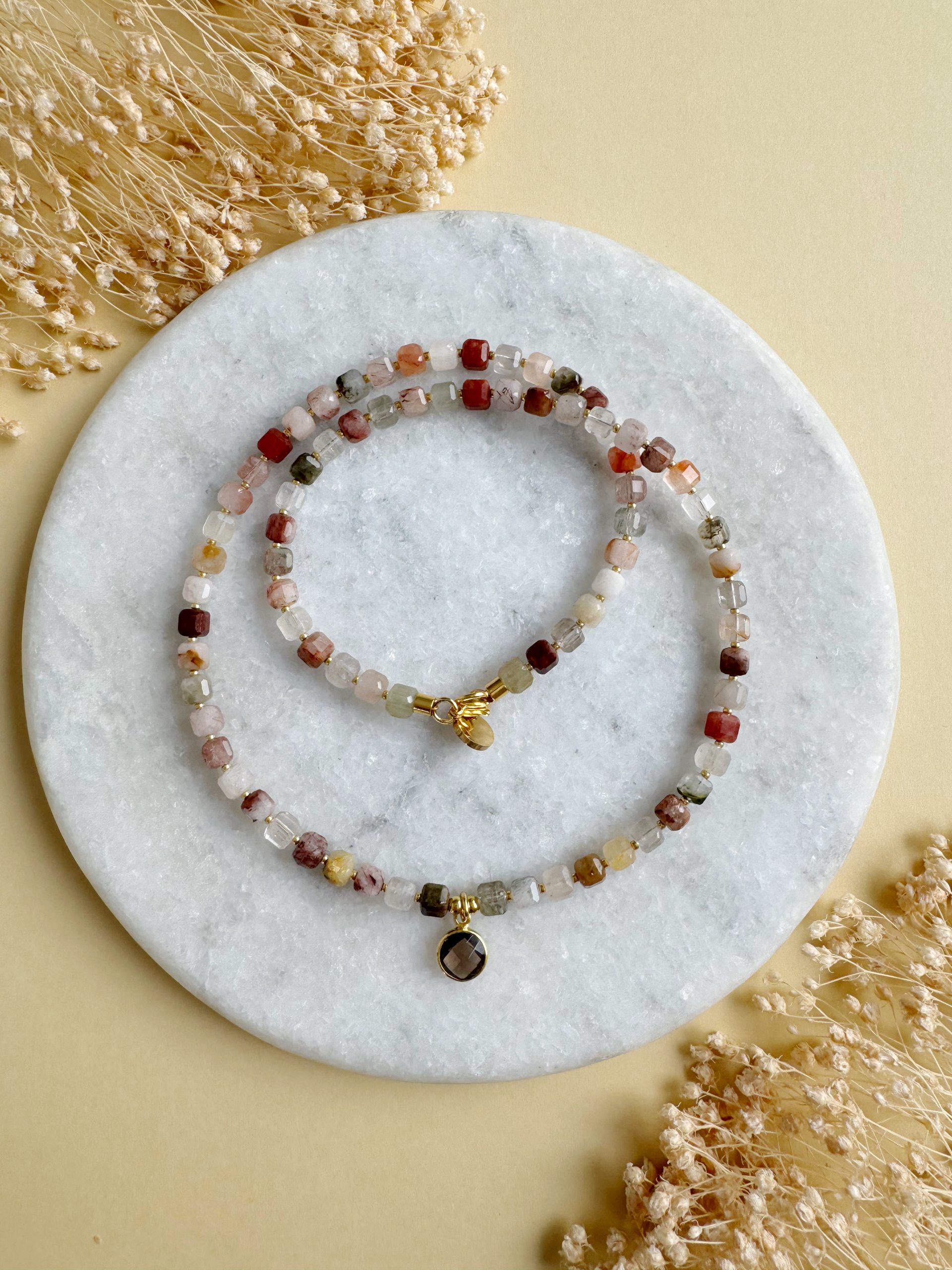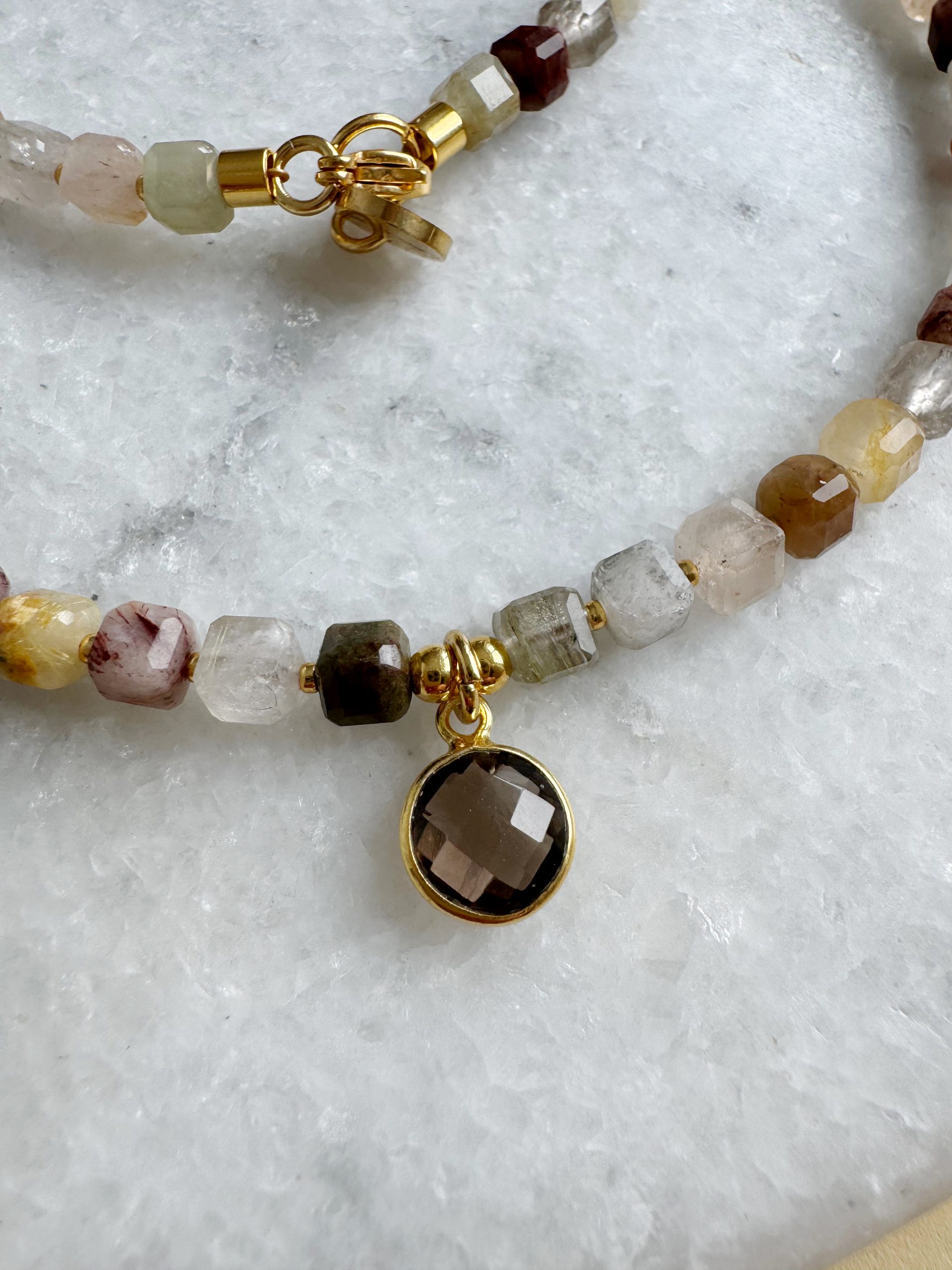 Glow gefällig?!Die süße Kette aus eckigen Quarz-Perlen kommt mit dezenten Gold-Details und einem farblich passenden Anhänger aus Rauchquarz. Bildschönes Allrounder-Modell.