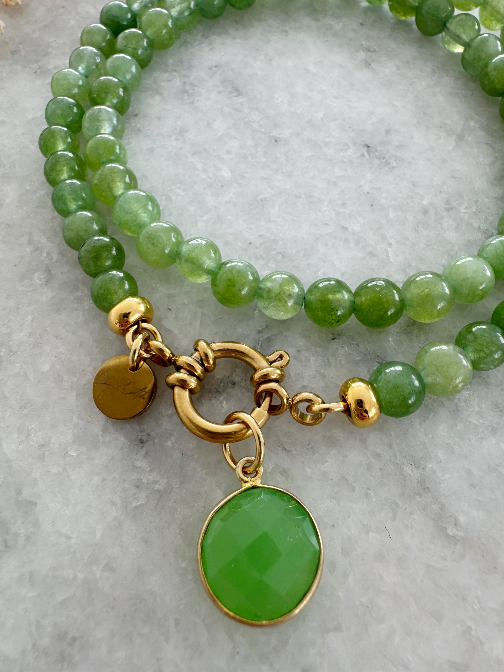 Die 4mm kleinen Jaspis-Steine von „Happy Forest“ strahlen in den schönsten Grün-Tönen: Die zarten Goldelemente und ein farblich passender Anhänger aus komplettieren den Look. Perfekt zum Kombinieren mit Ketten aus Edelstahl oder einfach zum solo tragen.