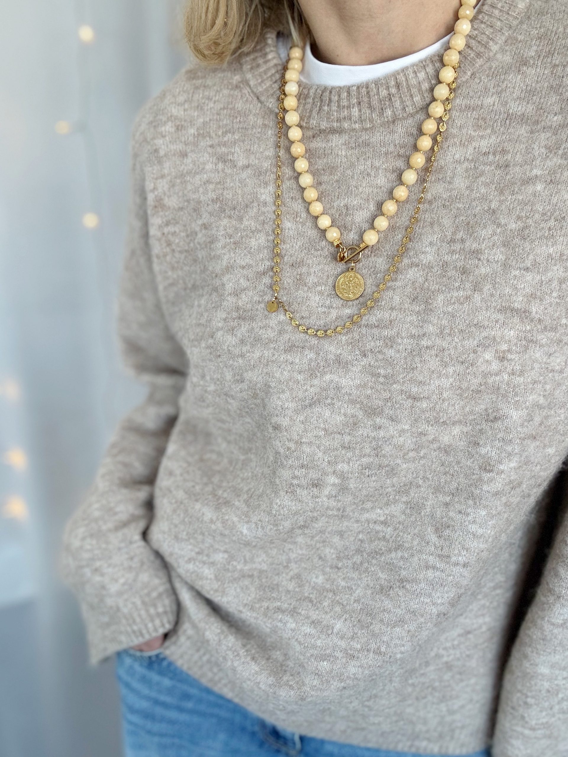 Süßer als Honig: Die 10mm Perlen aus Jade in einem herbstlichen Gelb-Ton. Gepaart mit goldigen Details, einem Frontverschluss und einem markanten Plättchen.