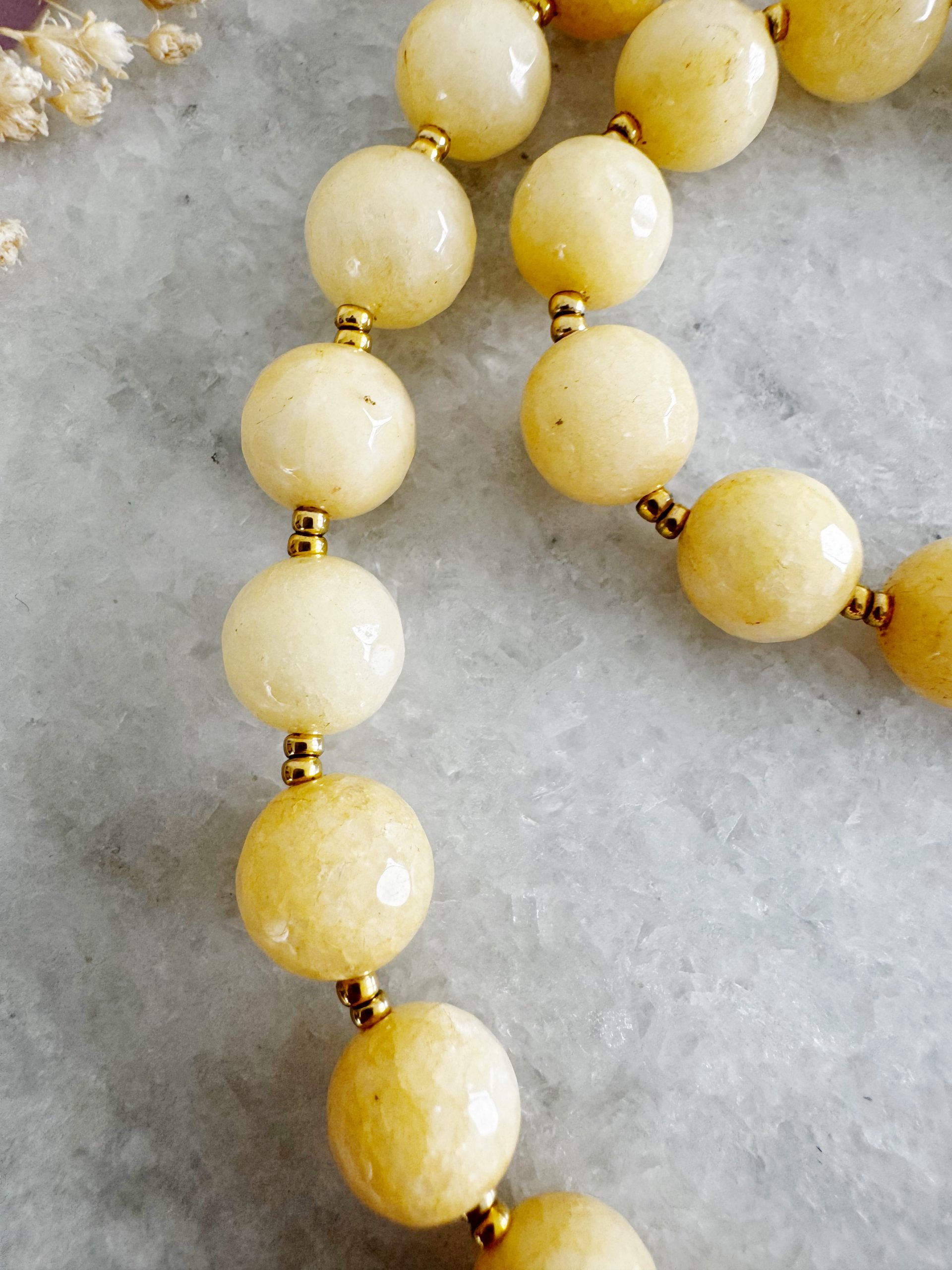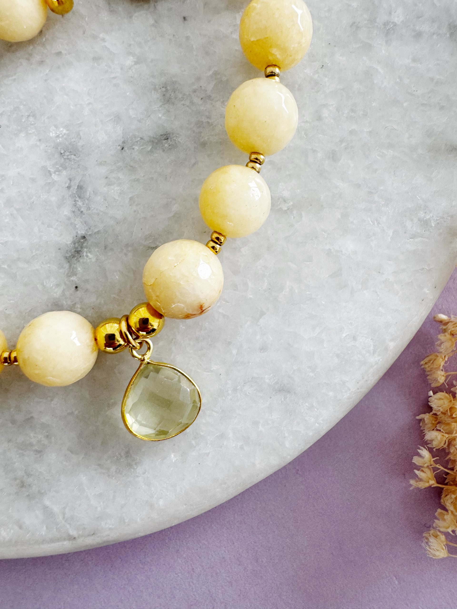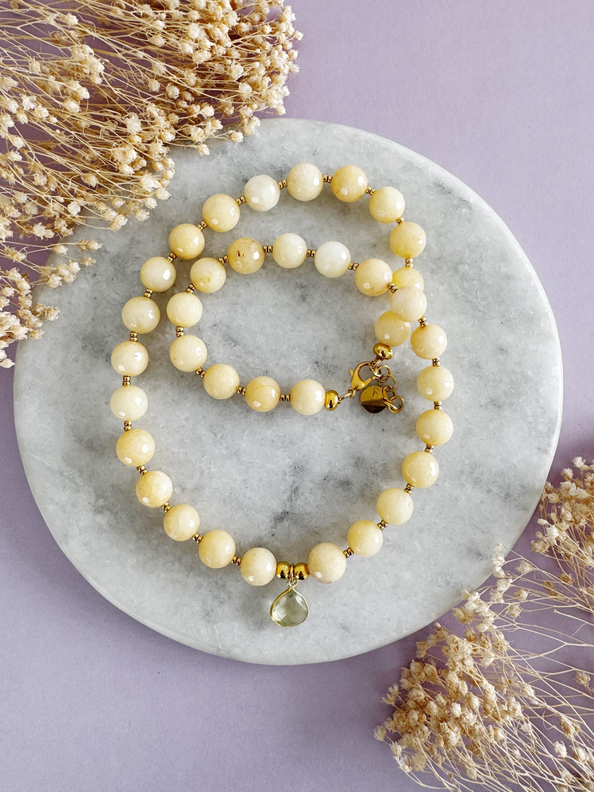 Süßer als Honig: Die 10mm Perlen aus Jade in einem herbstlichen Gelb-Ton. Gepaart mit goldigen Details, einem Frontverschluss und einem Anhänger aus Catrin.