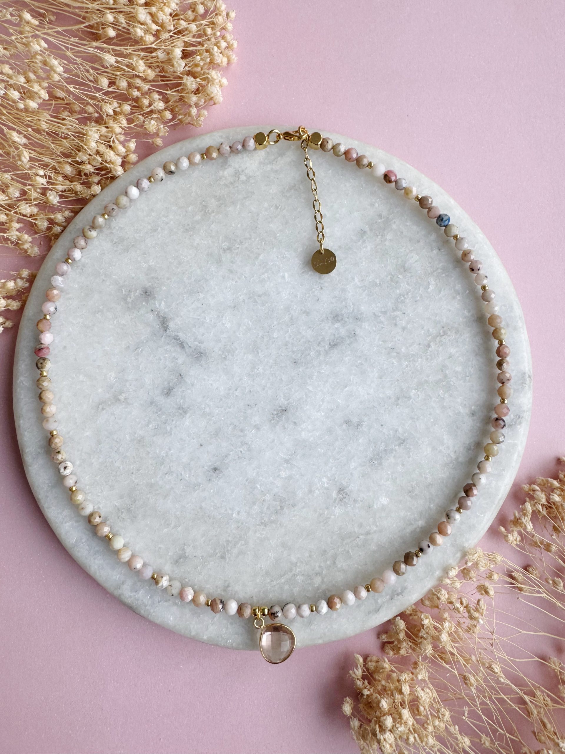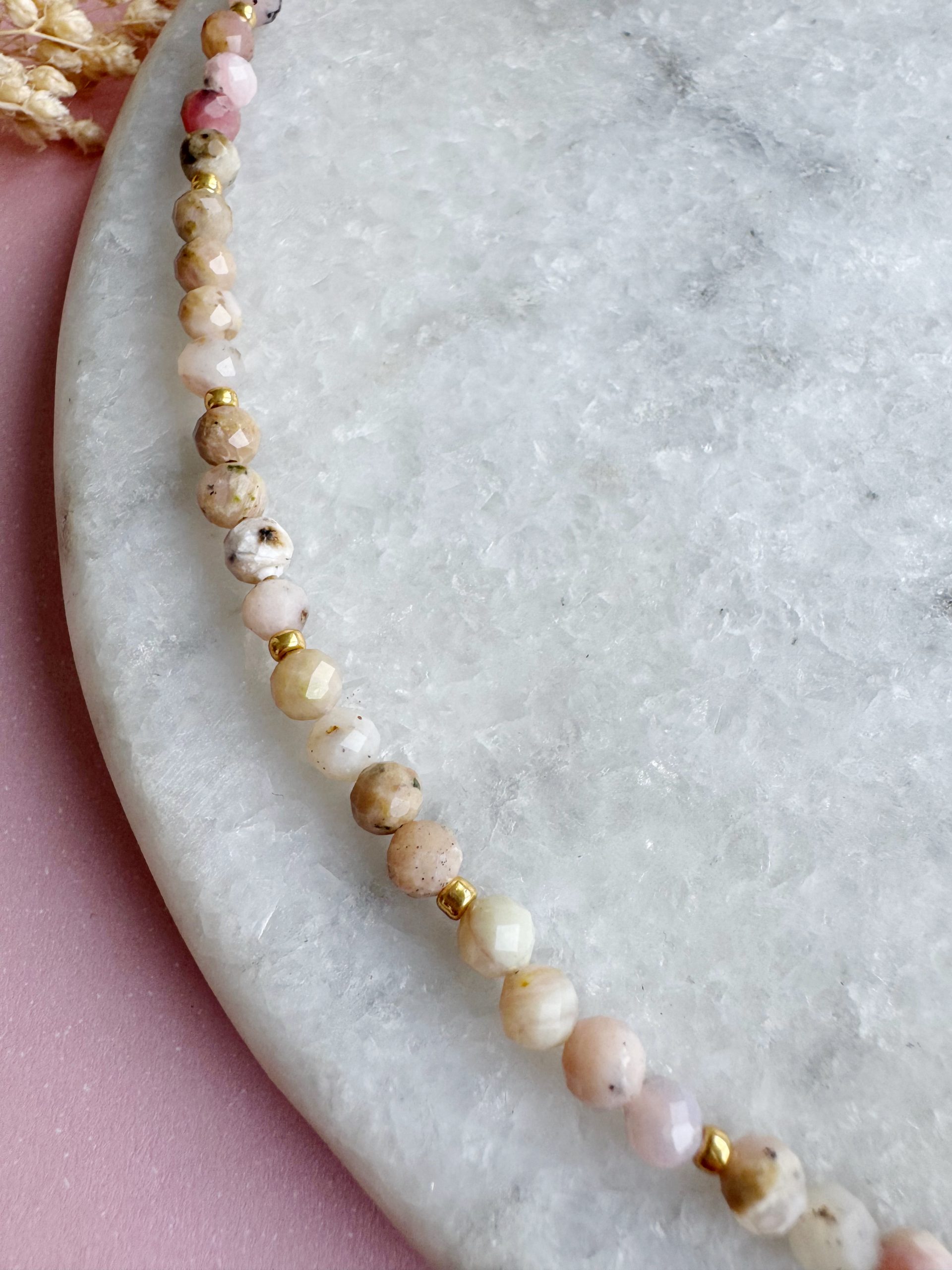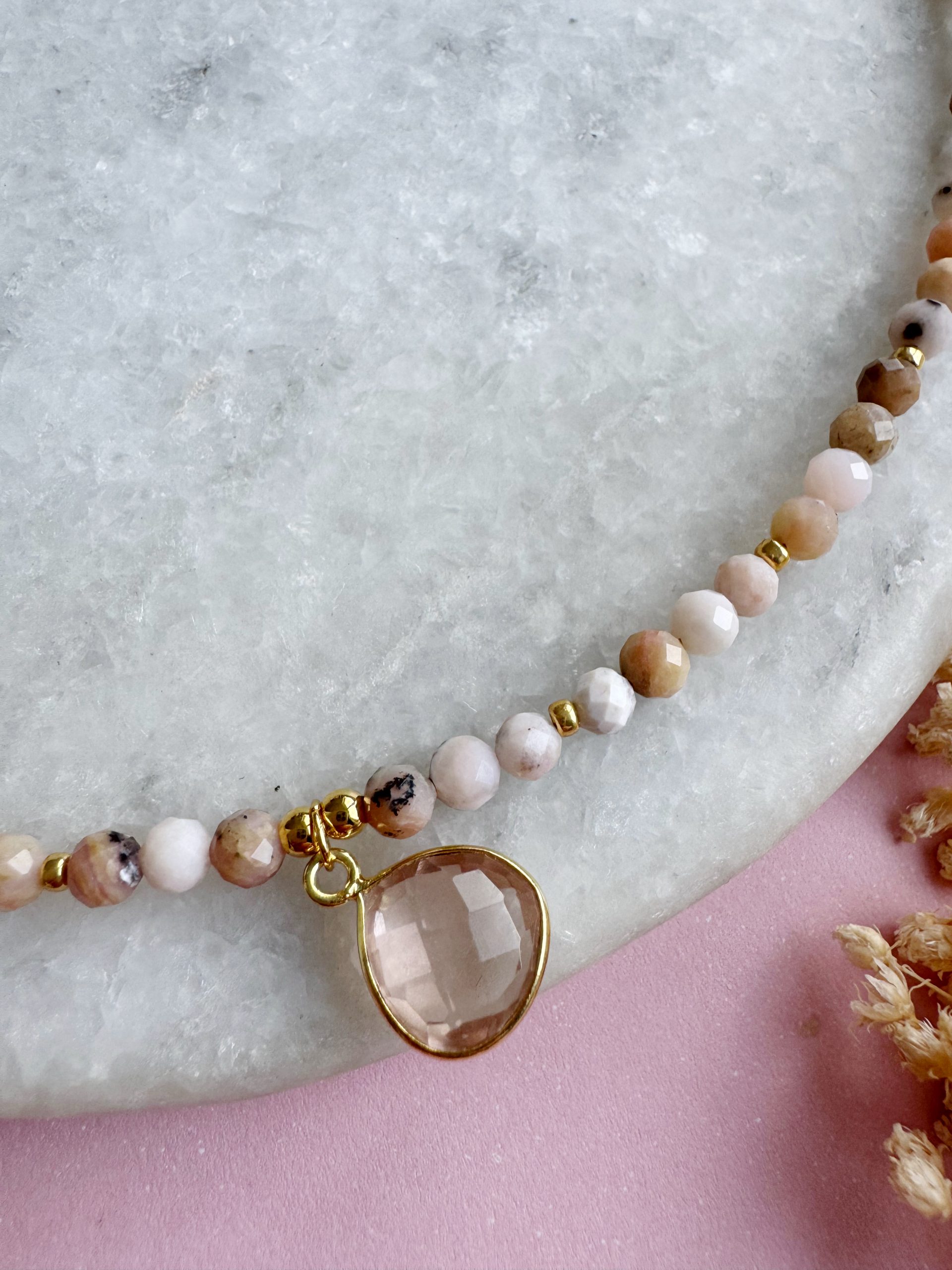 Schöner wird es nicht. Die Pinkopal-Kette aus facettierten 4mm kleinen Steinen kommt gepaart mit einem Anhänger aus einem wunderschönen Rosenquarz und goldigen Details.