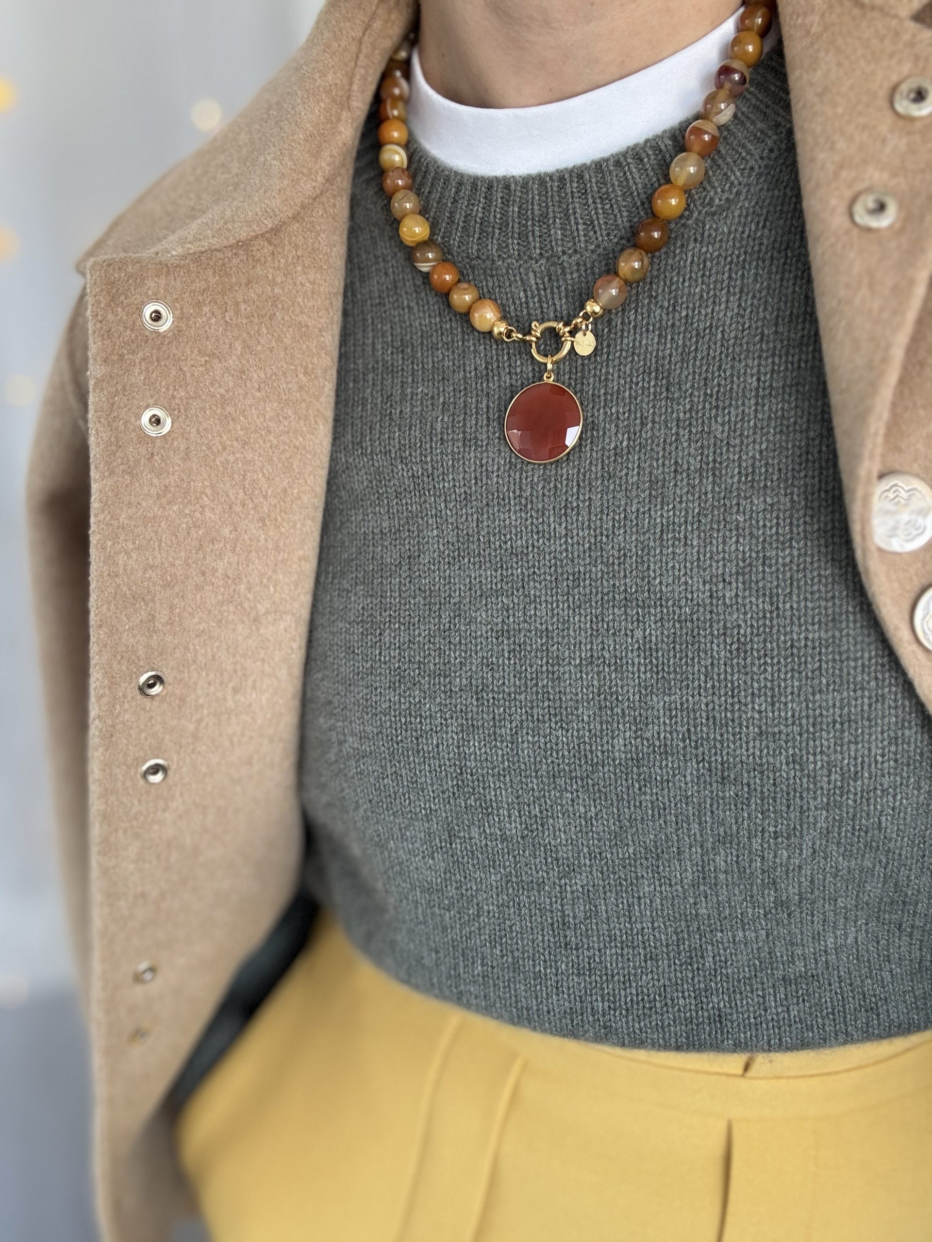 Aperol-Spritz für den Hals: „Orange Garden“ beeindruckt nicht nur mit seinen großen, Achatperlen, sondern auch mit seinem knalligen Orange. Passend dazu: Feine Golddetails und ein Anhänger aus farblich passendem Aventurin.