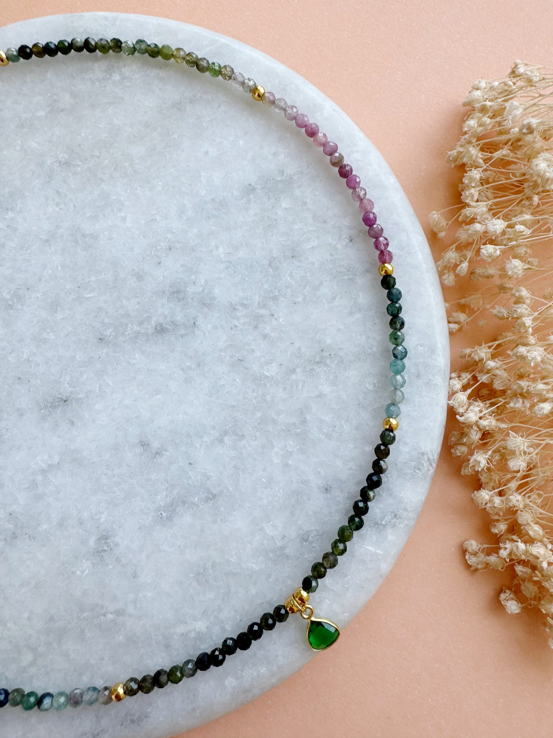 Zarte Kette in einem pink-grün-blau Ton. Der 3mm Turmalin mit einem passenden Anhänger aus grünem Onyx strahlt Sommer aus. Feine goldige Details und ein markanter Verschluss runden den Look ab.