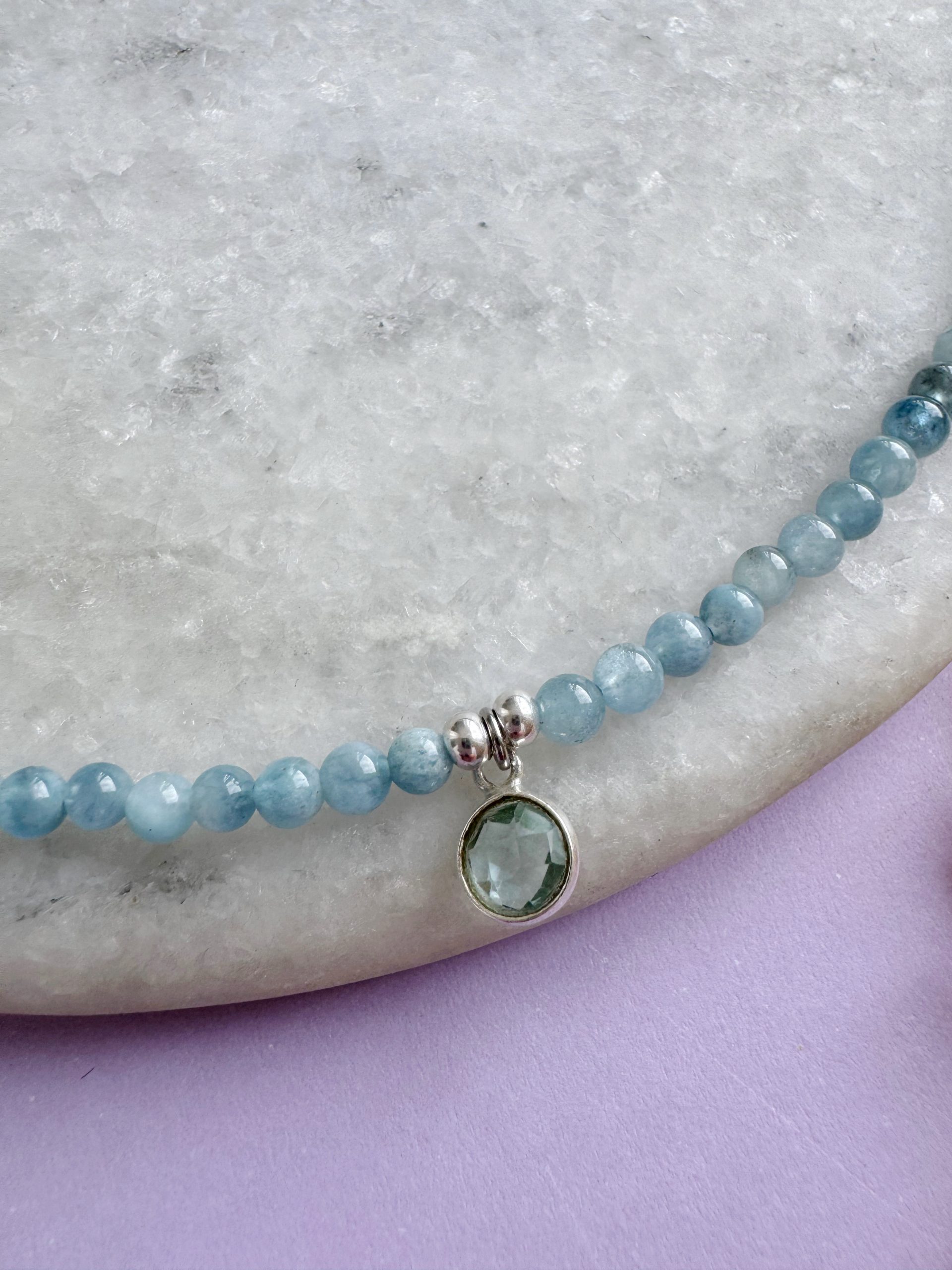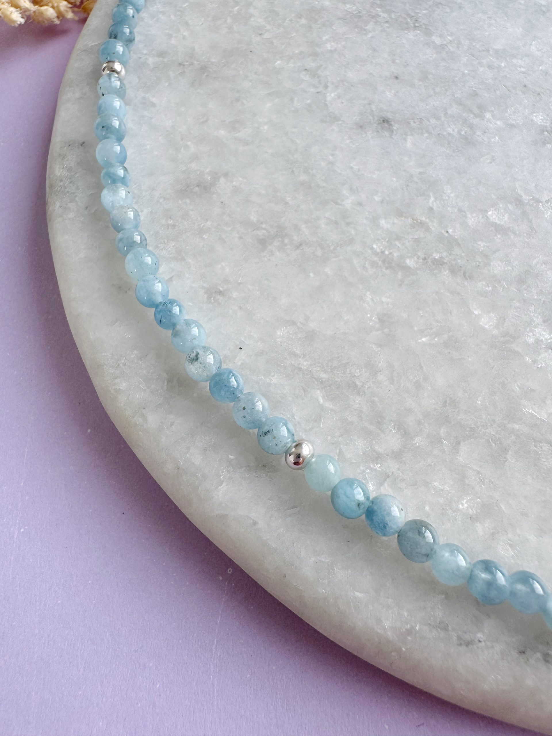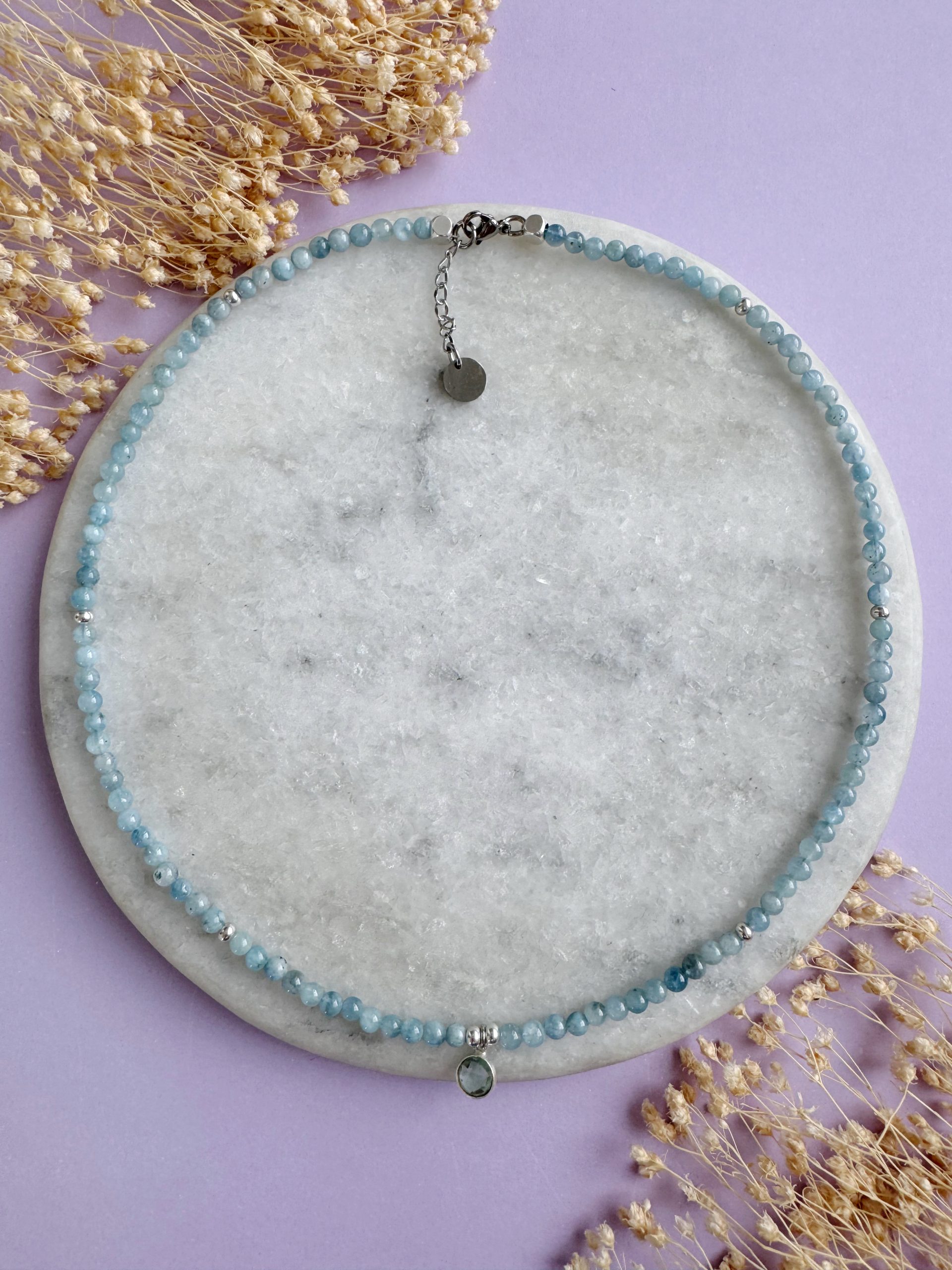 Hellblau: Die feinen 3 mm Perlen aus Aquamarin sind der Hingucker diese Saison. Sie werden durch kleine silbrige Details und einen farblich passenden Anhänger ergänzt und sind ein traumhaftes Accessoire zu jeder Saison.