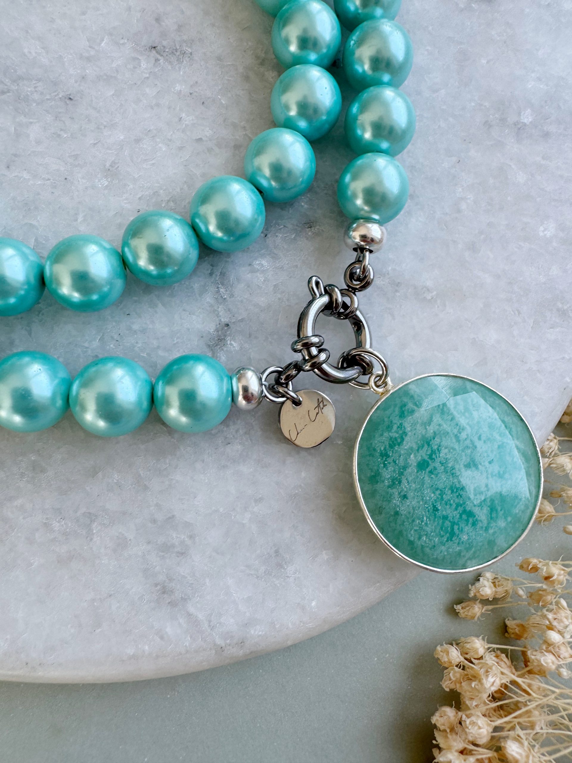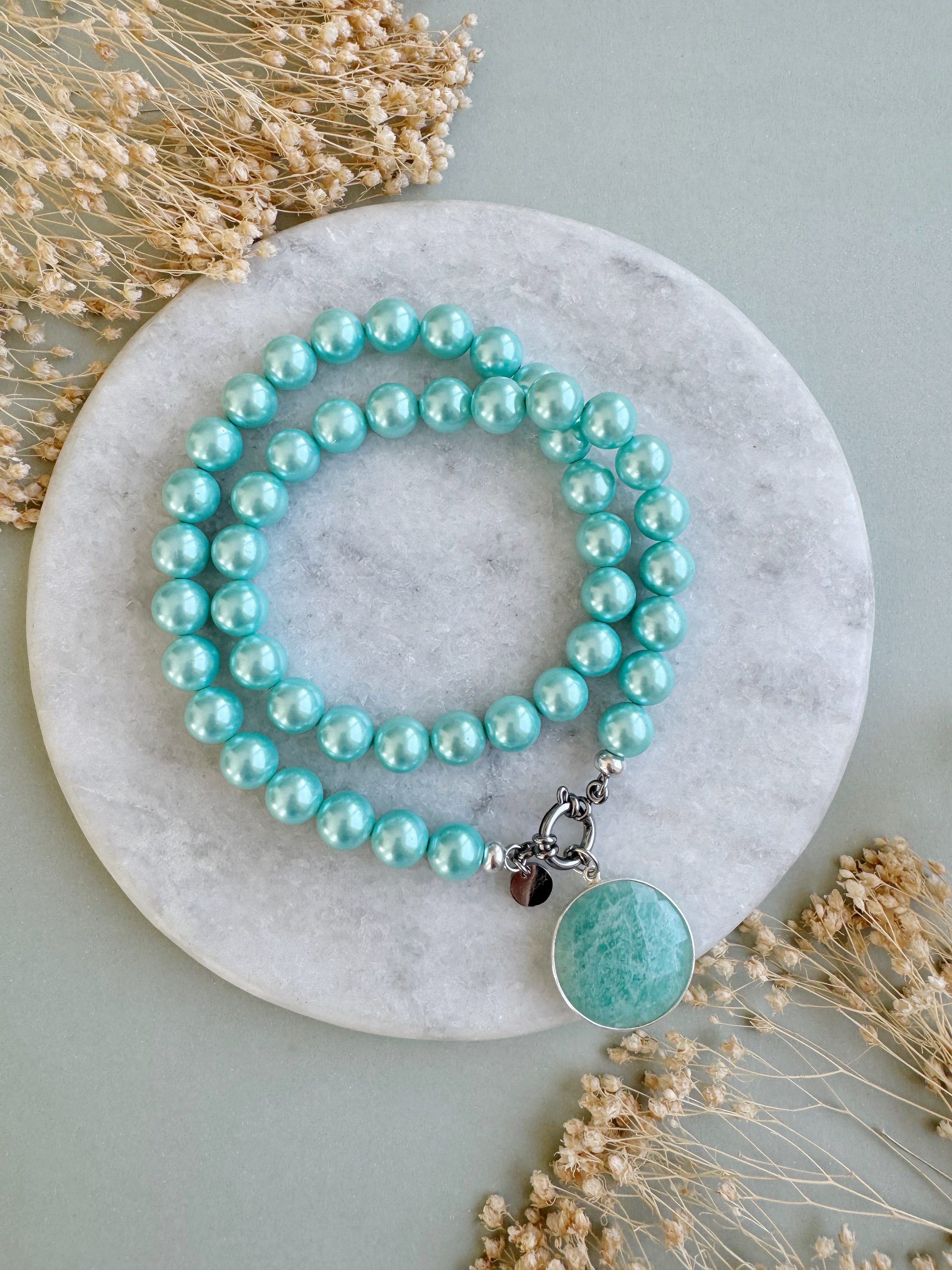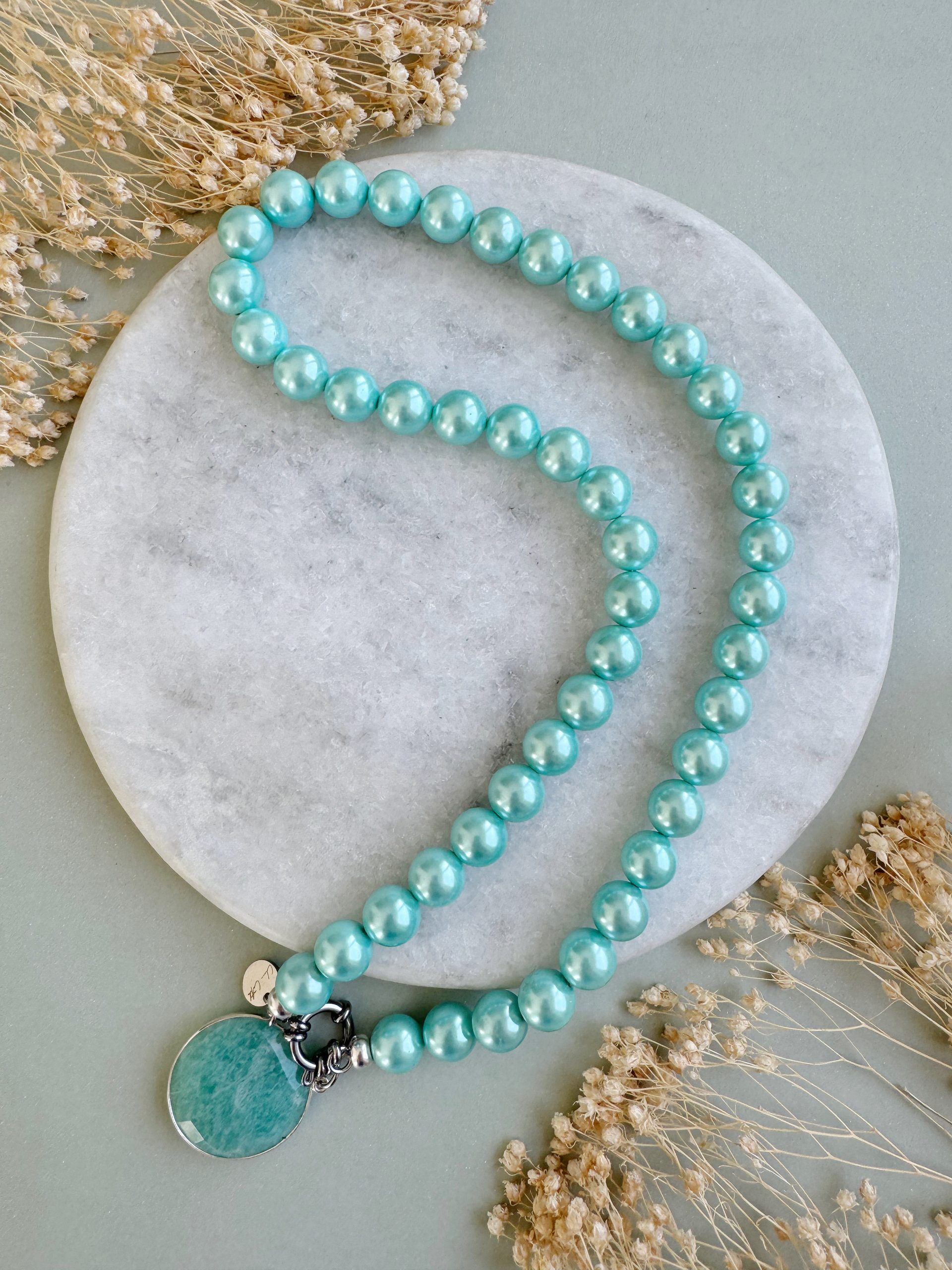 „The Azzurro“ zeigt sich als Traum vom grünblauen Karibikmeer. Die feinen Muschelkernperlen reihen sich in ihrem zarten Azur-Ton auffällig um den Hals. Perfekt als einzelne Kette oder im Layering mit feineren Produkten, z.B. aus rostfreiem Edelstahl.