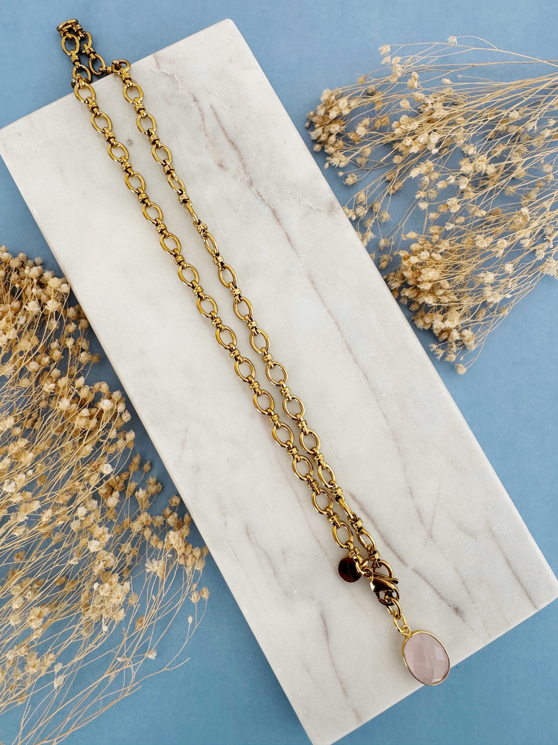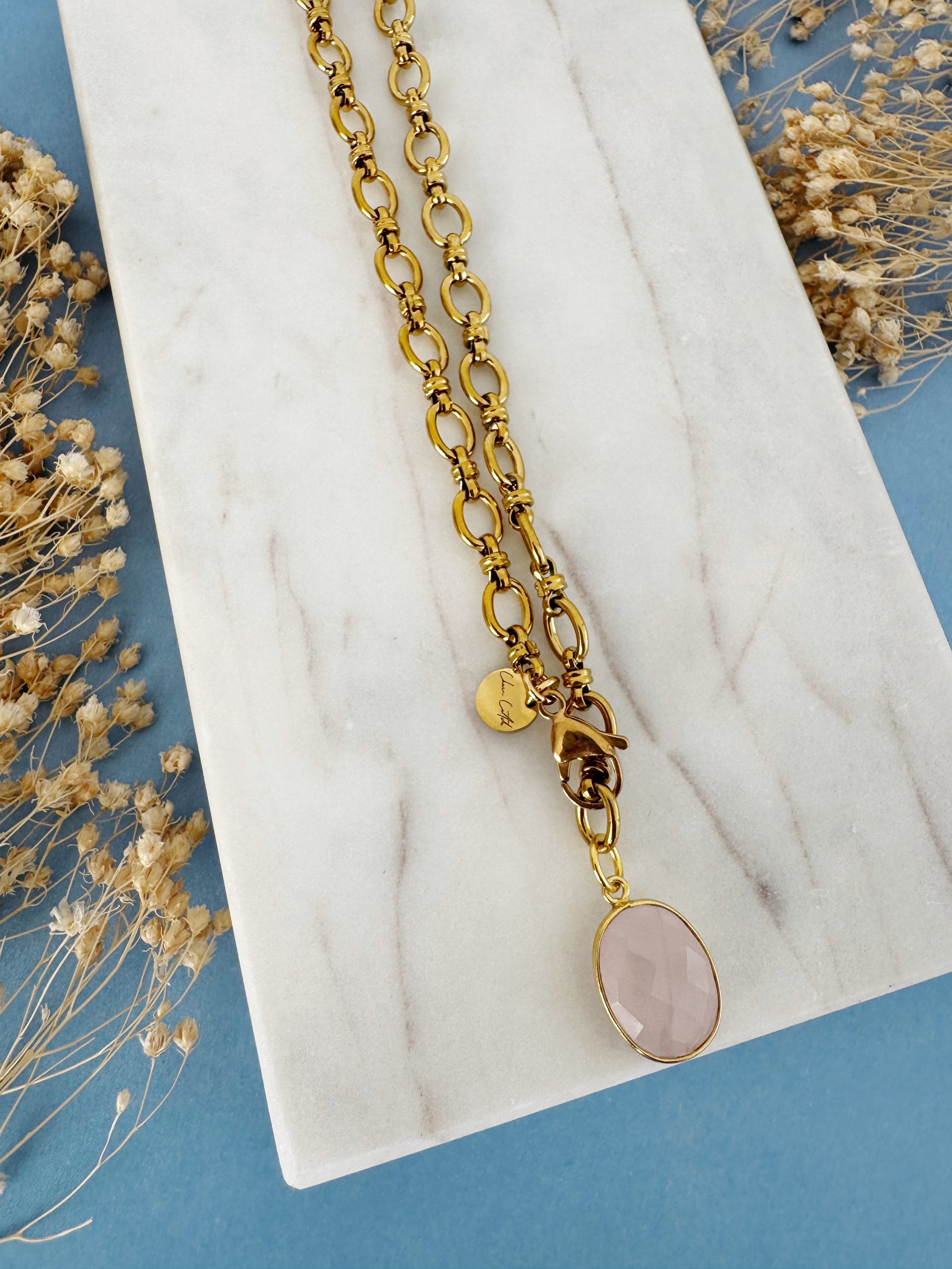 Bei „The Blush“ trifft eine markante Gliederkette auf die Farbe Rosé. Eyecatcher ist der große Anhänger aus Rosenquarz.