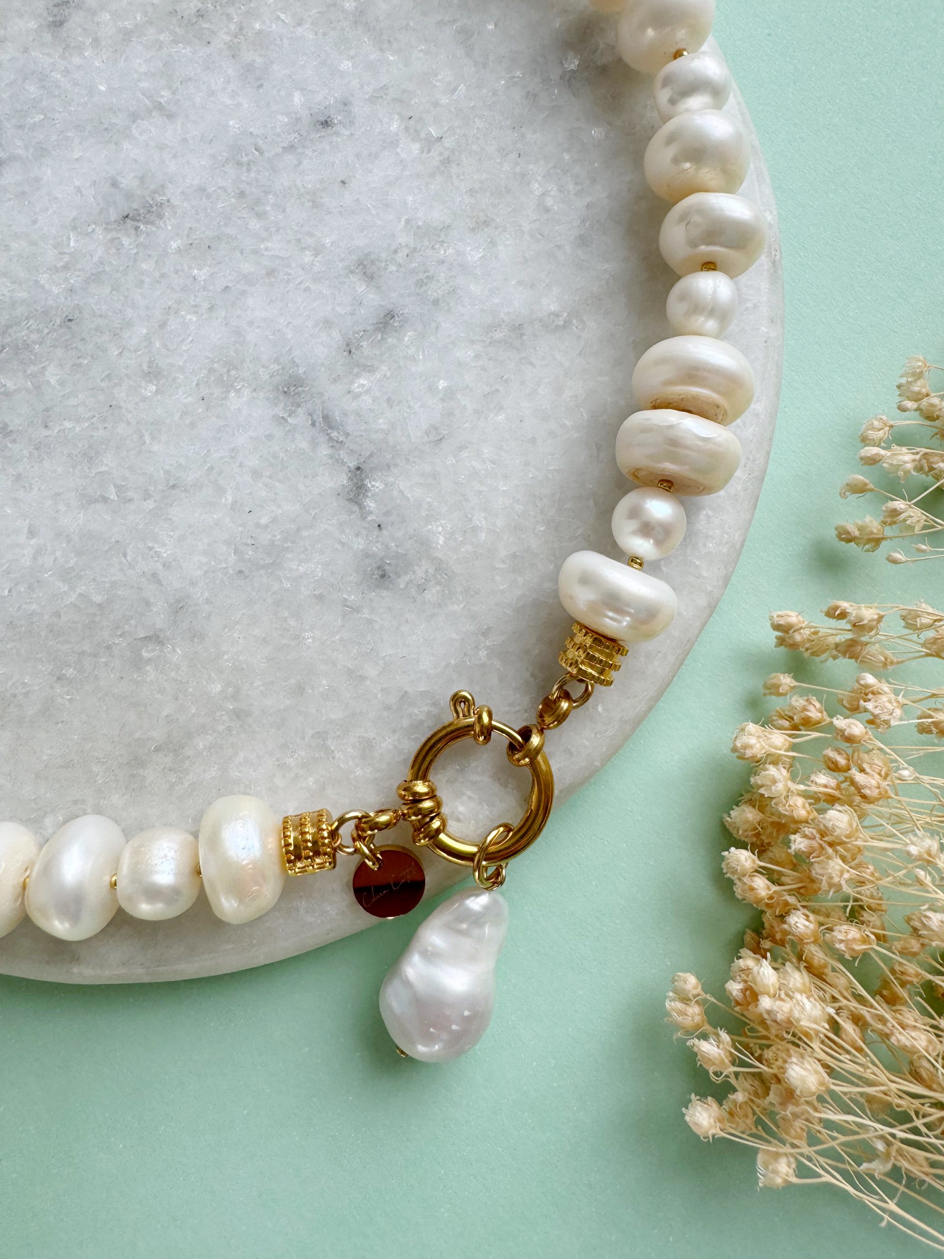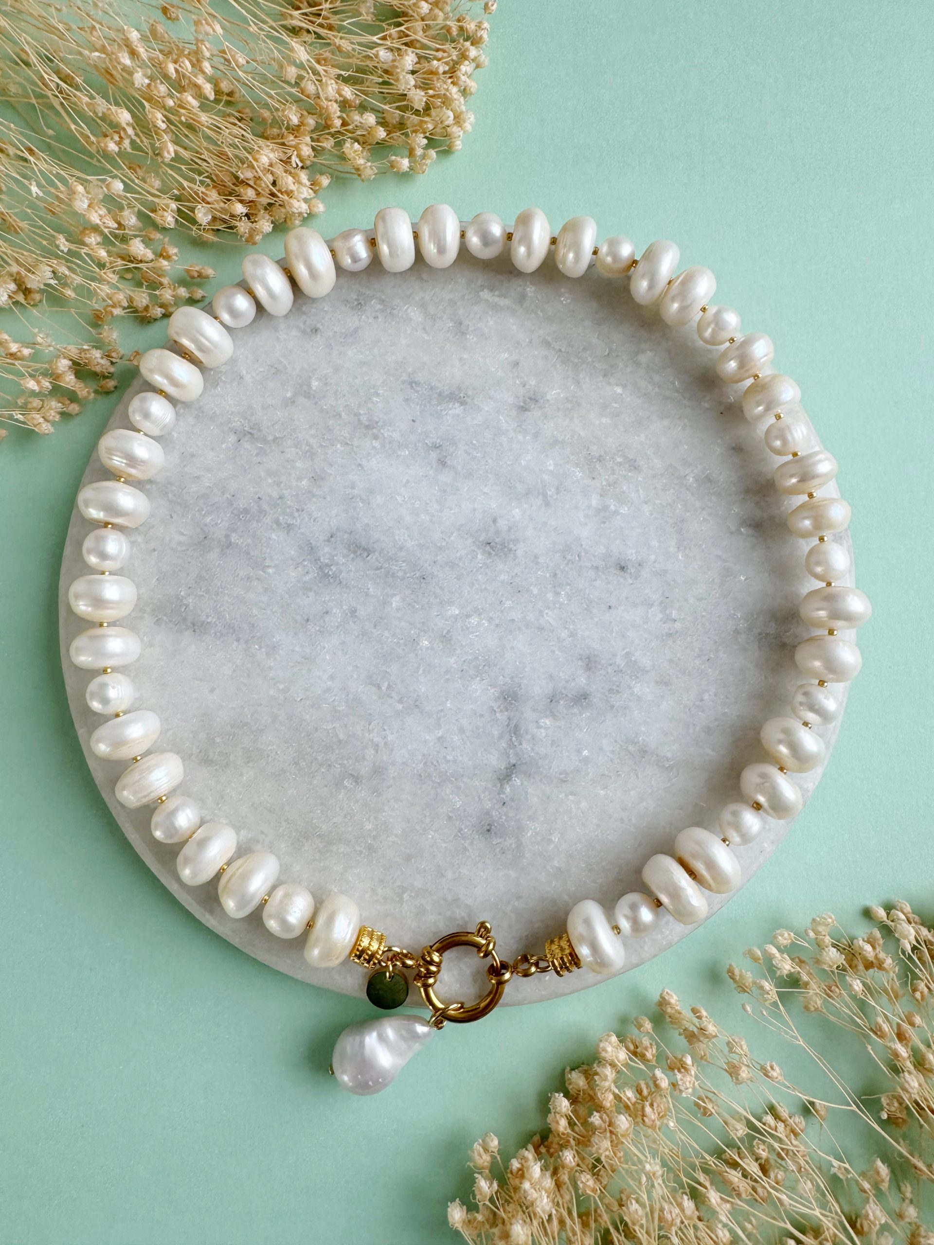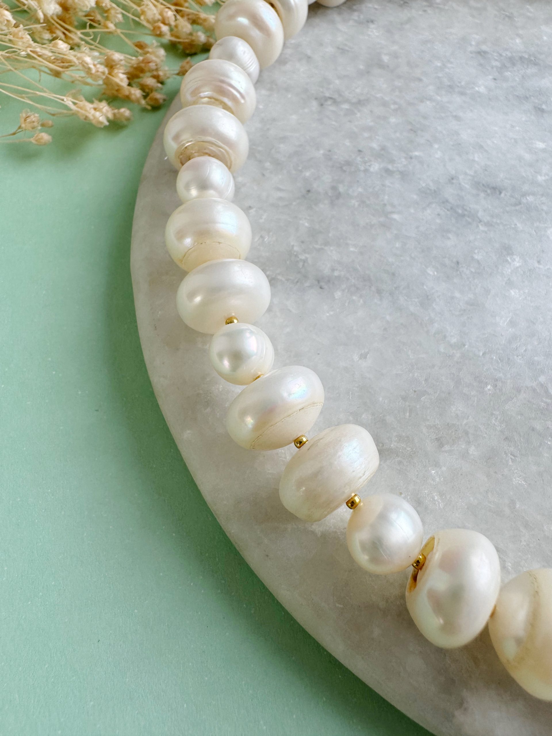 Süßwasserperlen werden in Seen oder kleinen Flüssen aufwändig in Naturmuscheln gezüchtet. Komplett runde Exemplare findet man dabei nur sehr selten. Weitaus häufiger treten sie in ihrer Naturform auf, die entfernt an große Reiskörner erinnert. Größe und Form variieren dabei ebenso wie die Farbgebung. Allen Süßwasserperlen gemeinsam ist aber ihr feiner Perlmuttschimmer, der je nach Lichteinfall unterschiedliche Farben widerspiegelt.