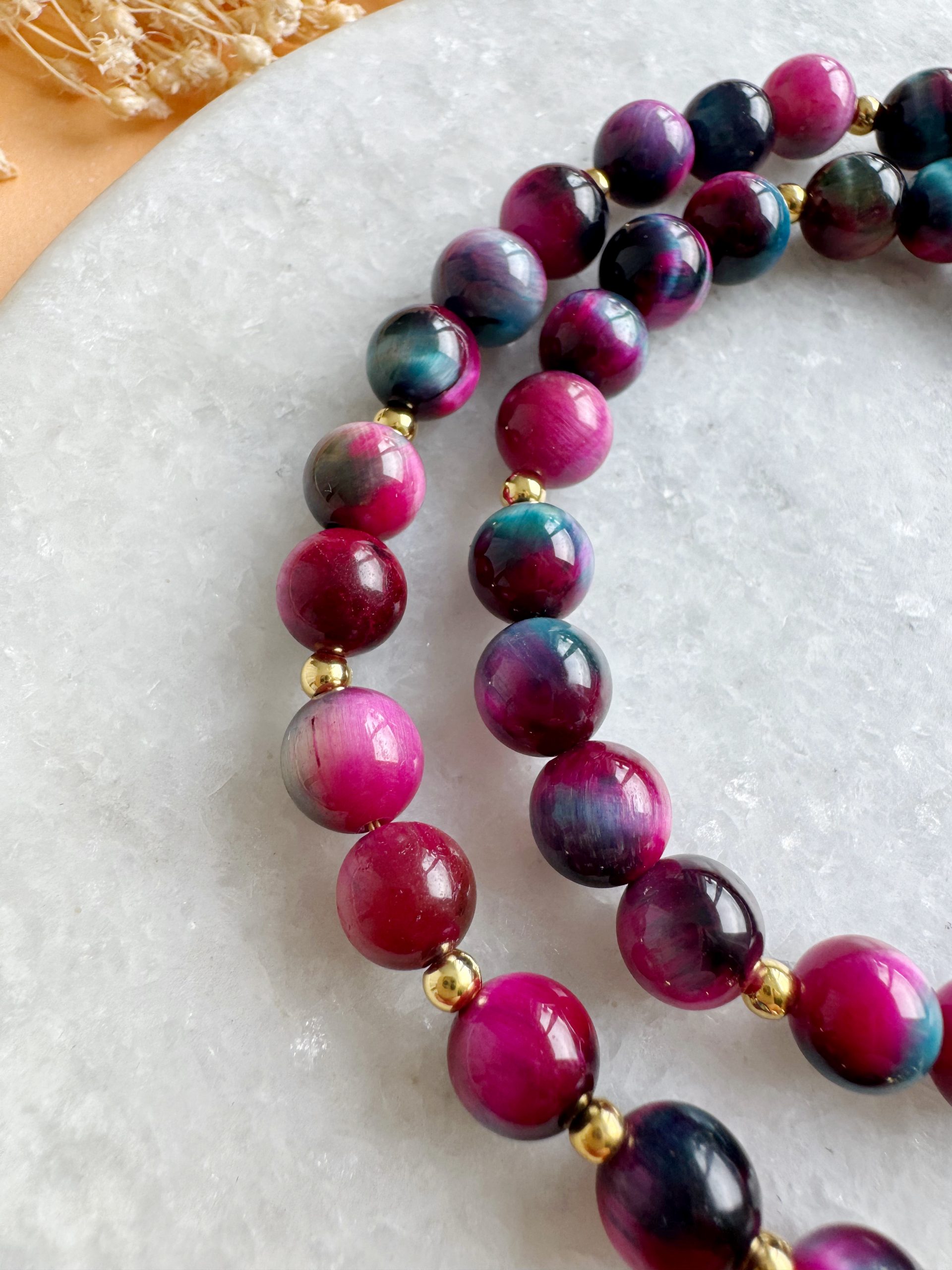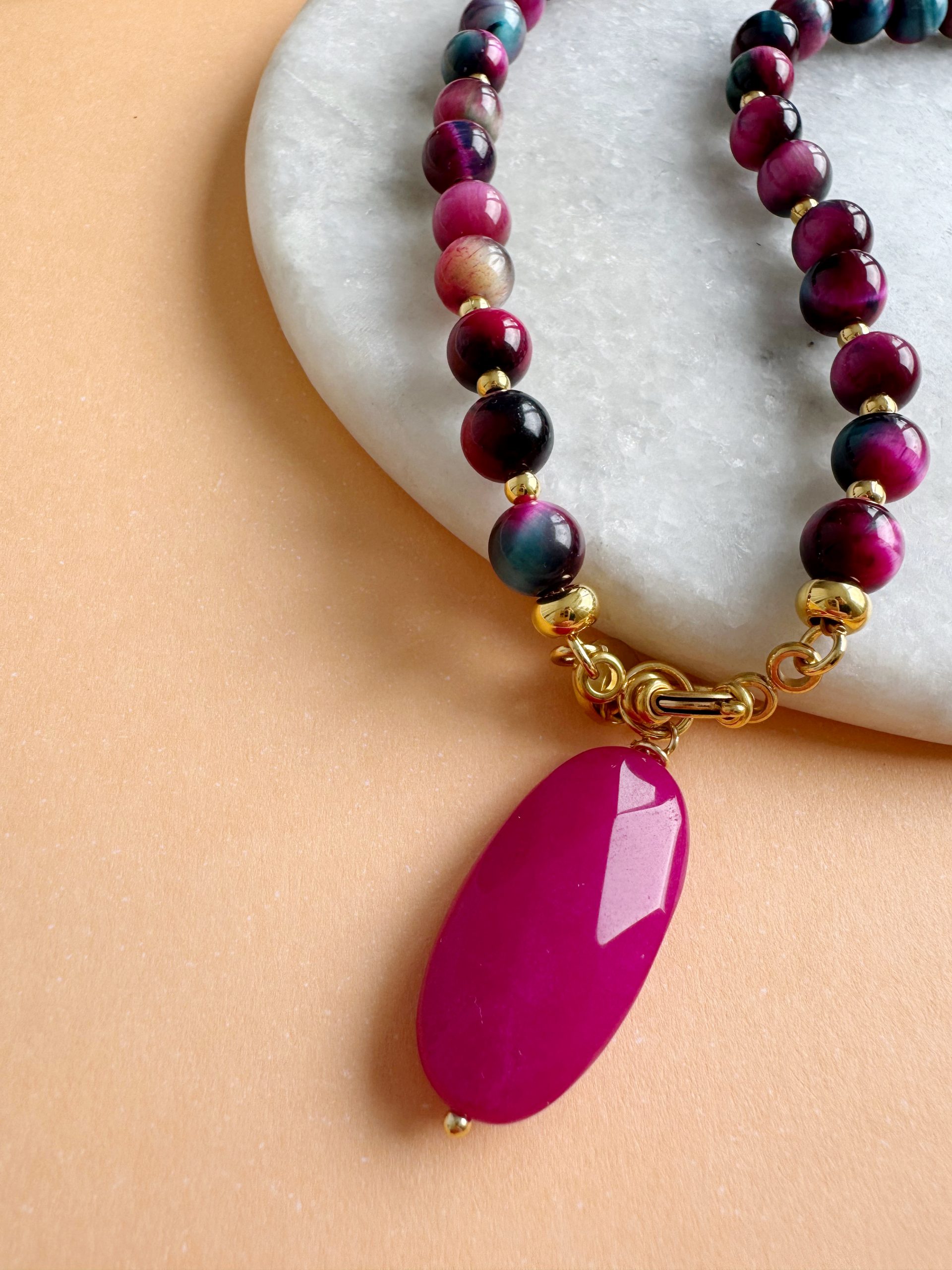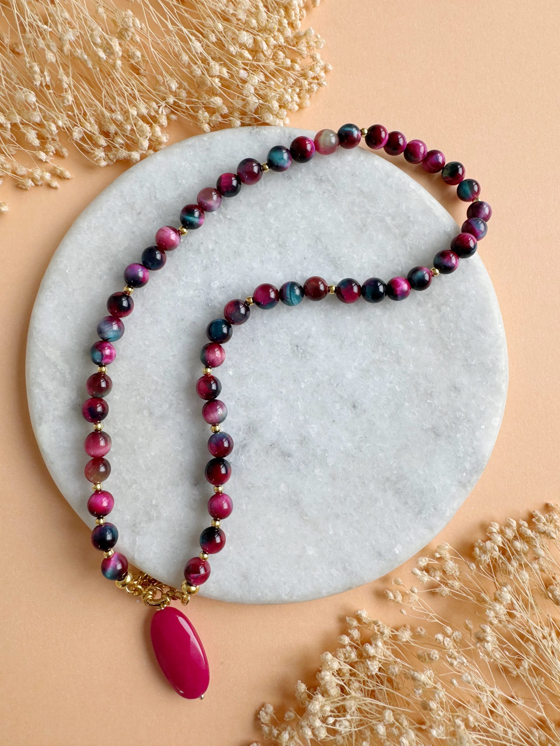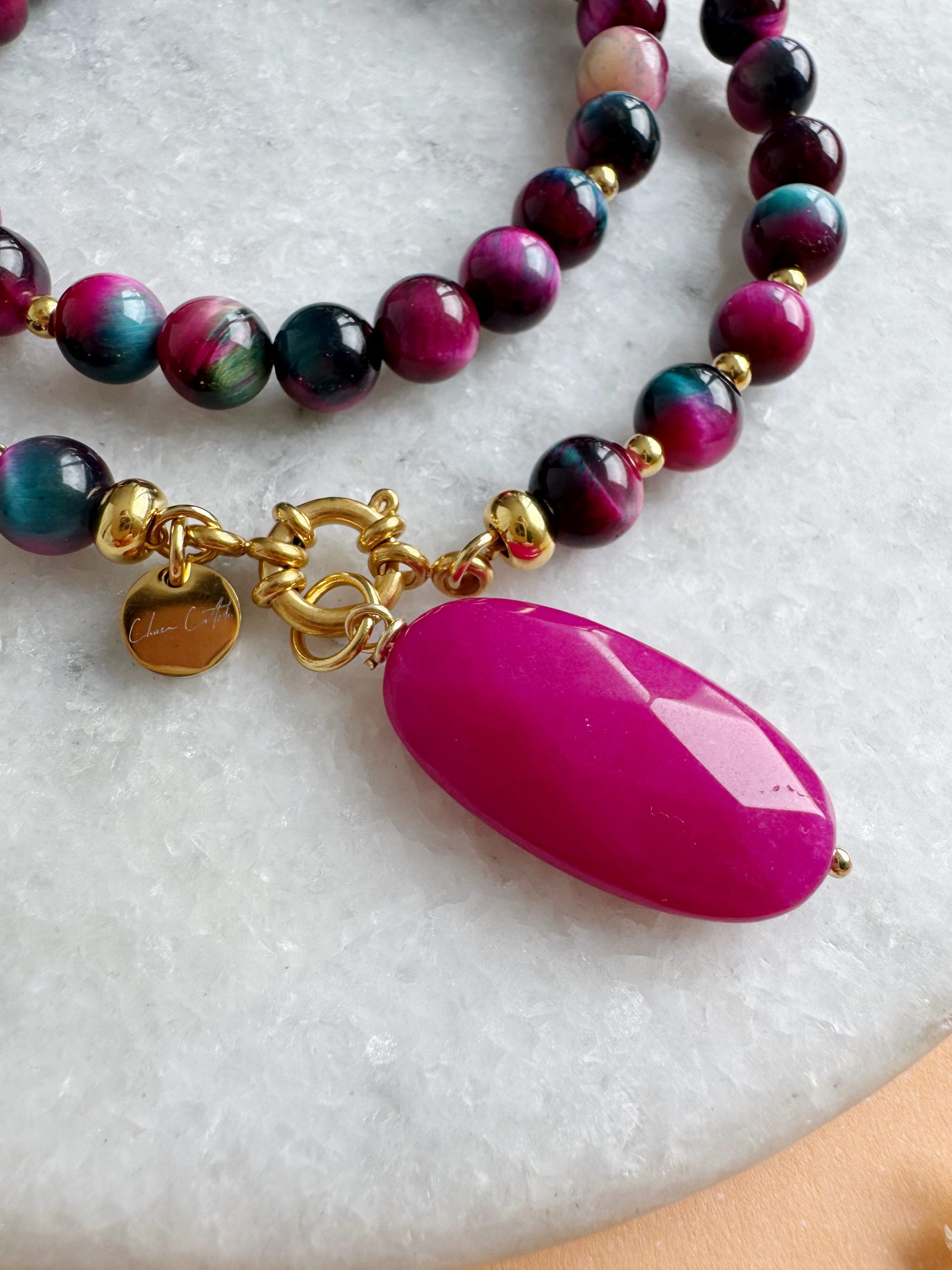 Pink-Magenta-Grün und Oho: „Cranberry“ kommt in 8mm Tigerauge, goldigen Details und einem Anhänger aus Jade.