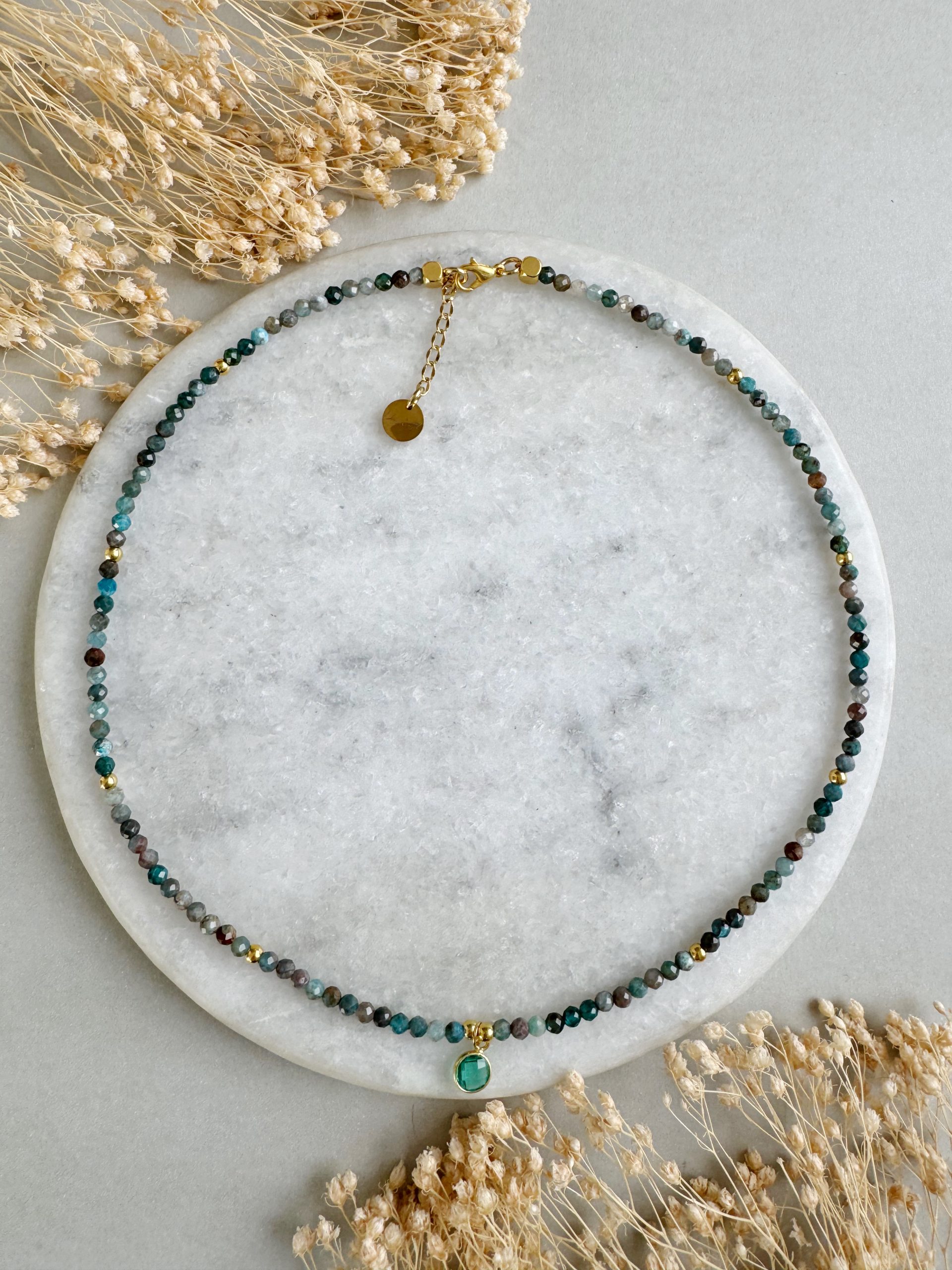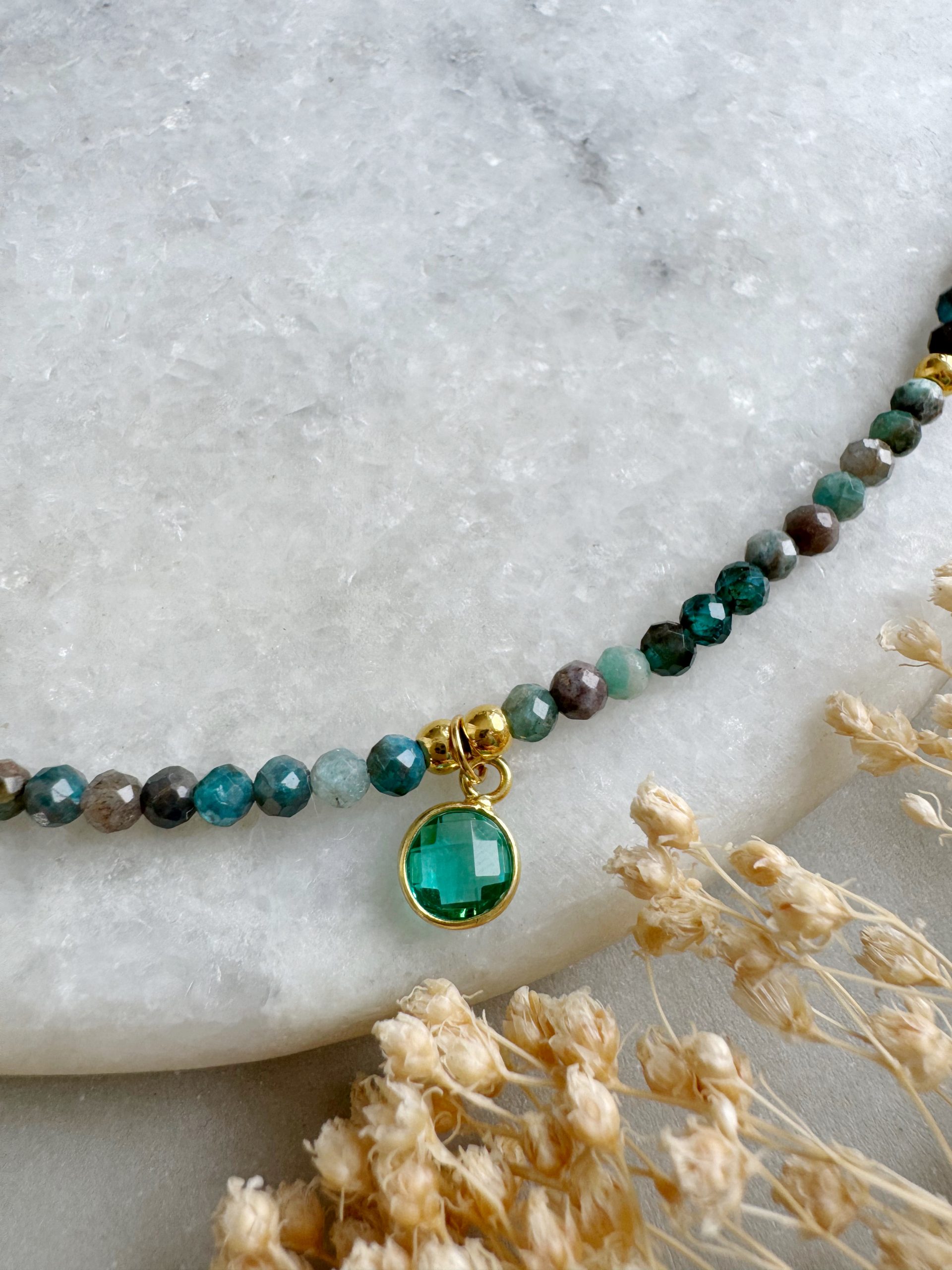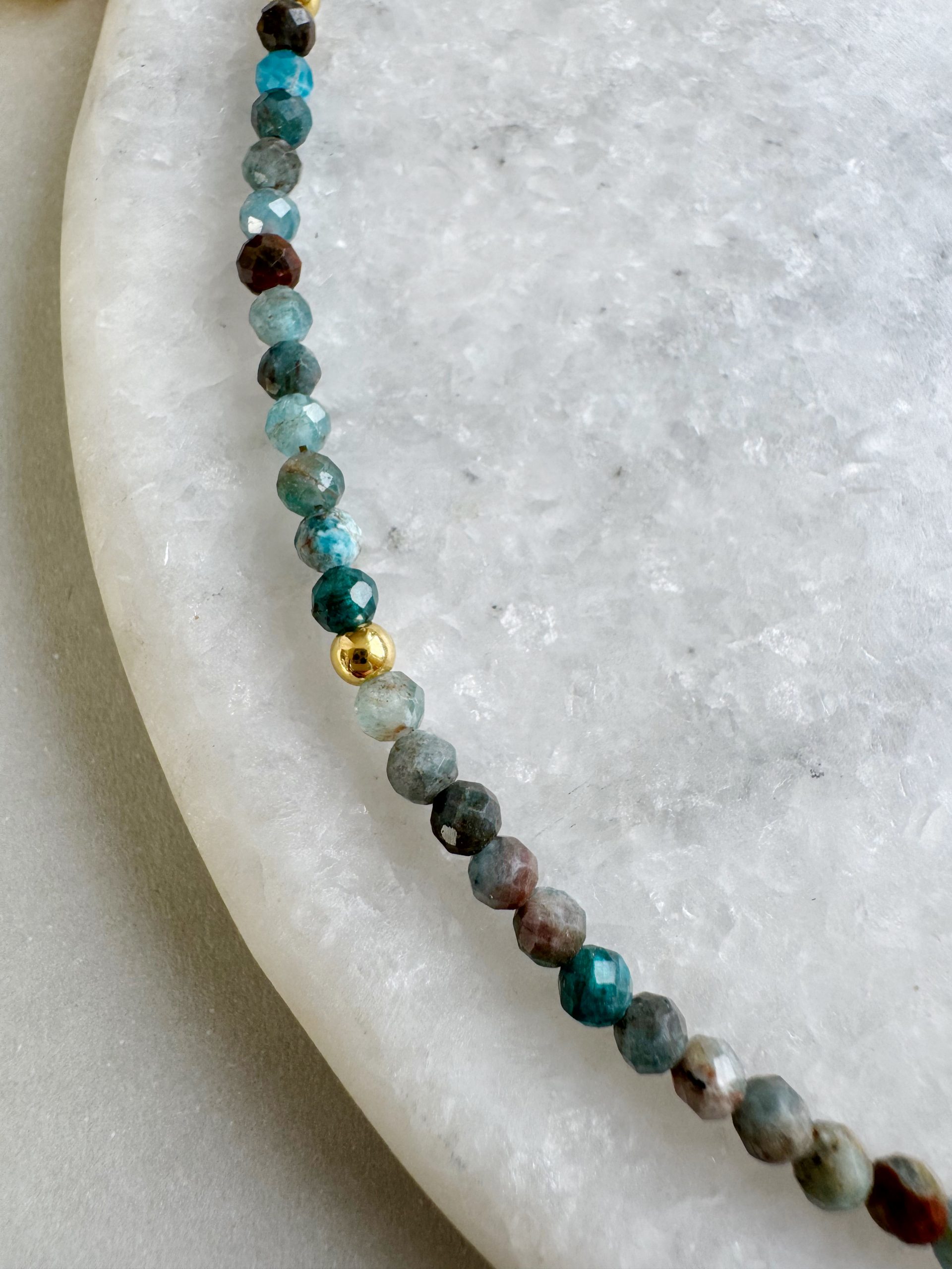 „The Dawn“ ist eine zarte, facettierte Apatit-Perlen mit einem Anhänger aus Topas. Die Metallelemente aus rostfreiem Edelstahl machen jeden Trageausflug mit.