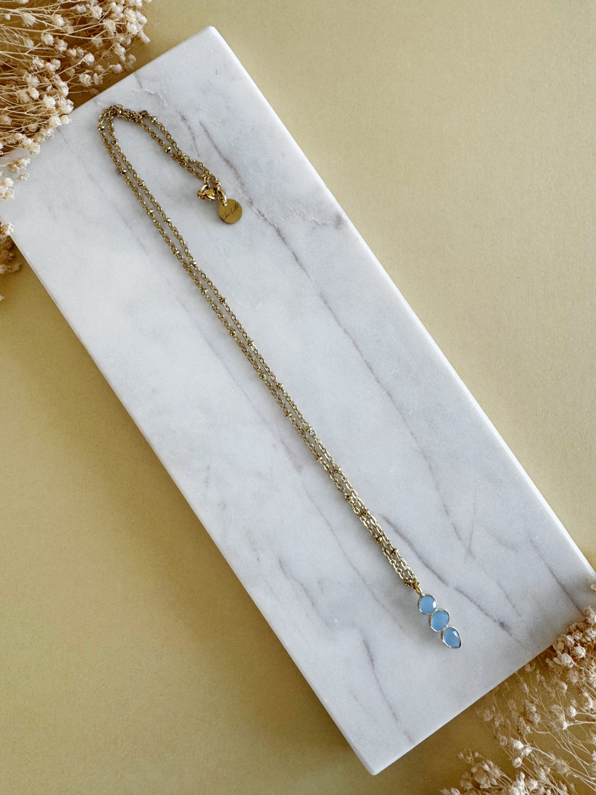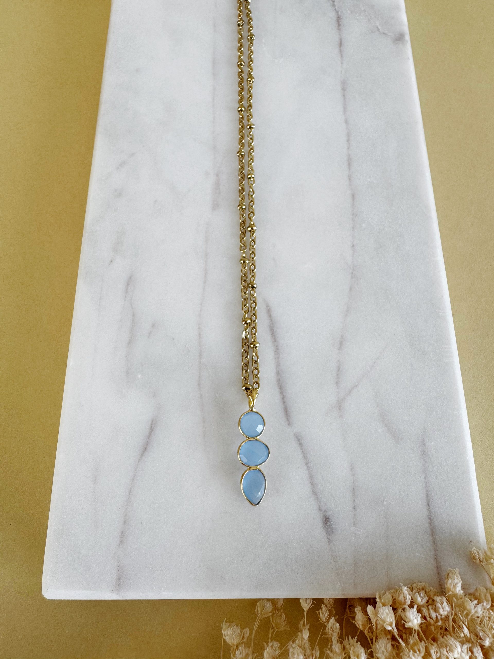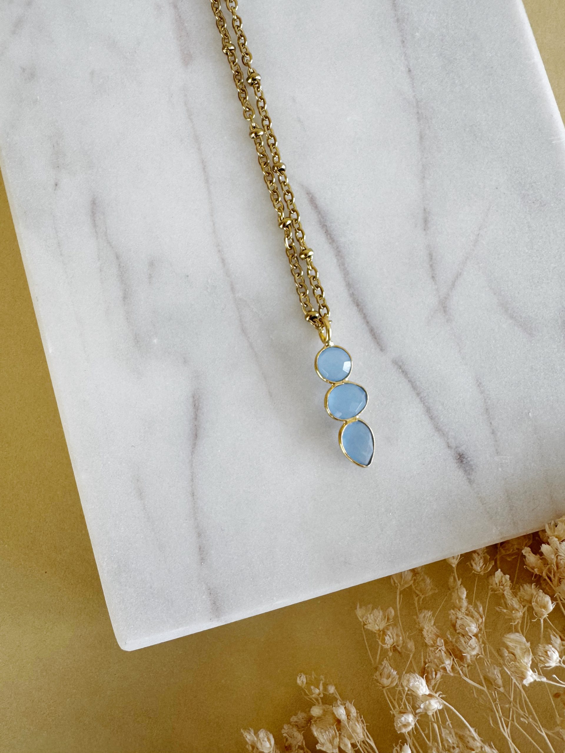 Blau in einem warmen Mantel aus Gold: „The Glacier“ überzeugt mit ihrem schlichten und edlen Design, sowie dem Eyecatcher aus blauem Chalcedon als Anhänger. Perfekter Begleiter für jeden Anlass.