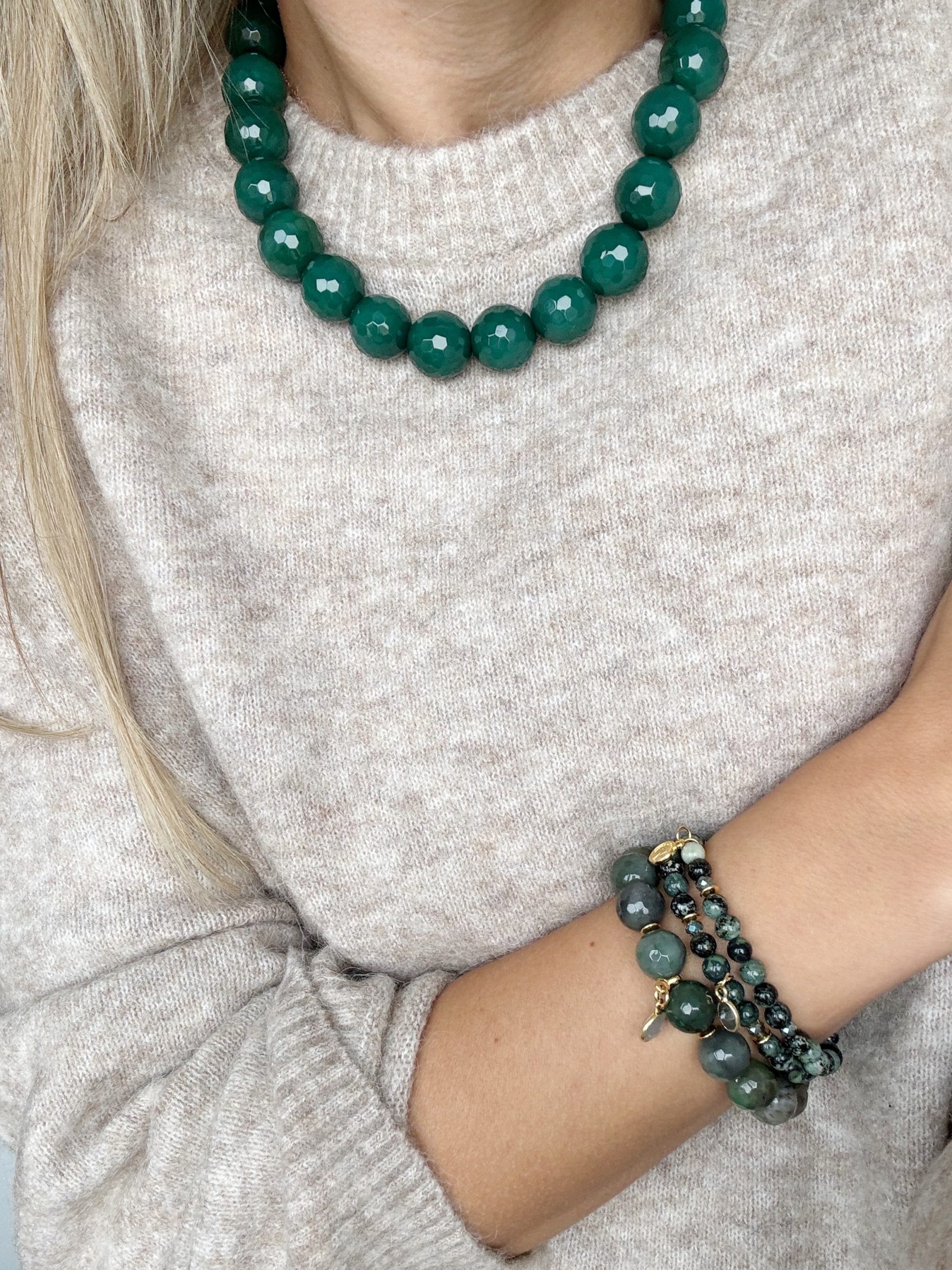 Für alle Grün-Anbeter: „The Green Isles“ kombiniert traumhafte extra große Jade-Perlen in Facett-Schliff und zart goldige Elemente. Ein Abenteuer für mutige Trägerinnen.