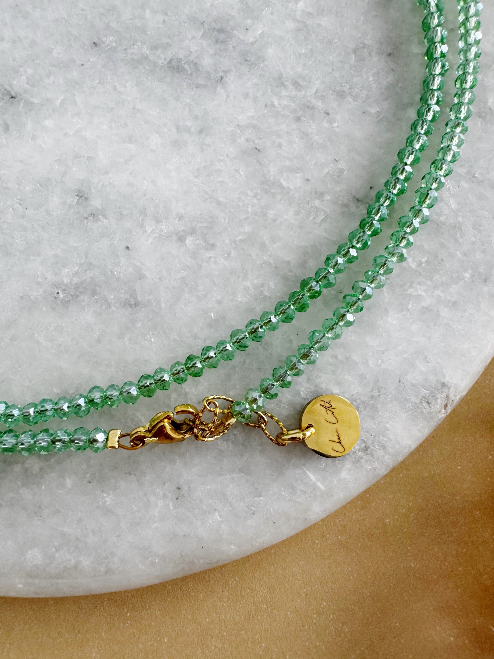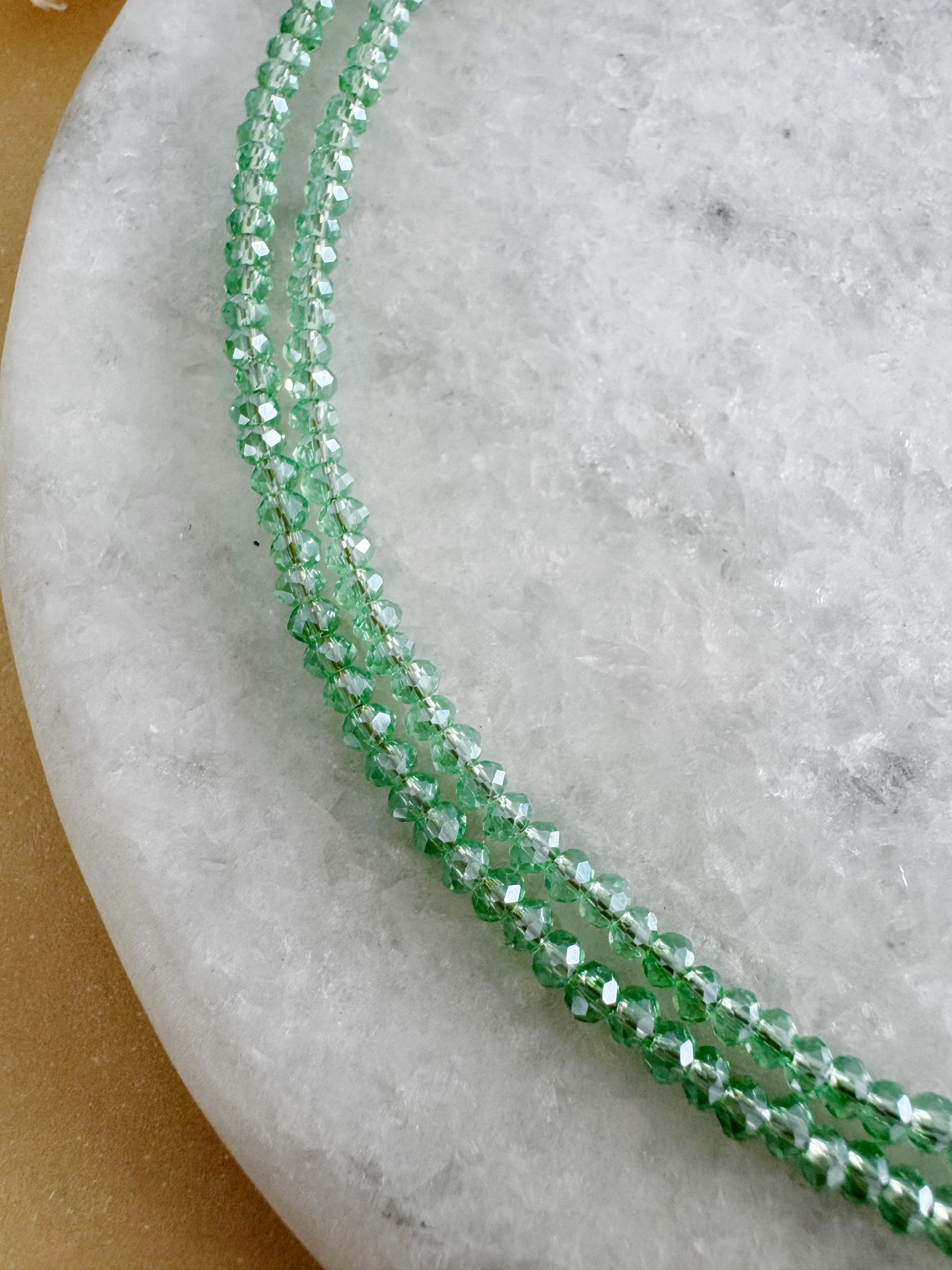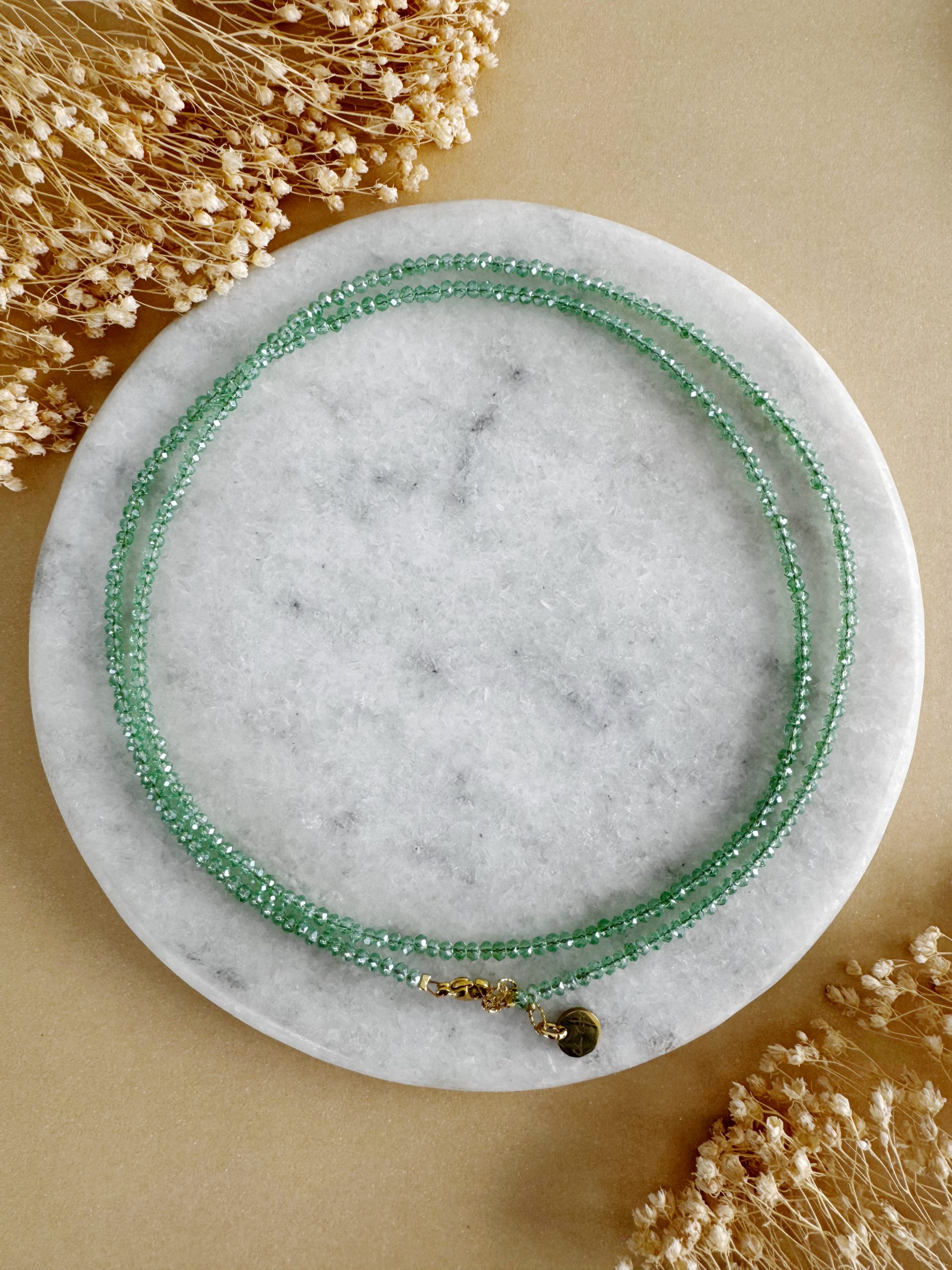 Es wird wieder Grün! „The Green Lights“ beeindruckt mit ihren glänzenden Glasperlen-Rondellen in hellem Grün. Dieses Modell kann wahlweise als Wickelkette oder als Langkette getragen werden. Metallelemente aus rostfreiem Edelstahl (vergoldet) sorgen für besondere Langlebigkeit.