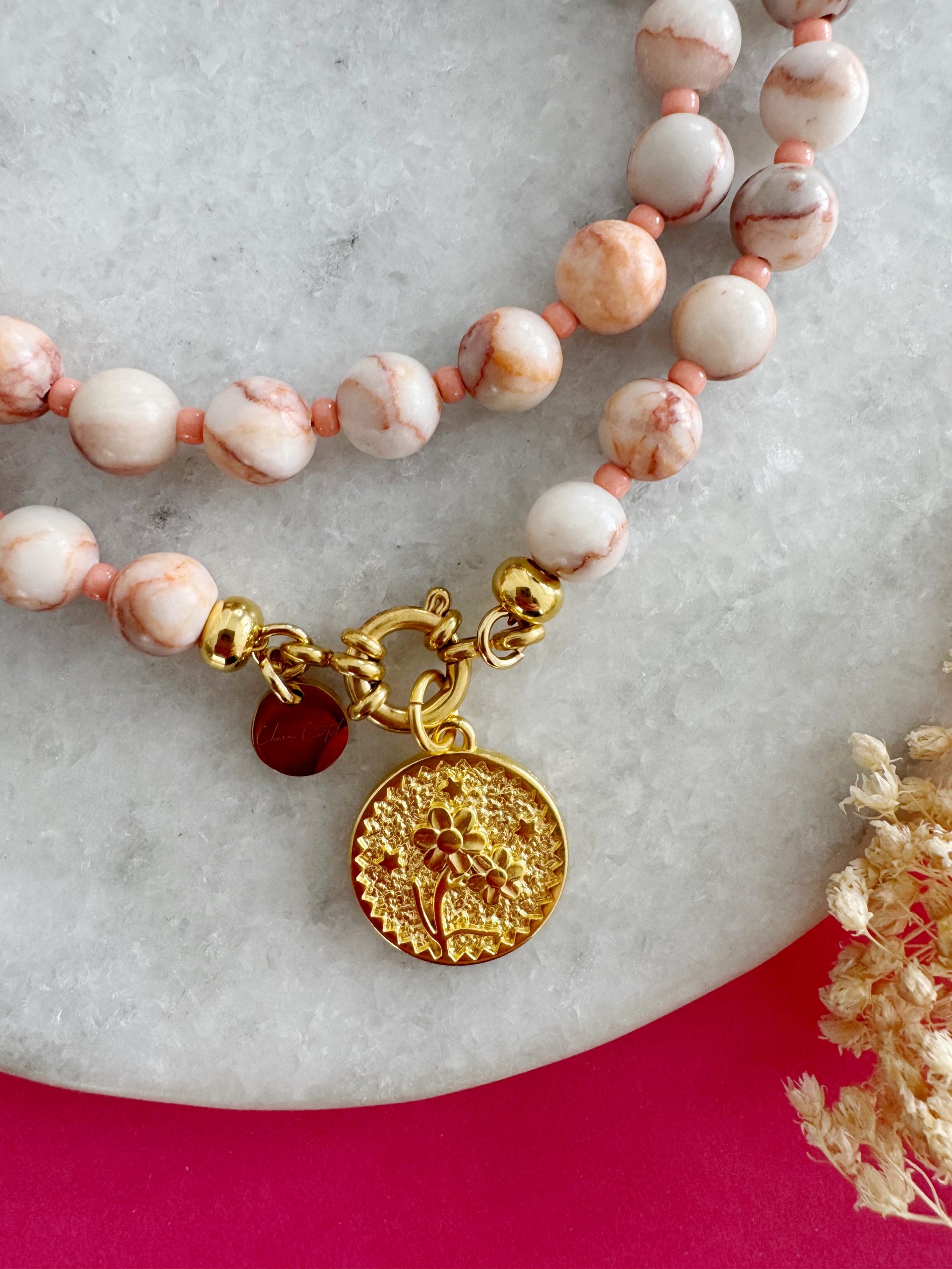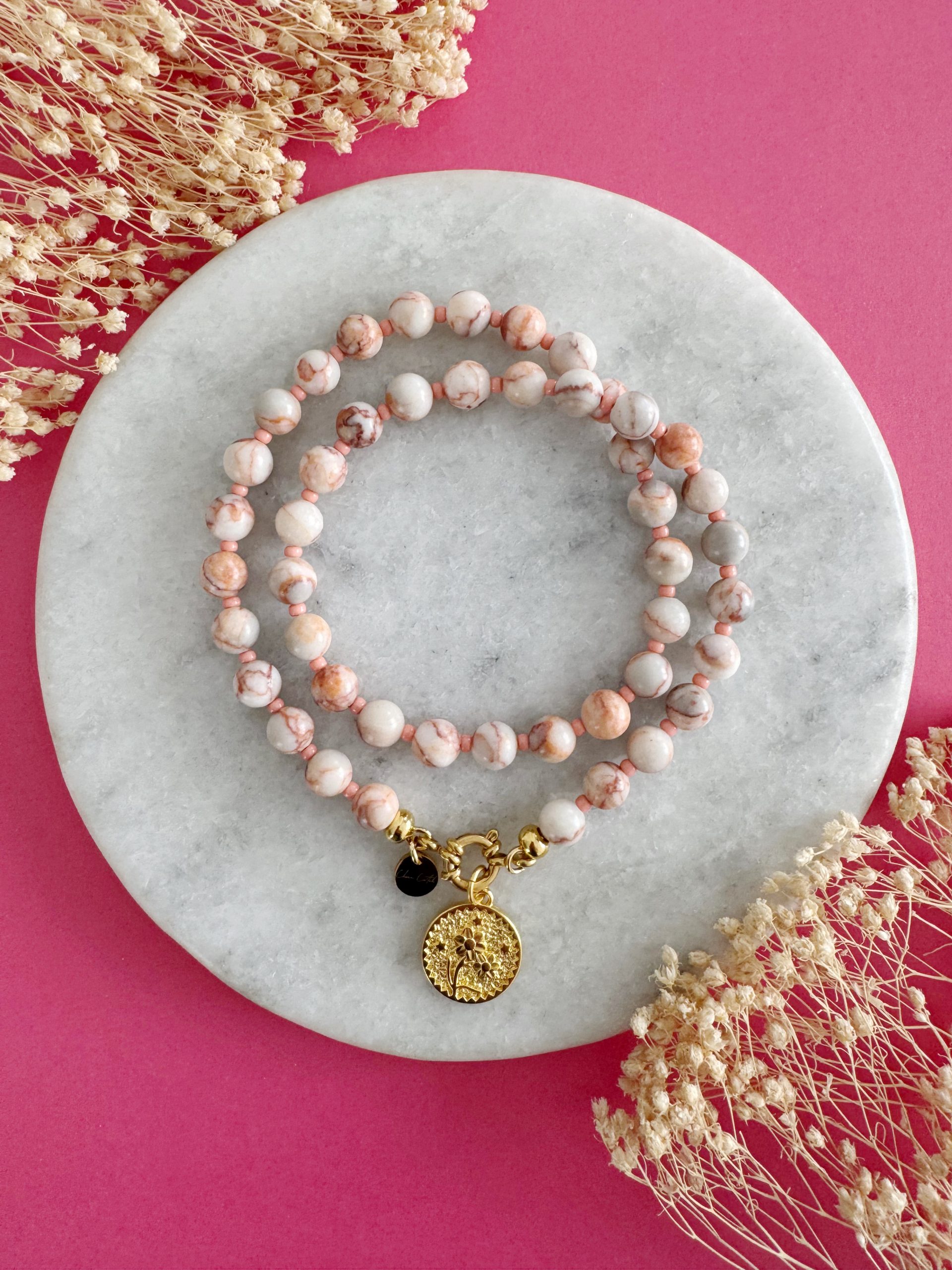 „The Happy Salmon“ ist das perfekte Accessoire für alle mutigen SchmuckträgerInnen. Die pastelligen Achat-Perlen schimmern in einem Lachs/Apricot,passend dazu werden sie unterbrochen von kleinen Miyuki-Perlen. Den Abschluss bildet ein wunderschöner Anhänger mit Blumen-Motiv.
