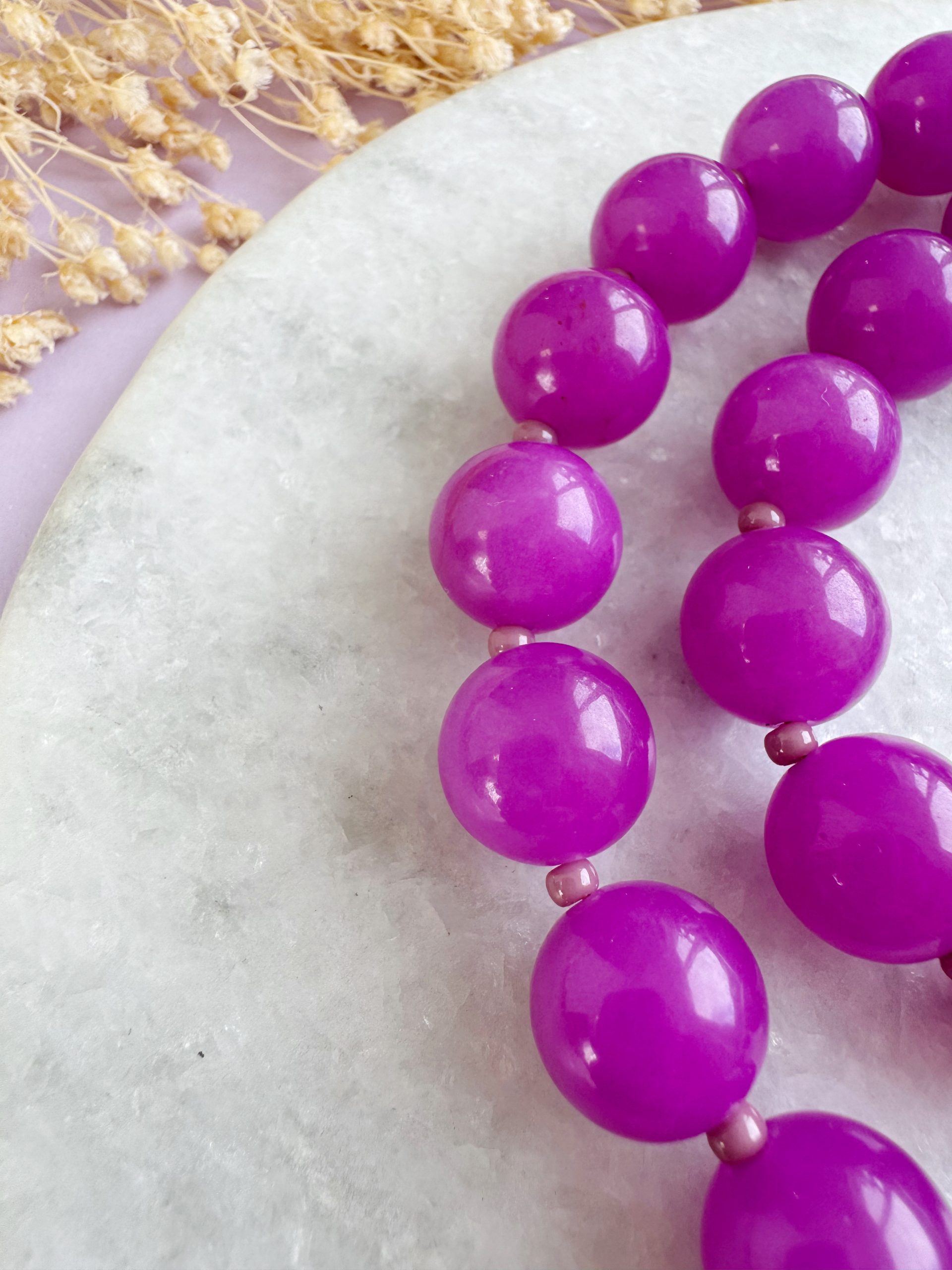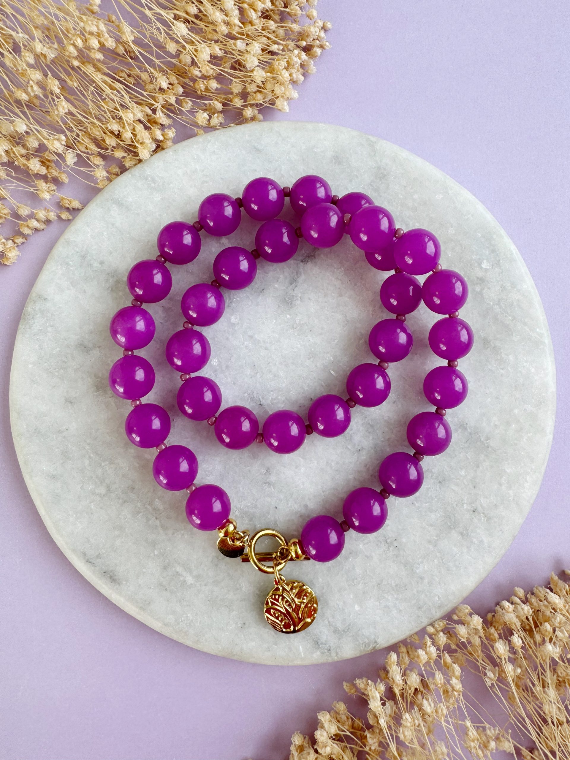 Der Herbst startet knallig! Passend dazu gibt sich „The Holi“ extra farbenprächtig mit lila-magenta Jade-Perlen. Kann auch perfekt kombiniert werden mit dezenteren Metallketten aus unserer Kollektion. Treib es bunt!