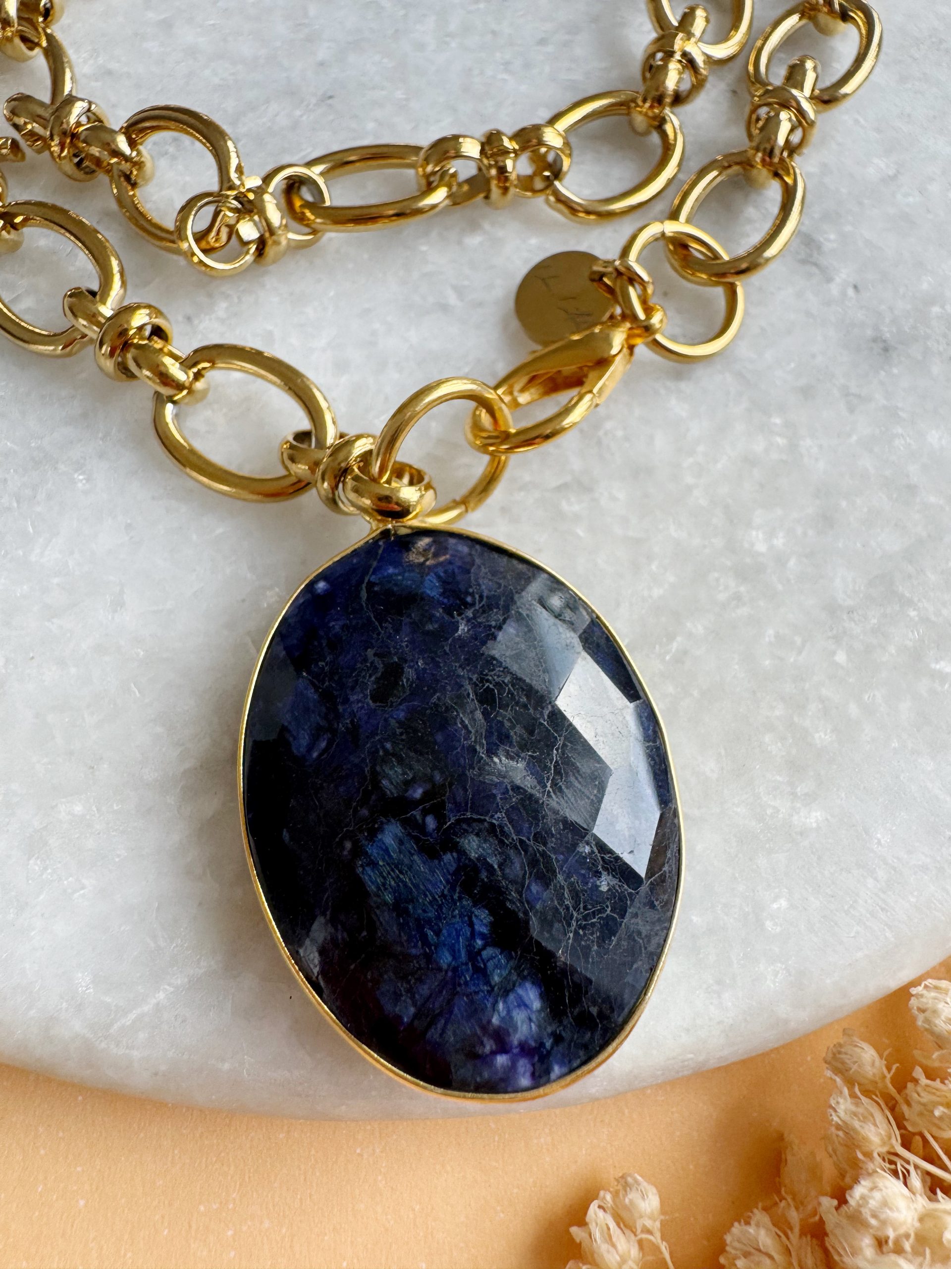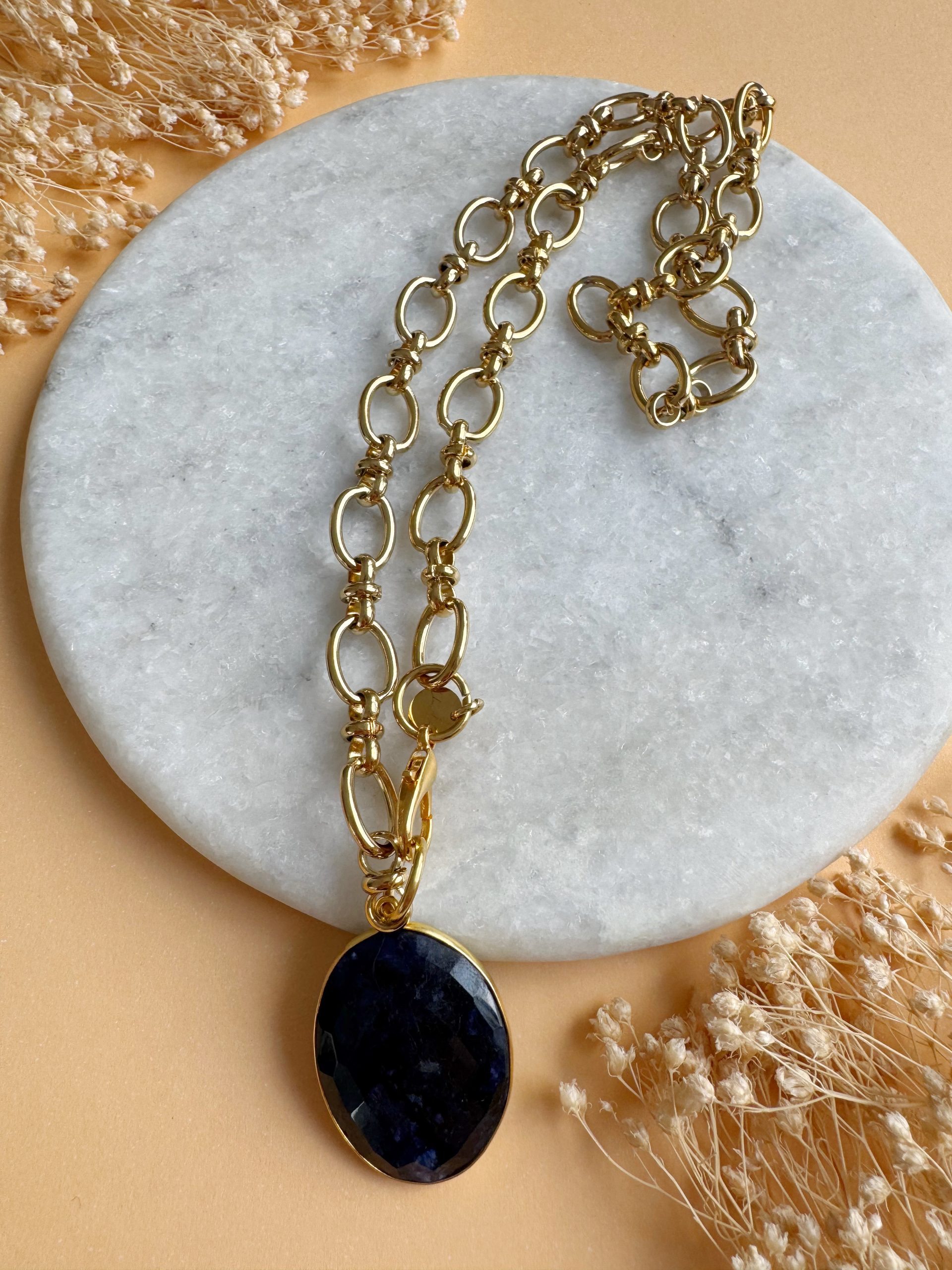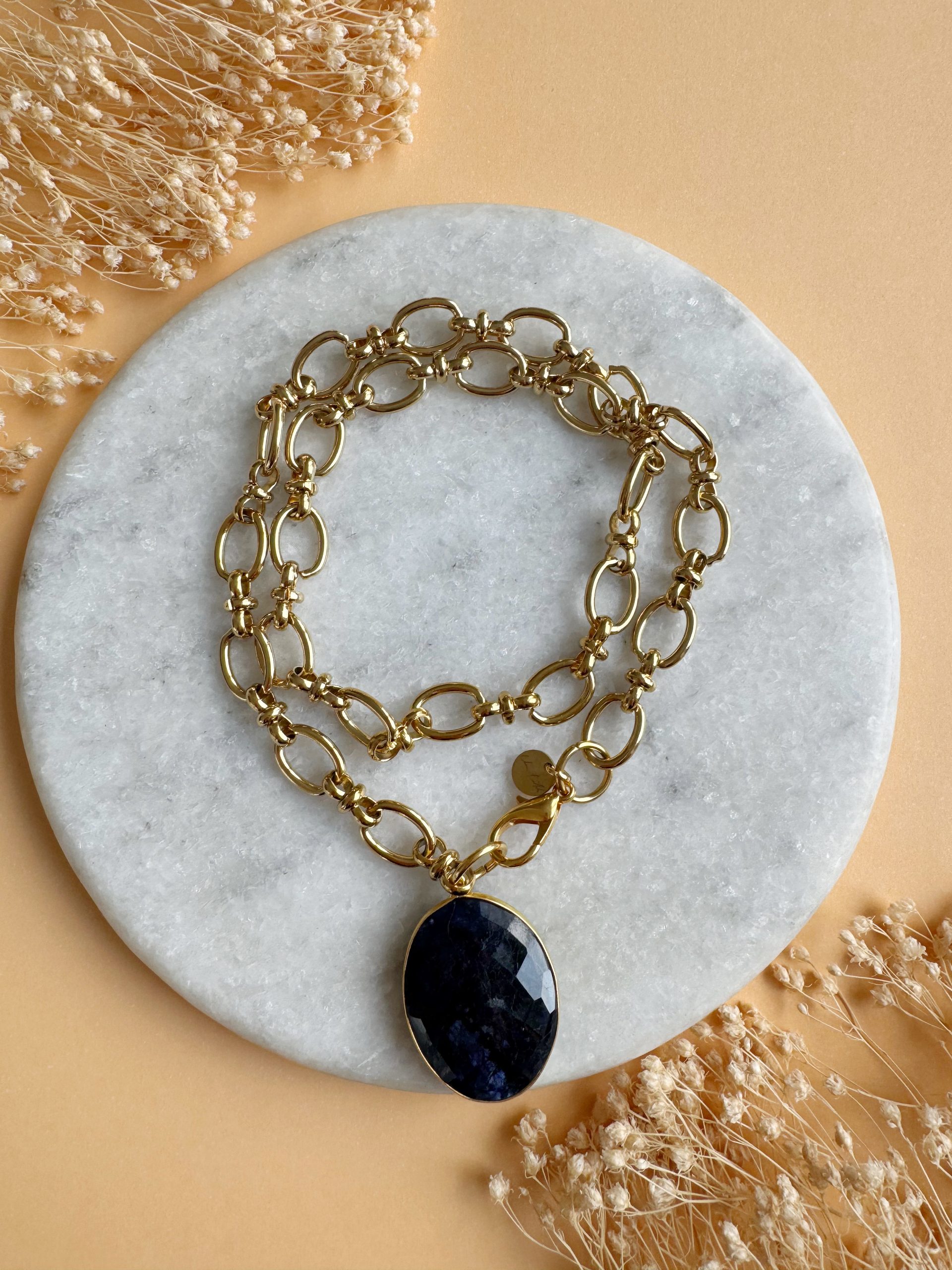 Schlichte Schönheit: Die goldigen Kettenglieder kommen mit einem auffällig großen tiefblauen Saphir Anhänger und schimmert zu jeder Tageszeit & jedem Outfit.