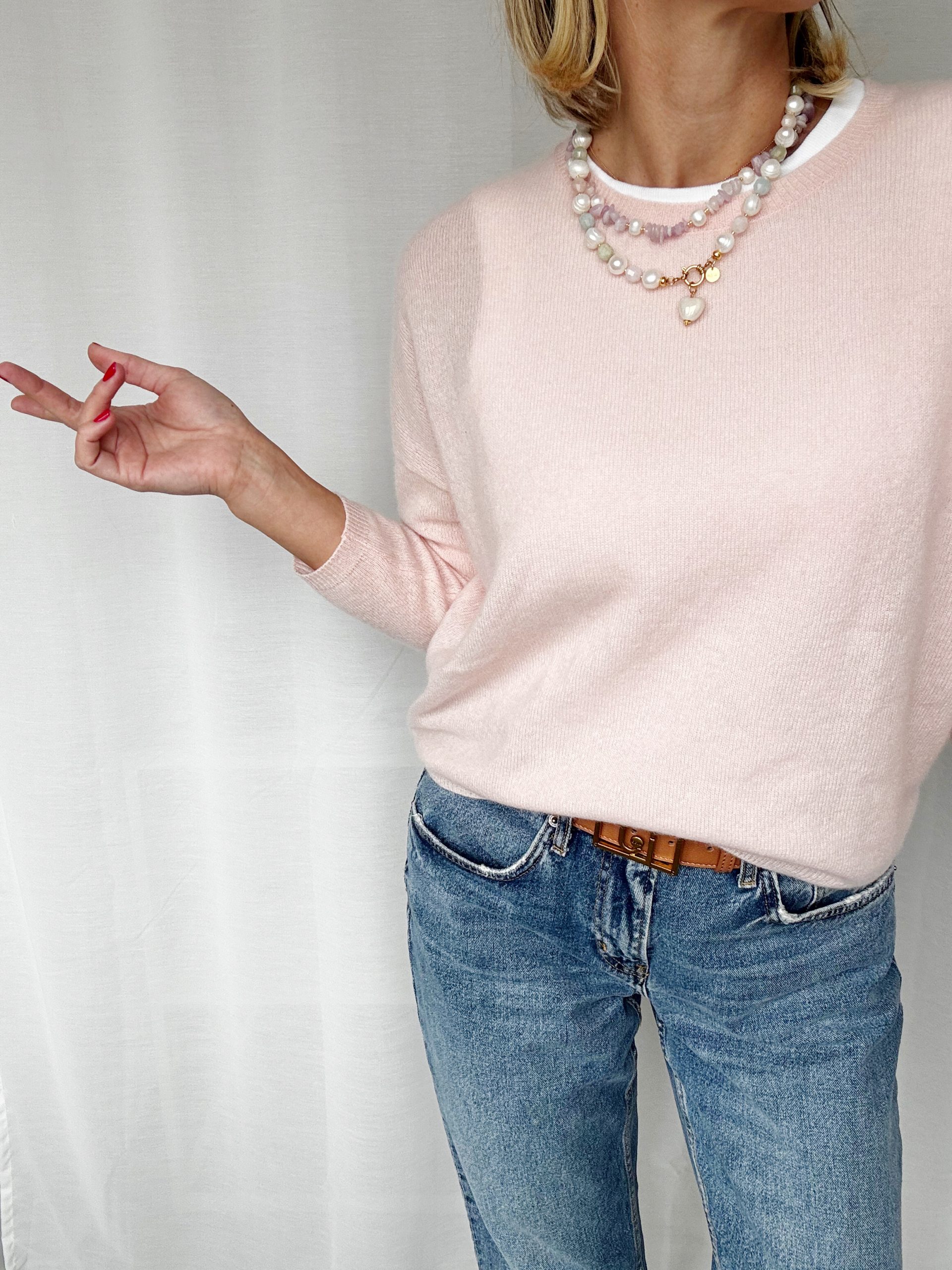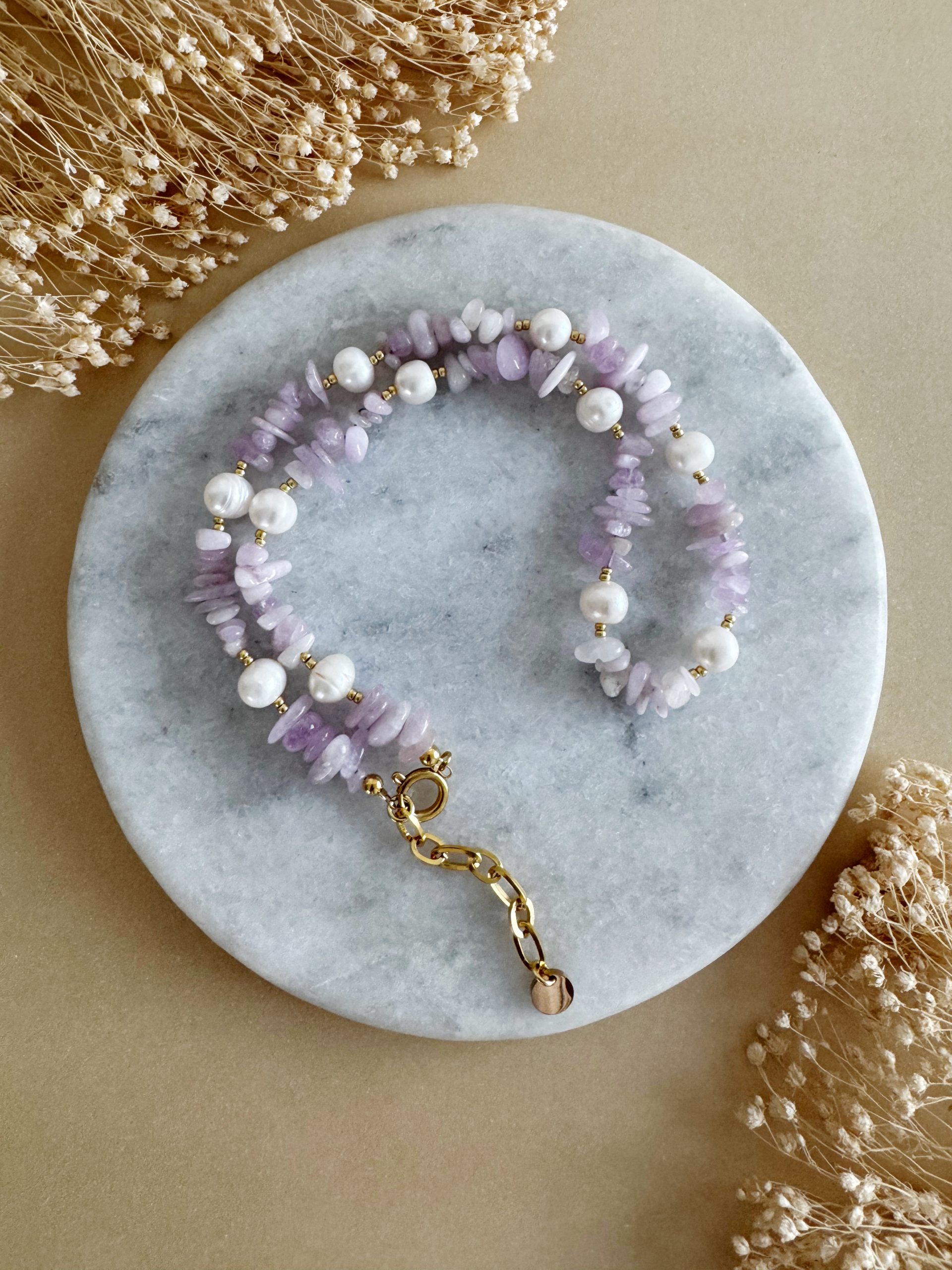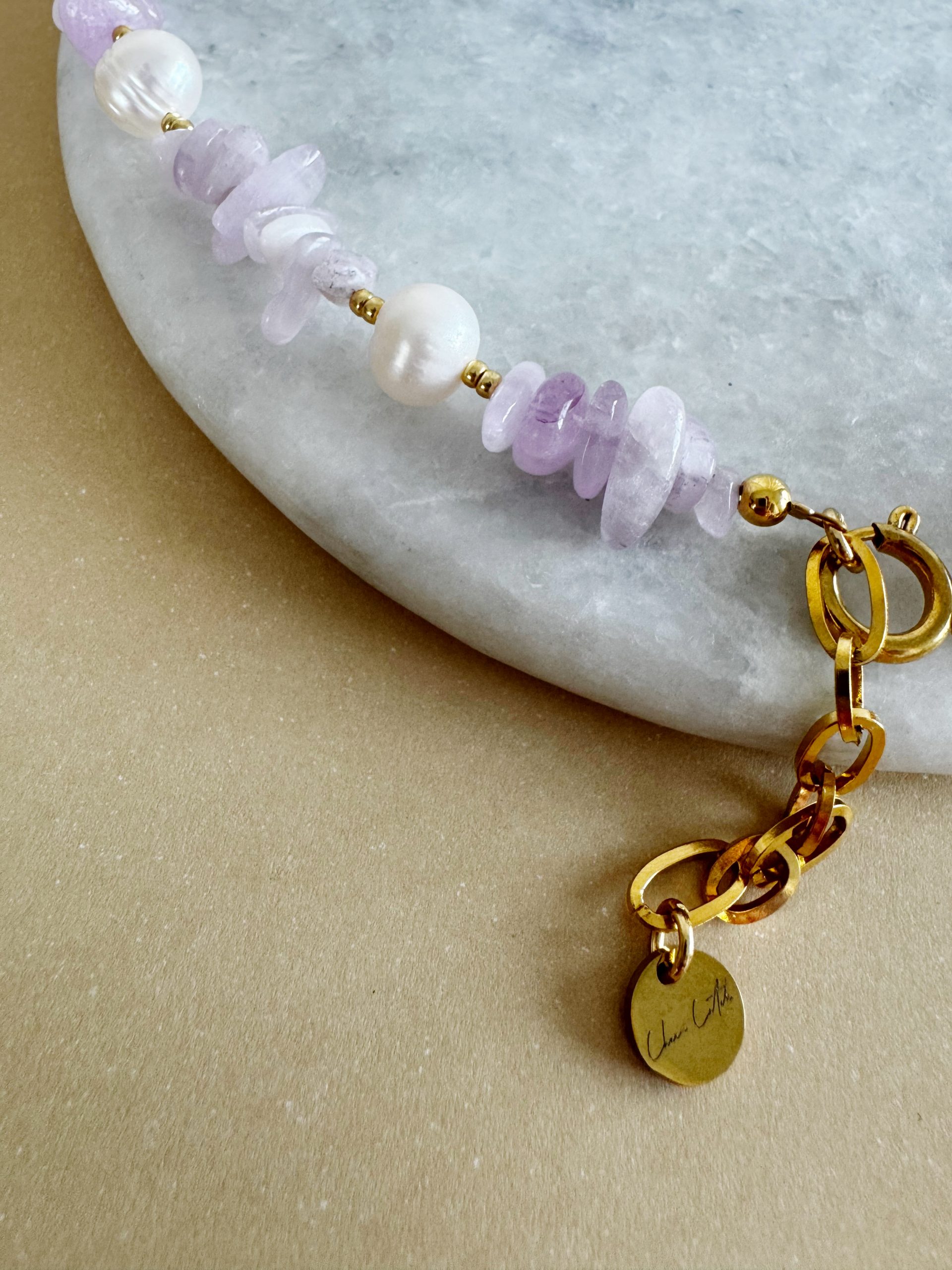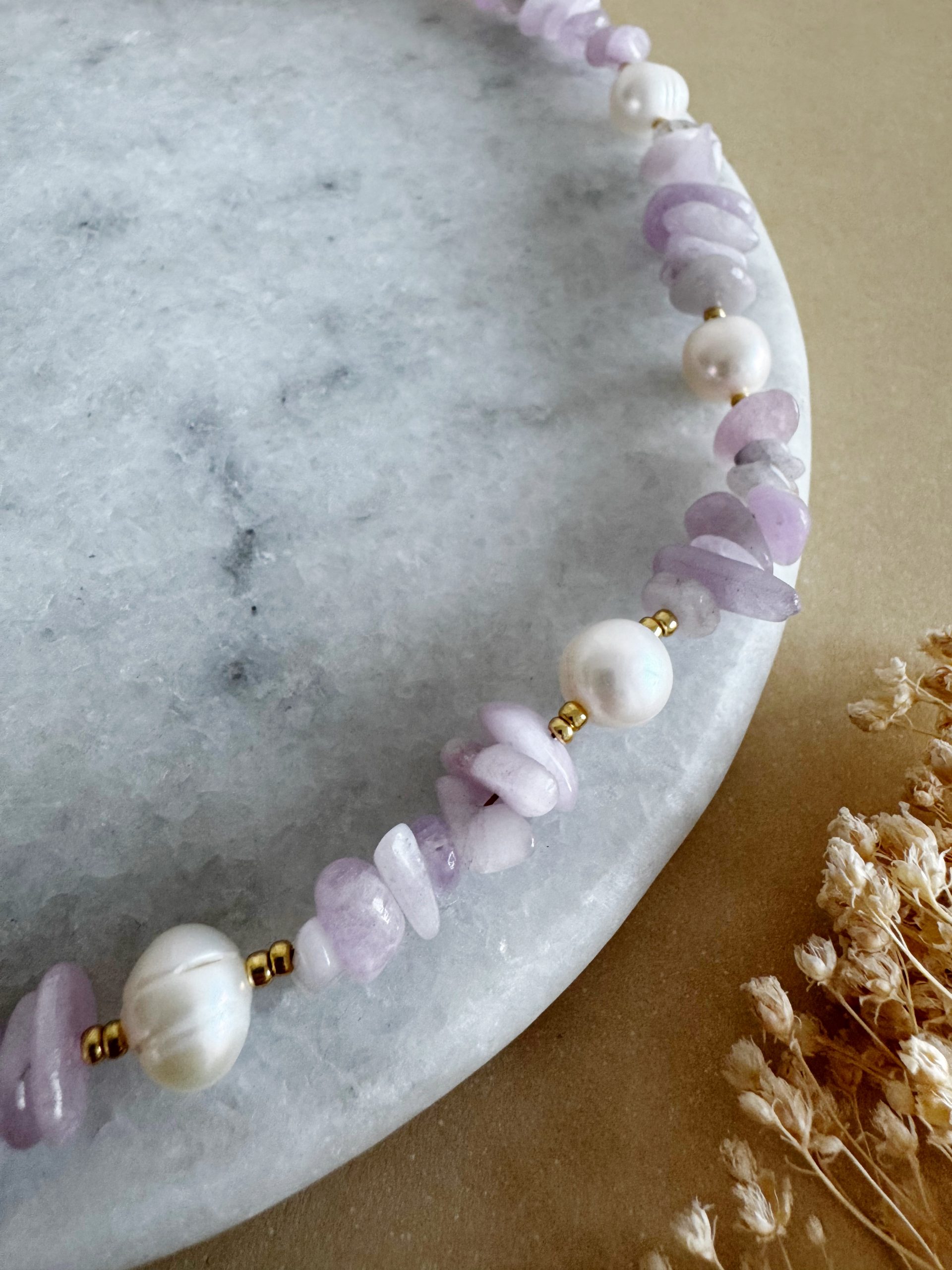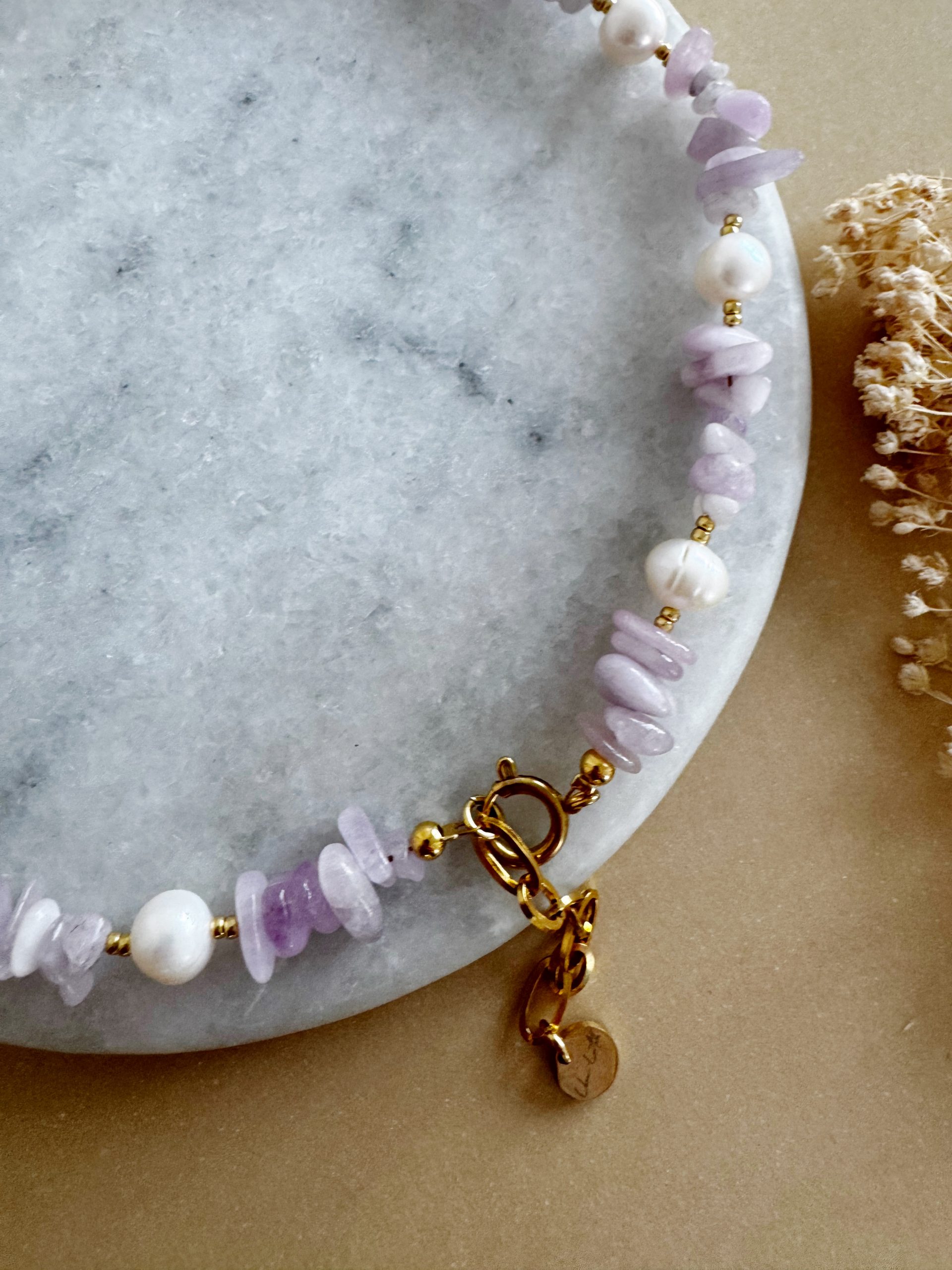 Zartes Flieder meets Süßwasserperle. Die schöne kette besteht aus einem trendeigen 50/50 Mix. Den Abschluss bildet ein Frontverschluss, der ebenso nach hinten getragen werden kann.