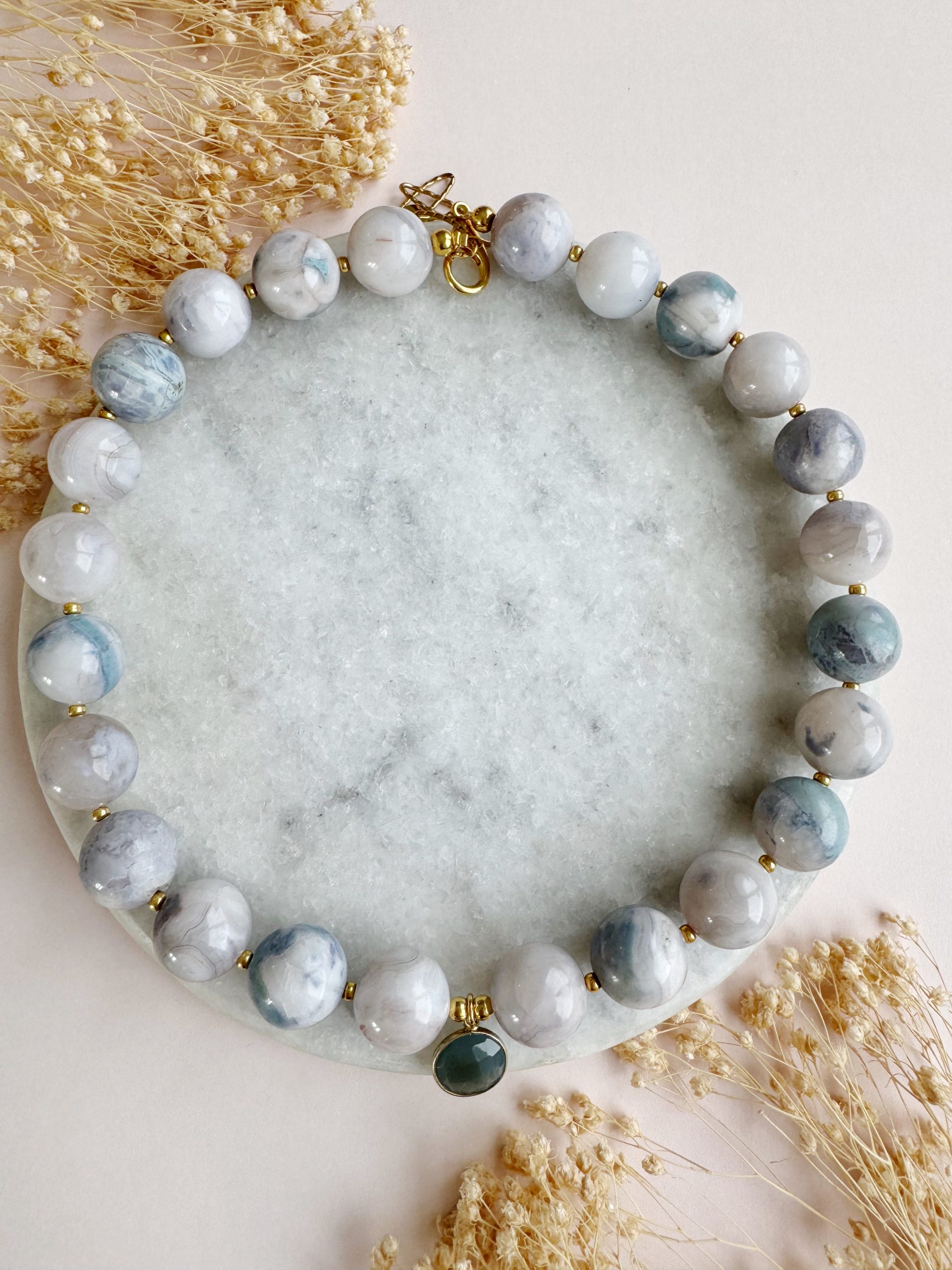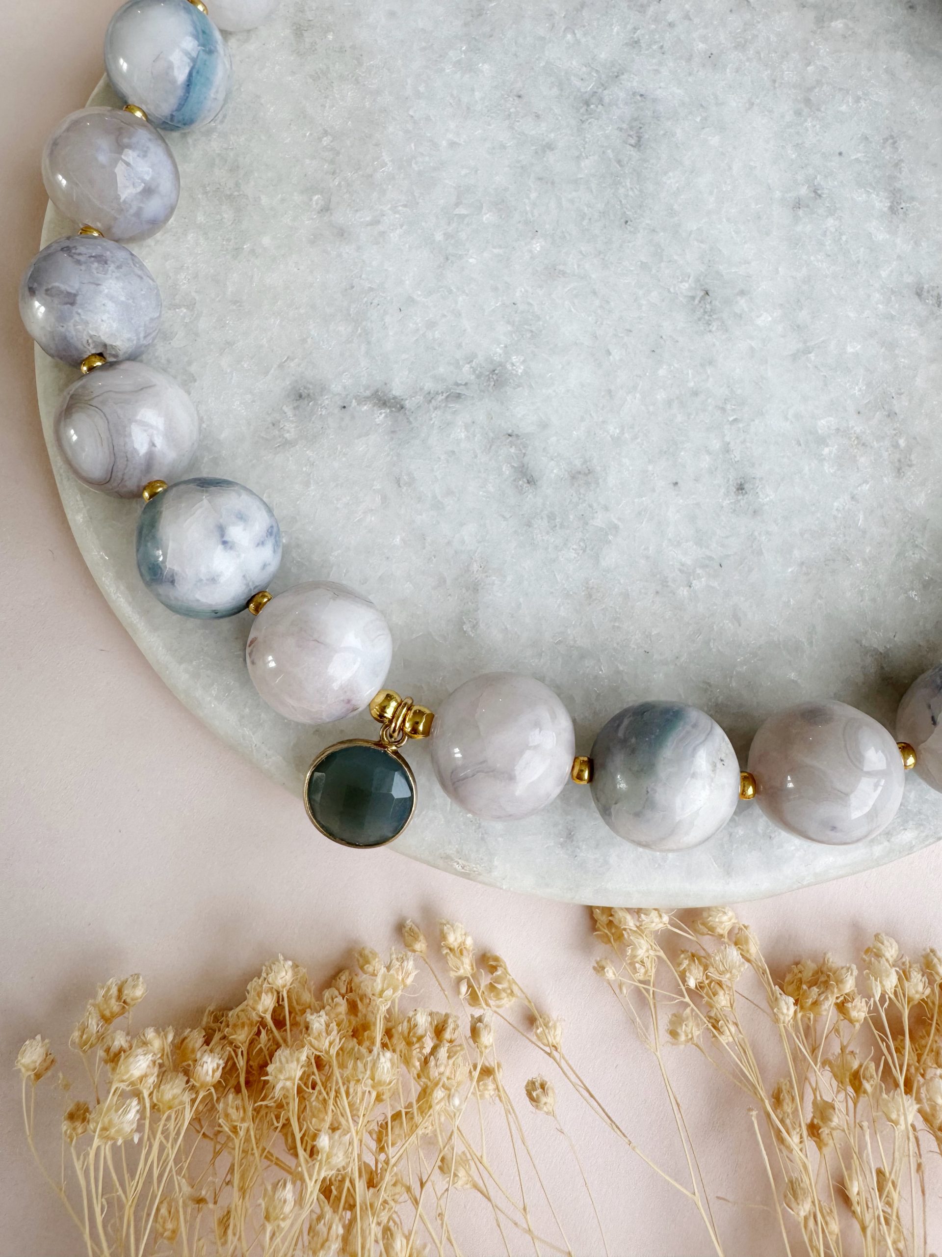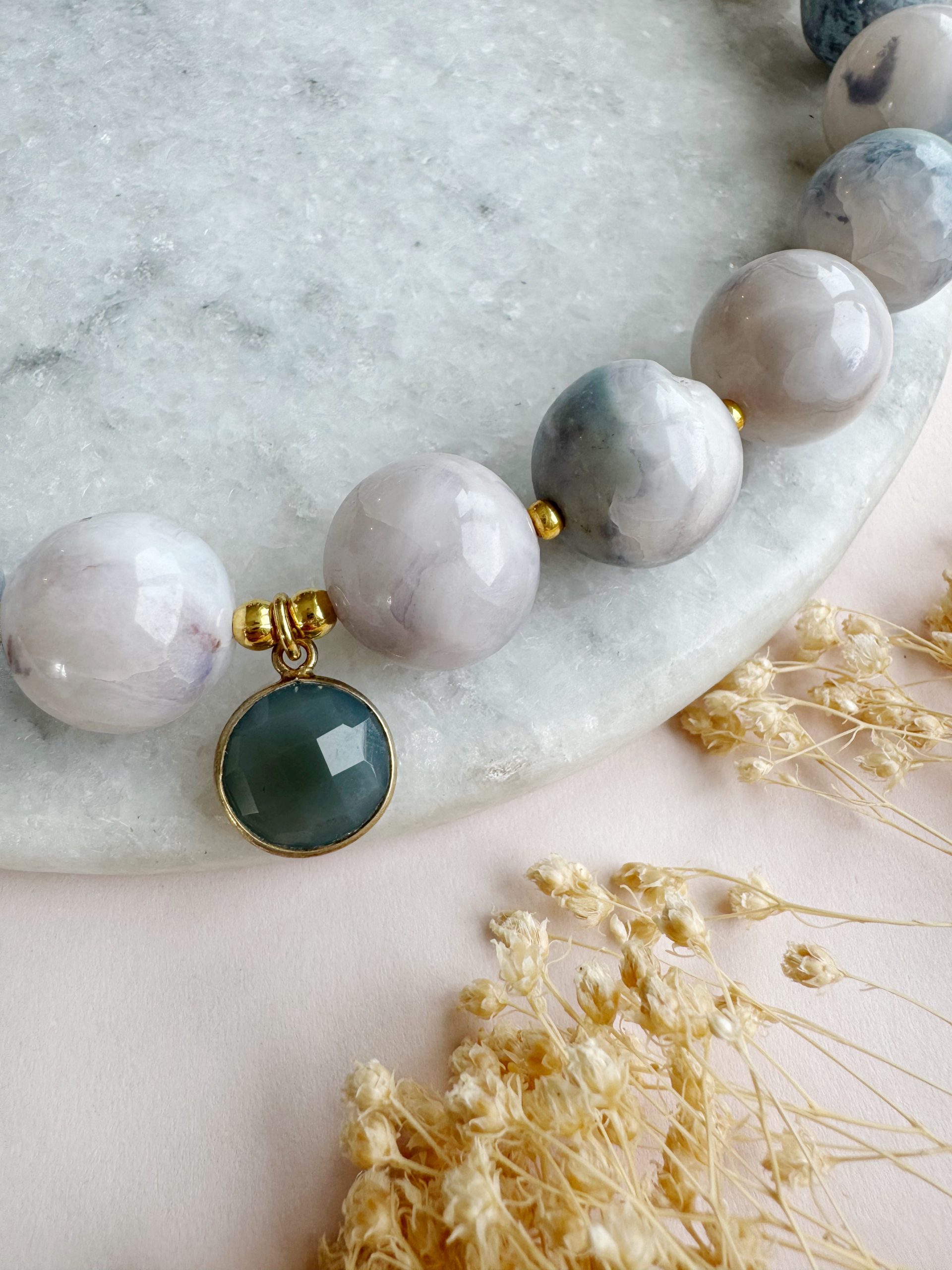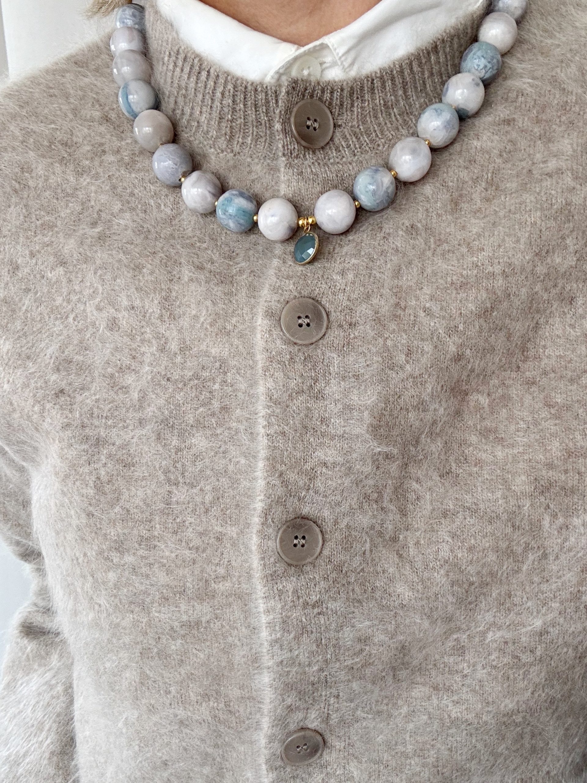 Dieser Herbst wird edel. Den Start macht „The Lovely“, eine Kette aus 16mm großen Quarz-Perlen kombiniert mit goldigen Details und einem markanten Verschluss, sowie einem Anhänger aus Chalcedon. Nur für mutige 😉