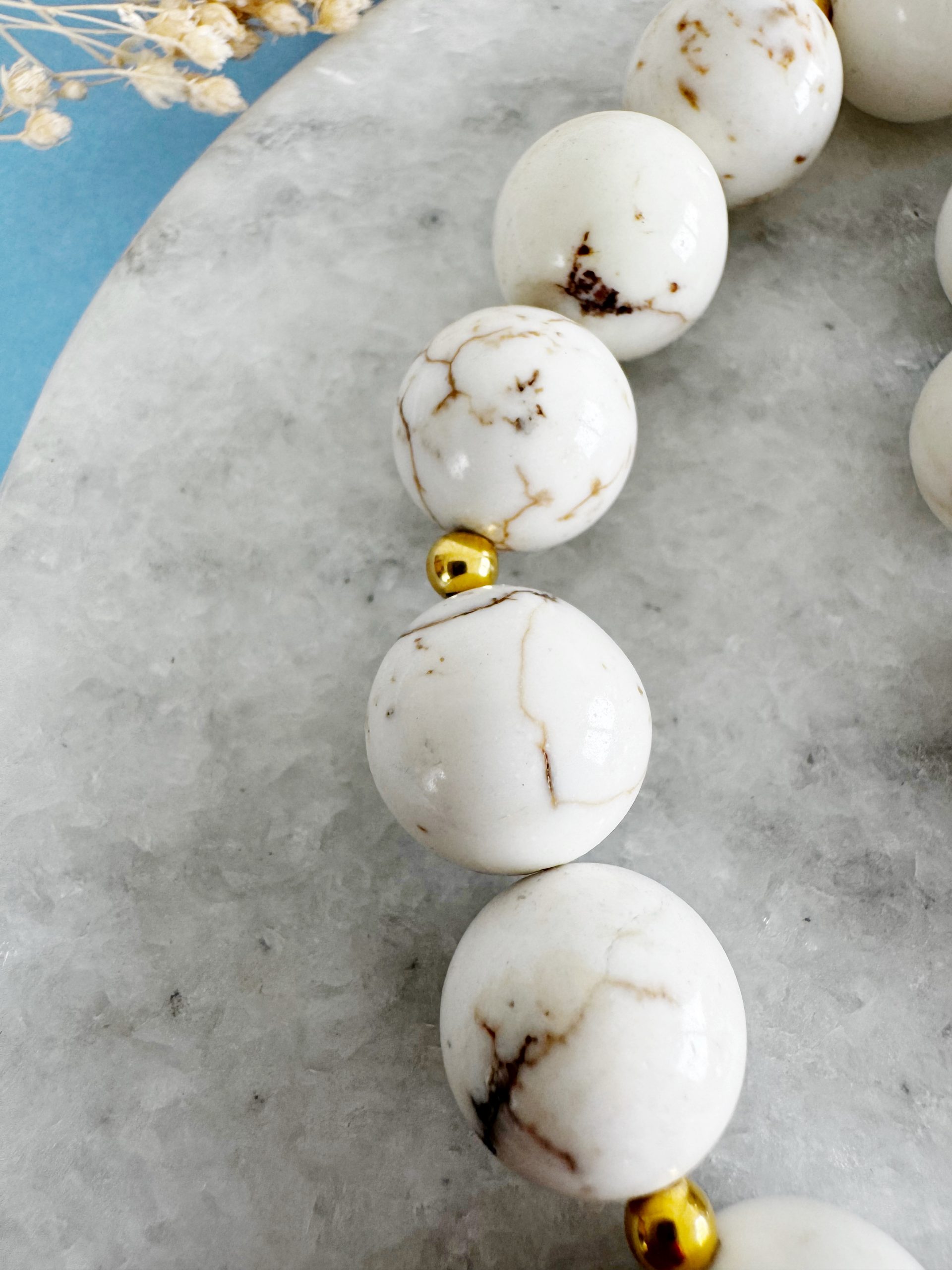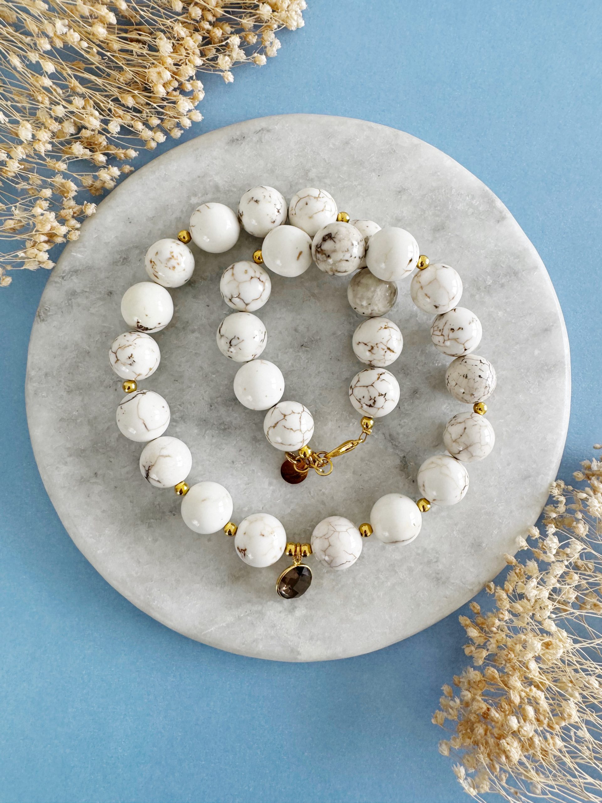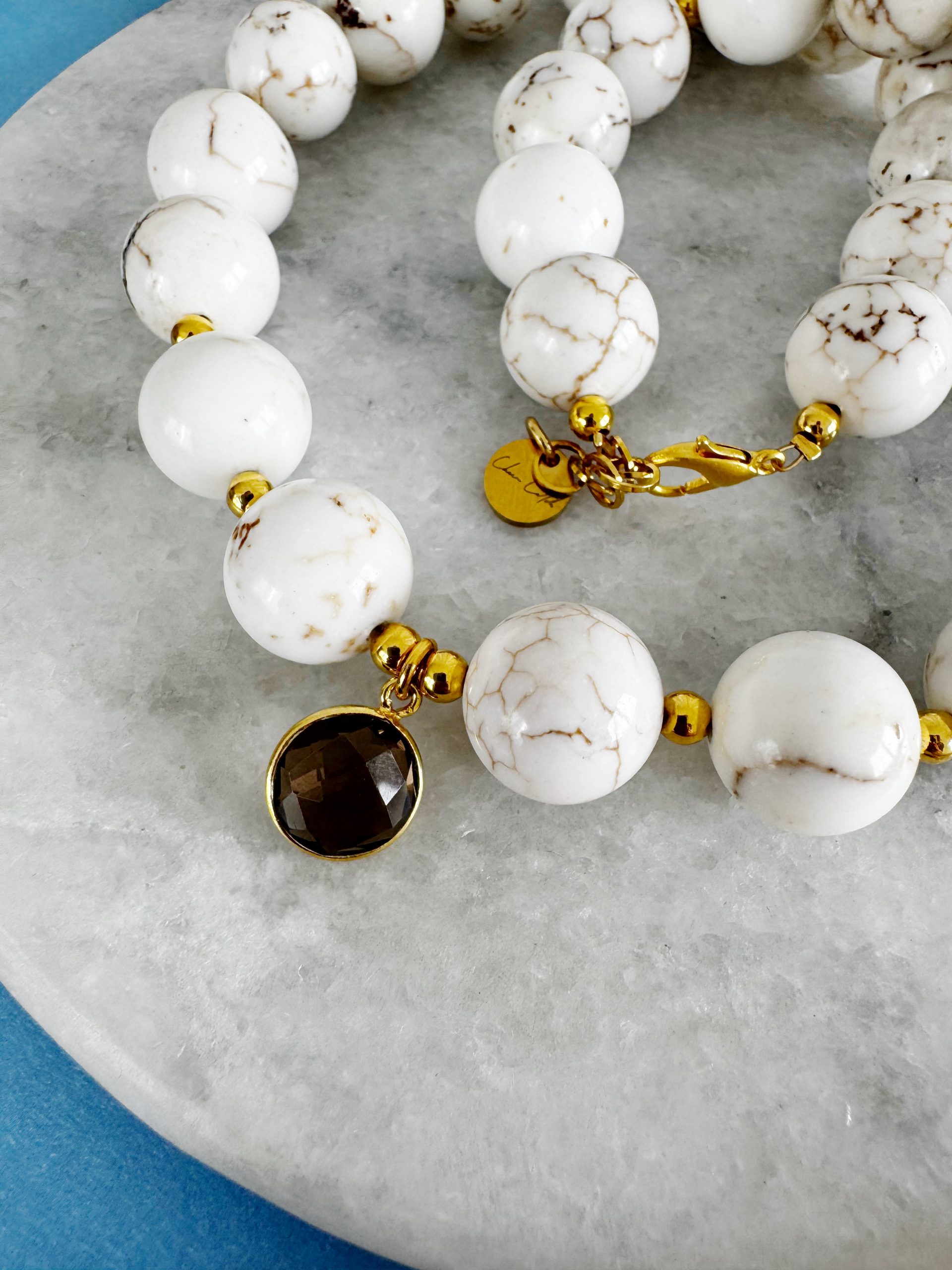Dieser Frühling wird edel. Den Start macht „The Lovely“, eine Kette aus 14mm großen Howlith-Perlen kombiniert mit goldigen Details und einem markanten Verschluss, sowie einem Anhänger aus Rauchquarz.