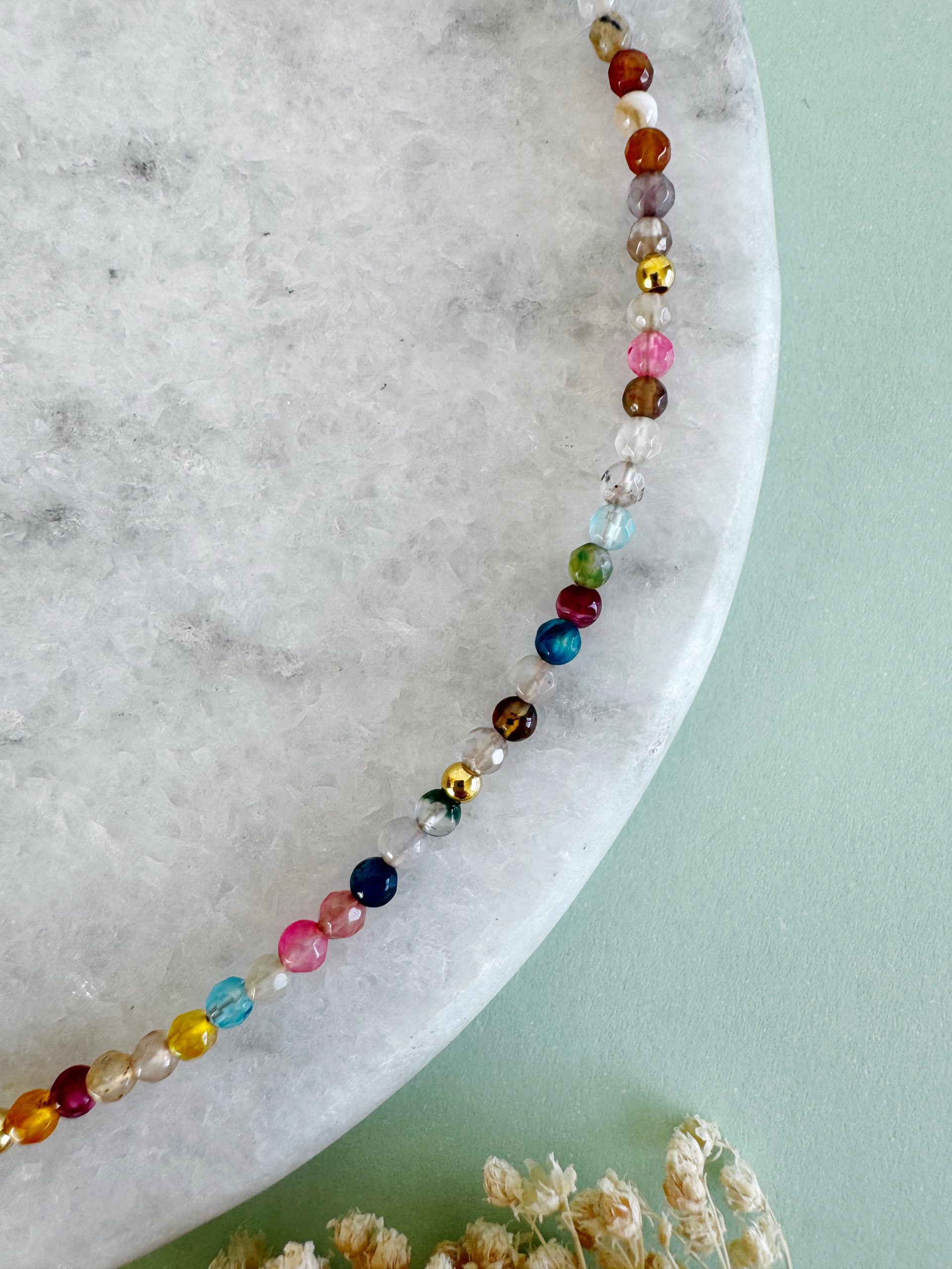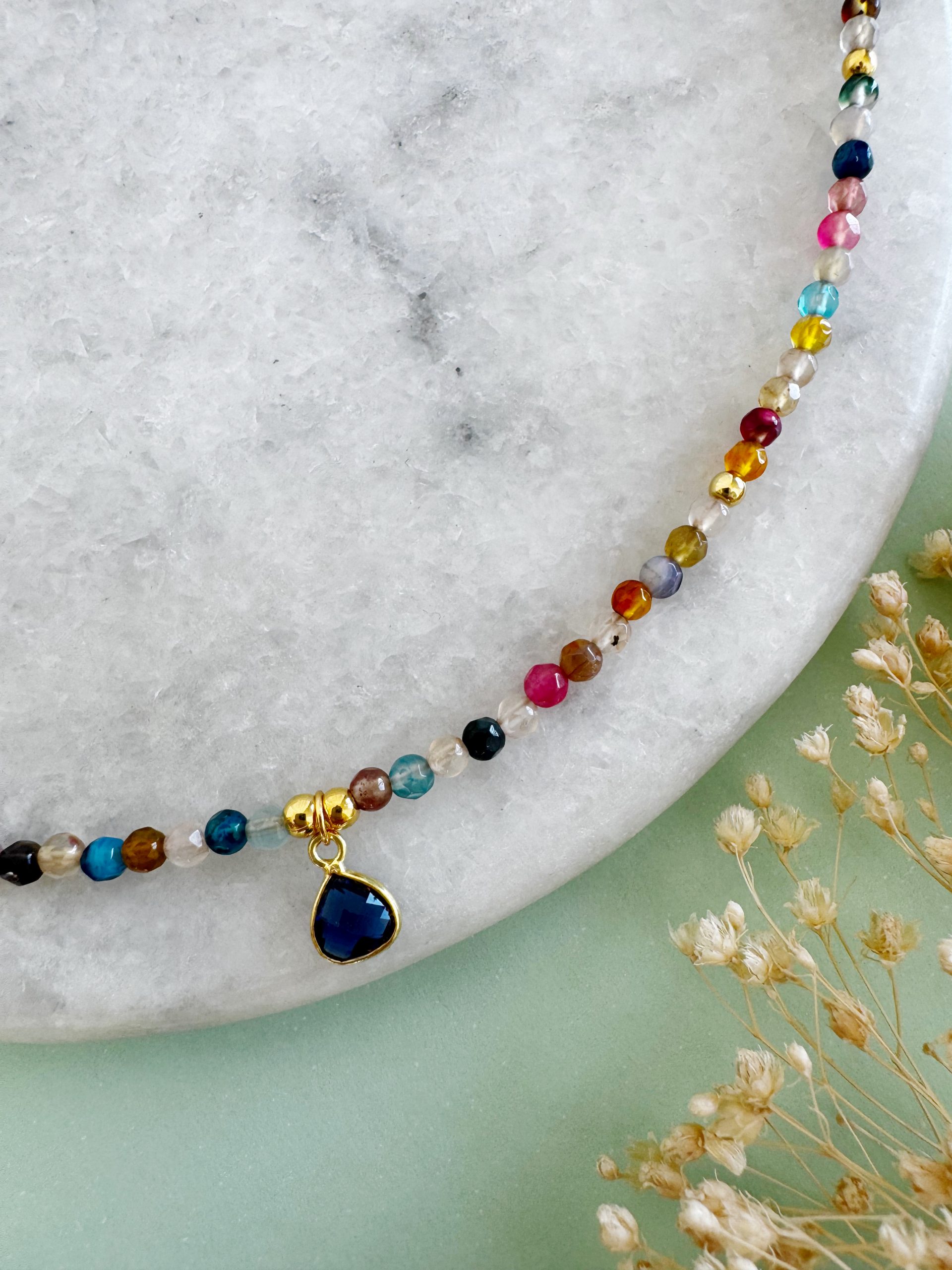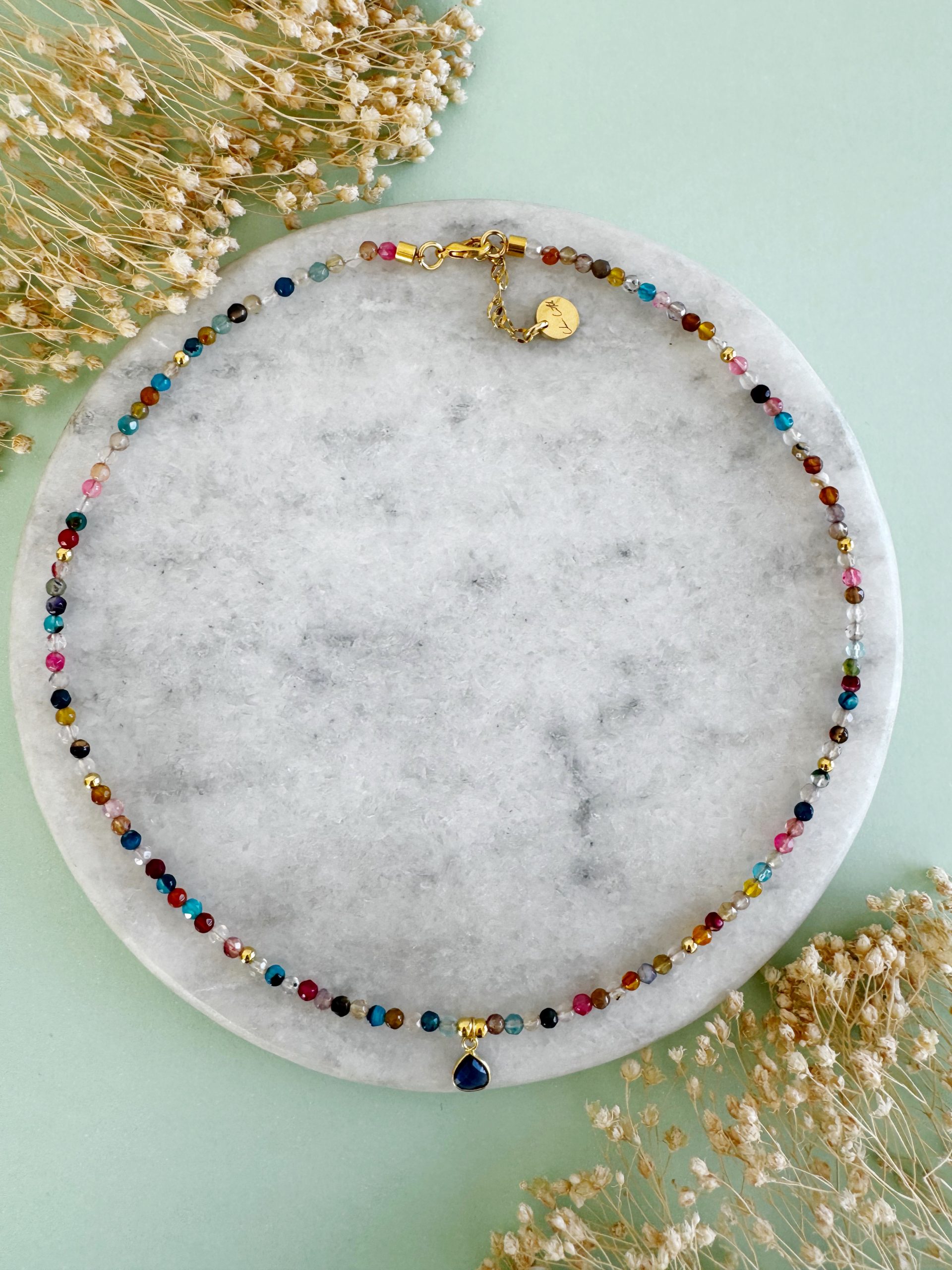 Die perfekte Mischung aus Moosgrün, Rot, Beige, Gelb, Pink, Blau und Orangerot hat „The Maple Rainbow“ im Gepäck. Die facettierten Feuerachat-Steine werden ergänzt durch goldene Details, sowie einen kleinen farblich passenden Anhänger aus Safir.