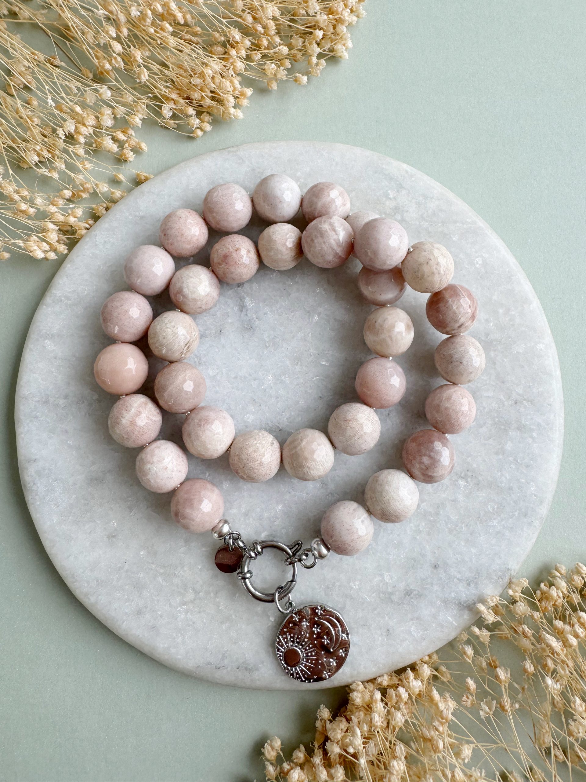 Diese pastellige Kette aus extra großen Mondstein-Perlen ziert ein besonders auffälliger Anhänger aus rostfreiem Edelstahl.