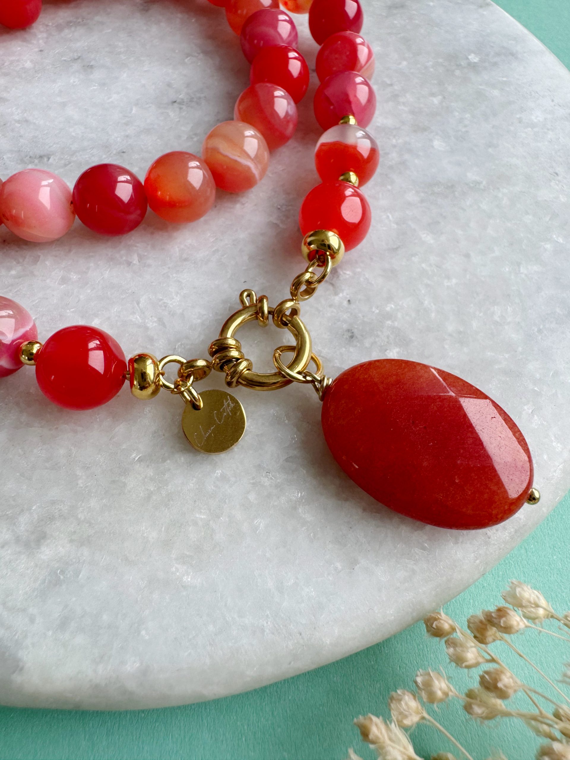 Wir lieben Rosa: „The Raspberry“ bringt das schönste dieser Farbe hervor. Diese wunderschöne Kette aus Achat kommt mit goldigen Details, einem auffälligen Verschluss und einem passenden Anhänger aus Jade.