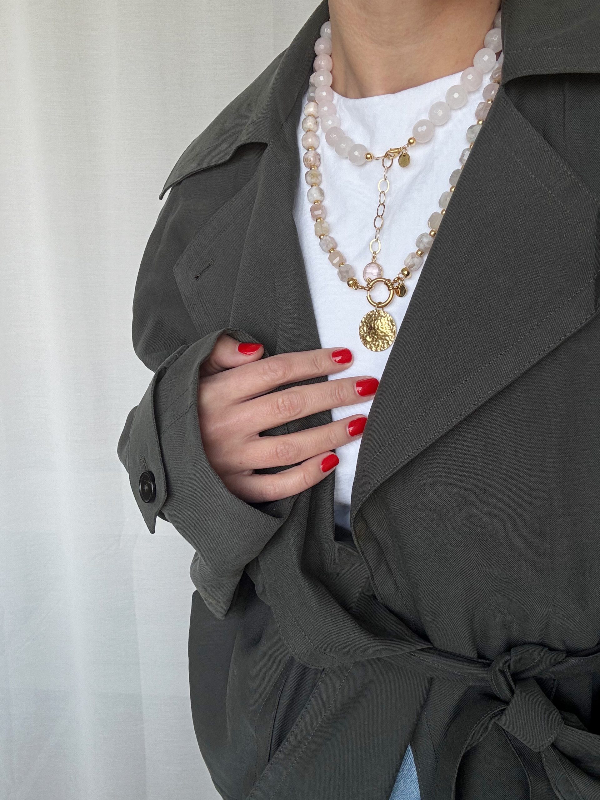 Unendlich rosig & pastellig: „The Rosy“ sind Würfel aus Porzellan-Jaspis. Die Farben der kleinen Steine wechseln von Rosé, zu Beige, über Creme bis zu Transparent. Der außergewöhnliche Stein wird ergänzt von goldigen Details. Den Abschluss bildet ein kleines Plättchen.