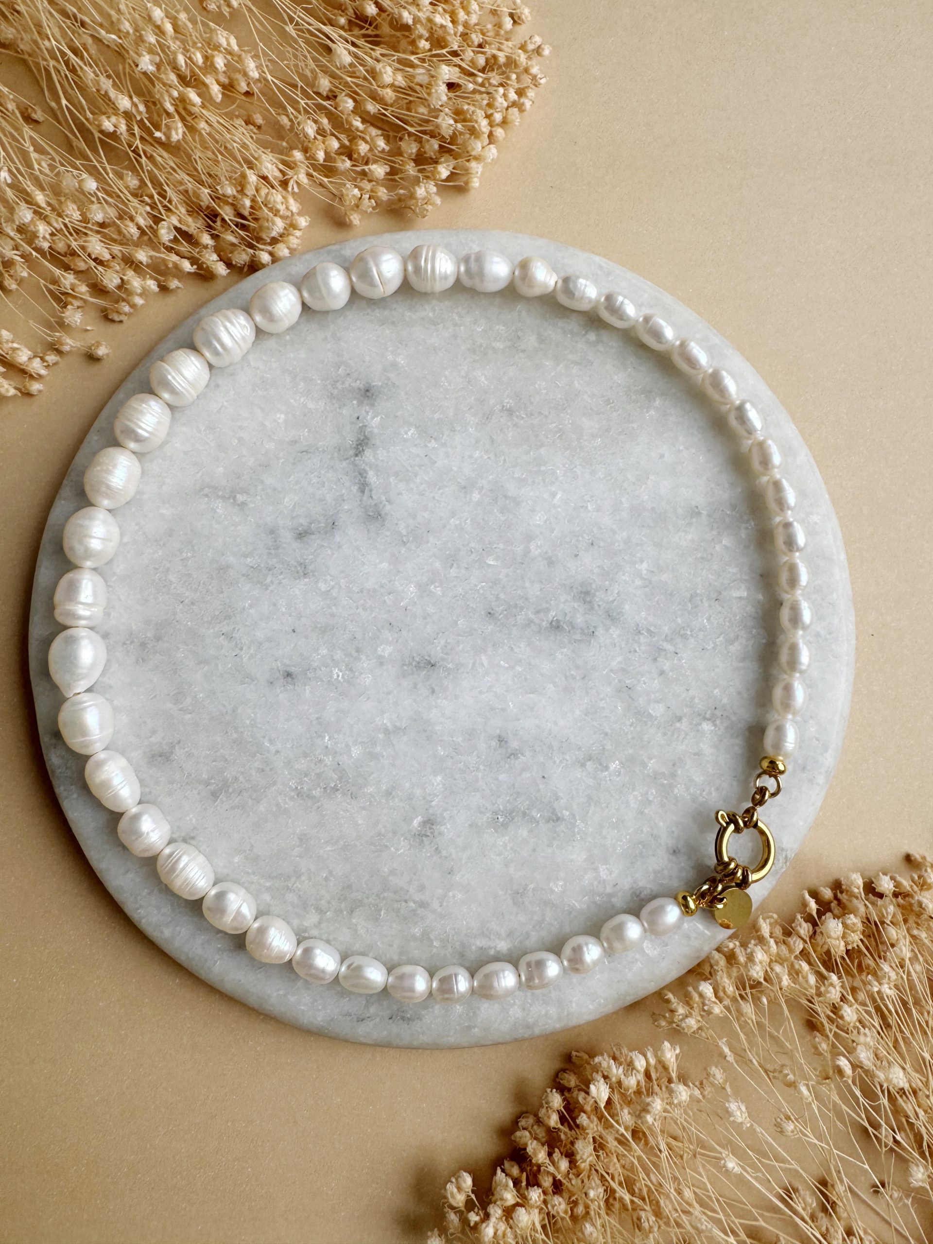 „The Shell“ ist mit ihren unterschiedlich großen, zeitlosen Süßwasserperlen ein absoluter Schmuck-Klassiker – im Sommer ebenso wie zu jeder anderen Jahreszeit. Die edel schimmernde Oberfläche und der markante Frontverschluss aus rostfreiem Edelstahl (vergoldet) veredeln jedes Outfit.