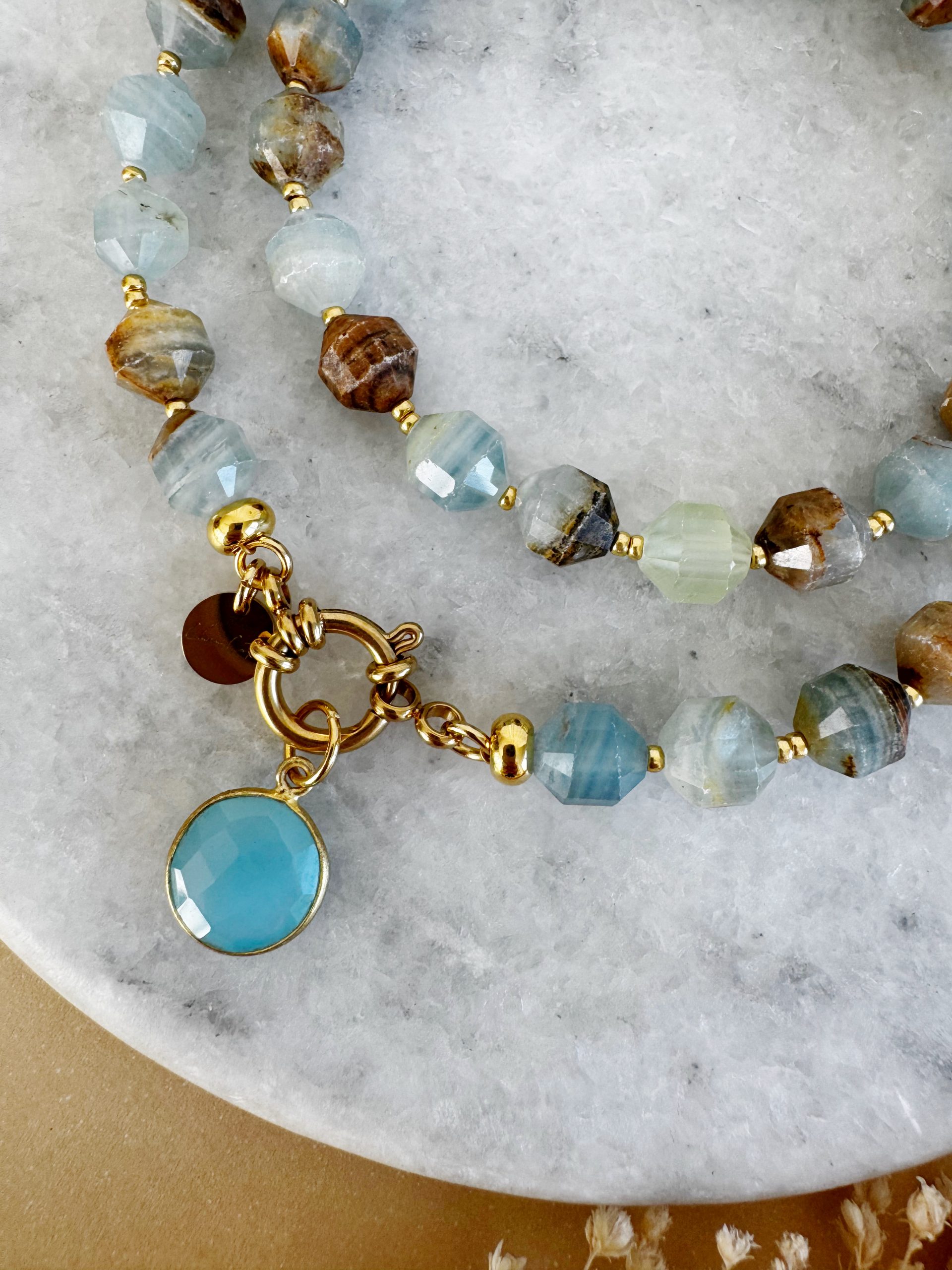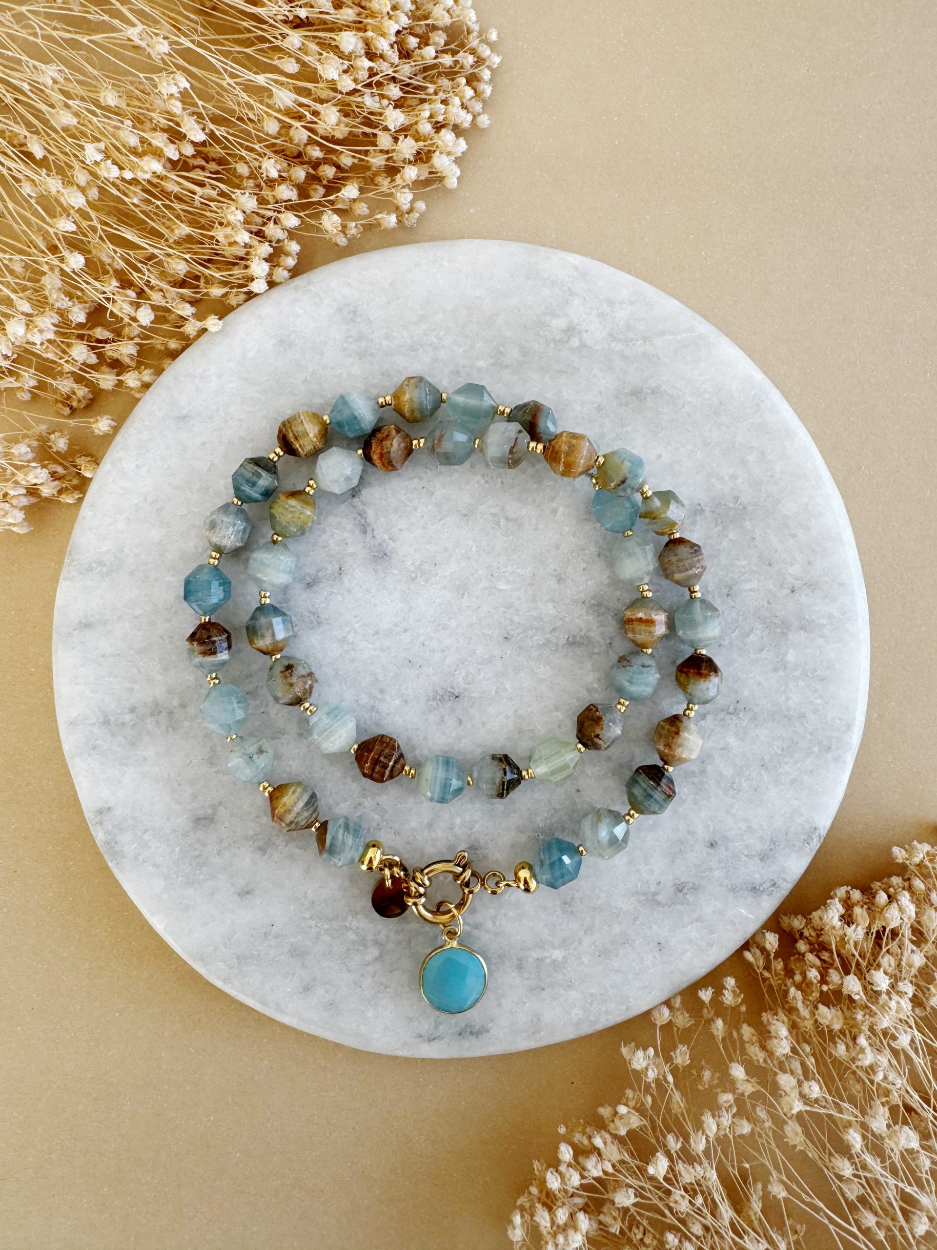 Larimar beruhigt, lindert Stress und fördert innere Klarheit. Er passt besonders zu Wassermann und Fischen, da er ihre Intuition stärkt und Harmonie schenkt.