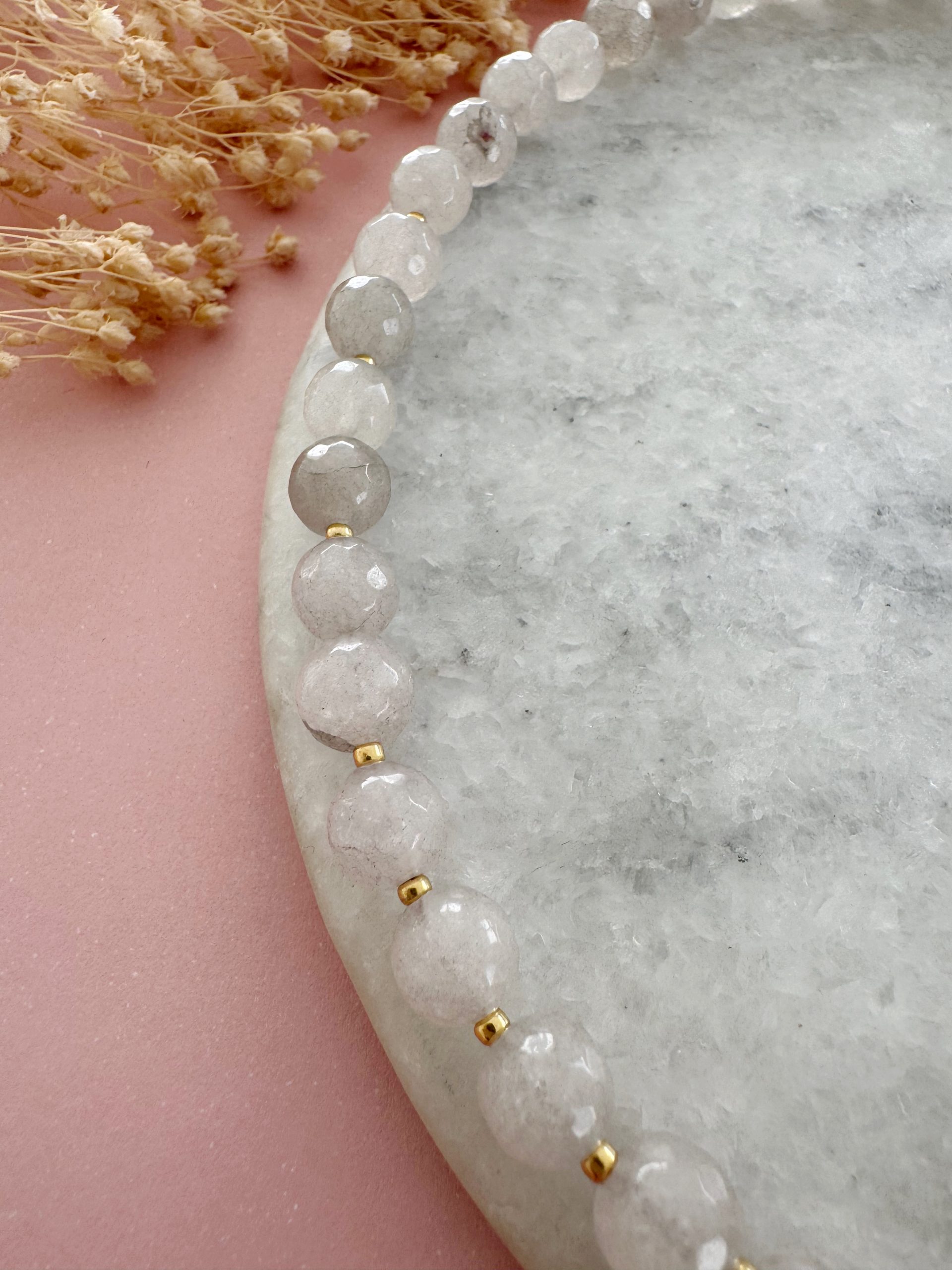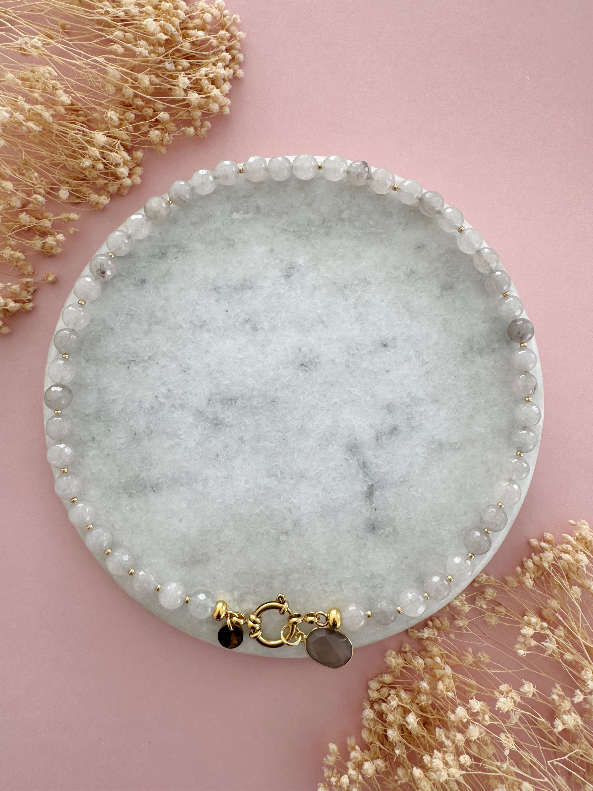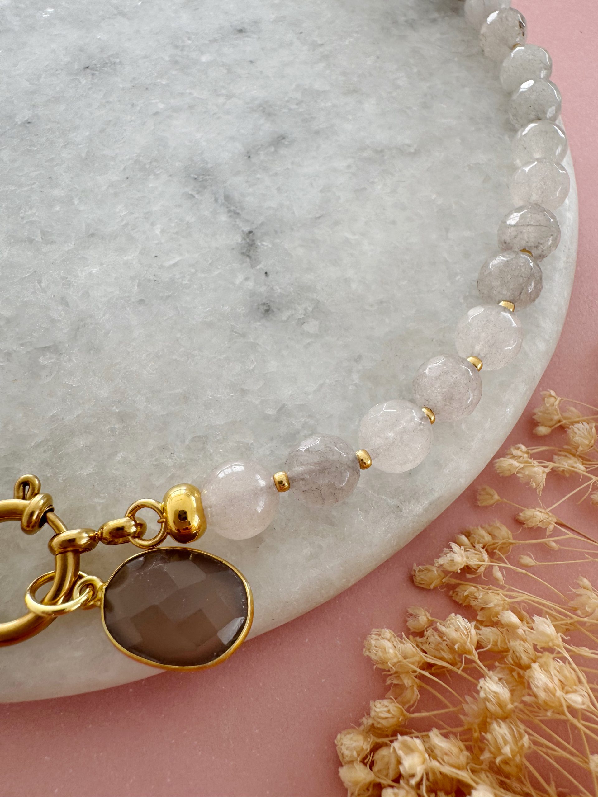 „The Thunder“ kombiniert graue Jade-Perlen mit goldigen Details und einem Anhänger aus grauen Achat.